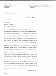 You perhaps noticed in the las t number of The Survey the first of a series of articles on Interstate Competition, which we are carrying on. I am enclosing a copy of a letter from Mrs. Kelley which has been slightly worked over into the form of an article and will be published either this week or next. It seems to me we are somewhat confused on the question. We have been decrying the existence of different standards of labor legislation between the states [illegible] statement in Mrs. Kelley's article and in all others tends to show that different standards do not cause a removal of industries. The important question then is -- what is the evil effect of the different standards in different states? Will you not be kind enough to write an article for The Survey on the subject, making it as long or as short as you wish? I believe there is no one who can bring this situation out as well as yourself and we shall be very grateful indeed if you can do this for us. We would like to have it come out in The Survey within the next two or three weeks.