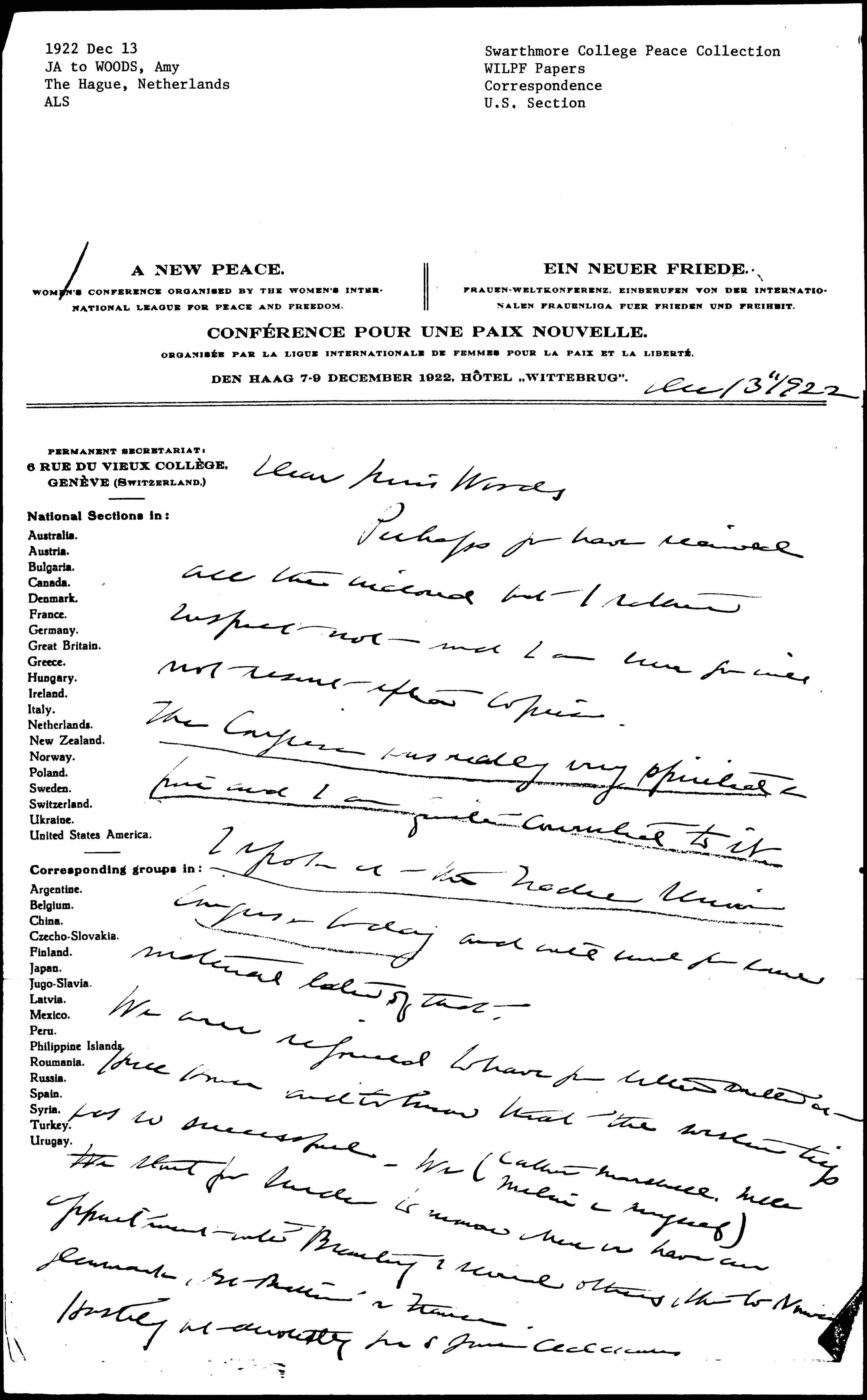We were rejoiced to have your letter written at Hull House and to know that the western trip was so successful. We (Catherine Marshall, Mlle. Mélin & myself) We start for Sweden tomorrow where we have an appointment with Branting & several others, then to Norway, Denmark, Gt Britain & France.
