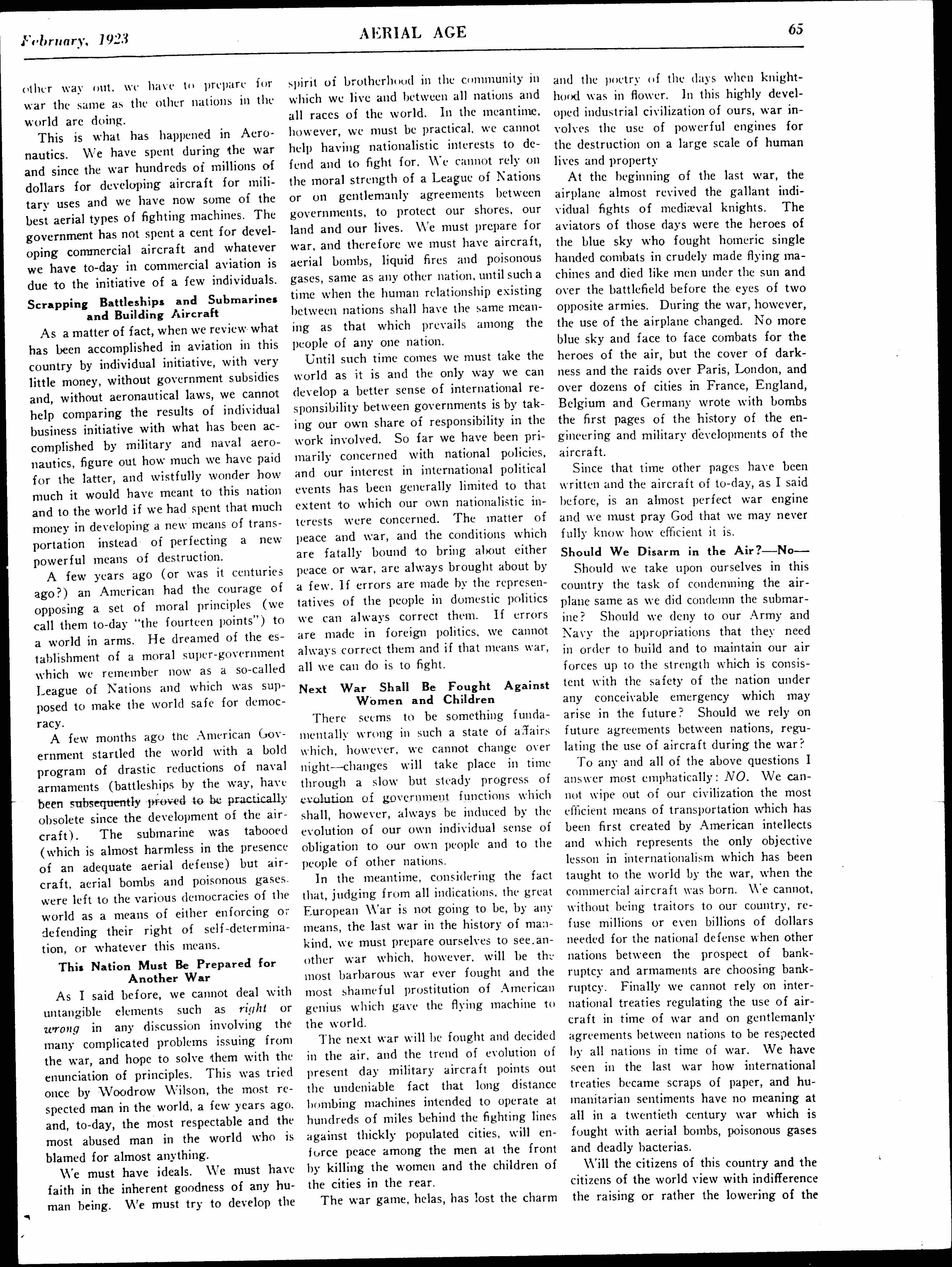 Will the citizens of this country and the citizens of the world view with indifference the raising or rather the lowering of the [page 3] aircraft, from the ranks of a most wonderful potential carrier of the commerce of the world, into the ranks of the most powerful destructive machine far exceeding the power of guns, battleships and submarines? I hope not.
