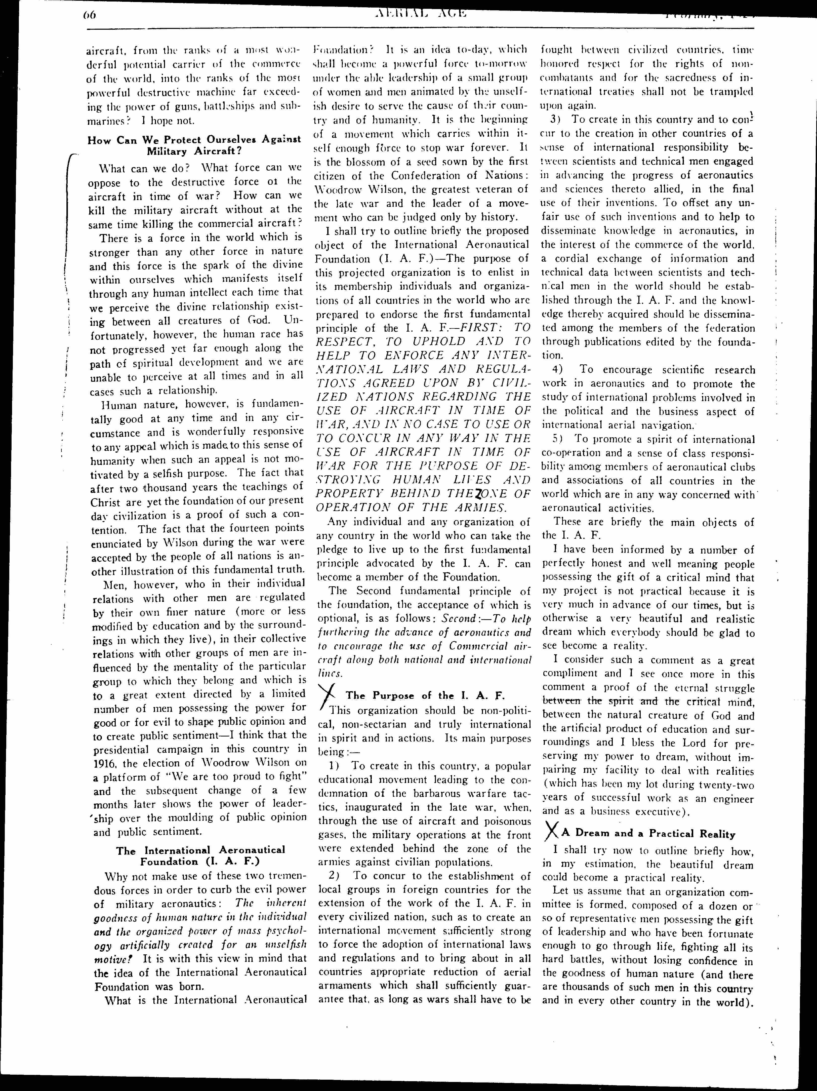 What is the International Aeronautical Foundation? It is an idea [today], which shall become a powerful force [tomorrow] under the able leadership of a small group of women and men animated by the unselfish desire to serve the cause of their country and of humanity. It is the beginning of a movement which carries within itself enough force to stop war forever. It is the blossom of a seed sown by the first citizen of the Confederation of Nations: Woodrow Wilson, the greatest veteran of the late war and the leader of a movement who can be judged only by history.