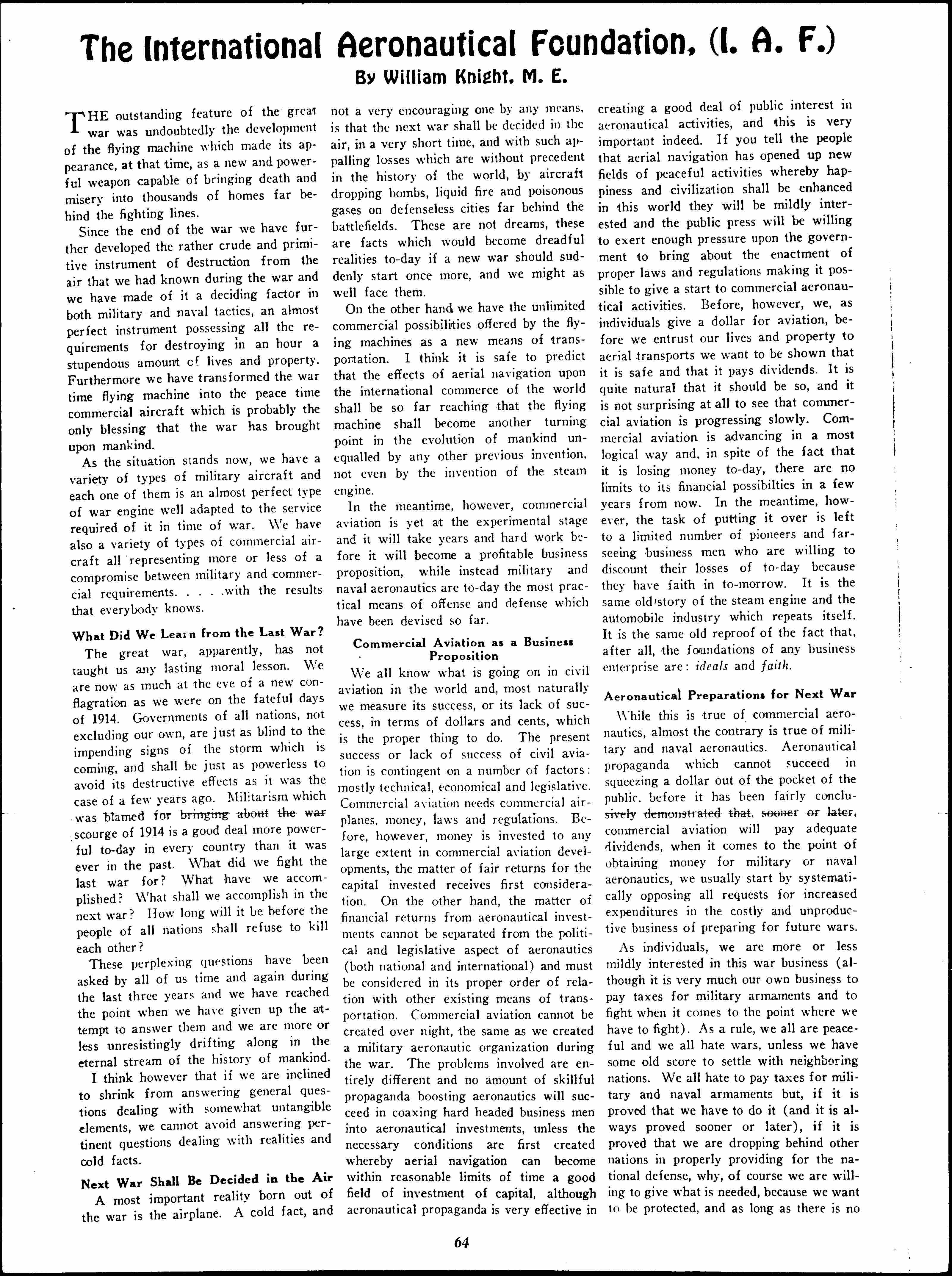 We all know what is going on in civil aviation in the world and, most naturally we measure its success, or its lack of success, in terms of dollars and cents, which is the proper thing to do. The present success or lack of success of civil aviation is contingent on a number of factors: mostly technical, economical and legislative. Commercial aviation needs commercial airplanes, money, laws and regulations. Before, however, money is invested to any large extent in commercial aviation developments, the matter of fair returns for the capital invested receives first consideration. On the other hand, the matter of financial returns from aeronautical investments cannot be separated from the political and legislative aspect of aeronautics (both national and international) and must be considered in its proper order of relation with other existing means of transportation. Commercial aviation cannot be created over night, the same as we created a military aeronautic organization during the war. The problems involved are entirely different and no amount of skillful propaganda boosting aeronautics will succeed in coaxing hard headed business men into aeronautical investments, unless the necessary conditions are first created whereby aerial navigation can become within reasonable limits of time a good field of investment of capital, although aeronautical propaganda is very effective in creating a good deal of public interest in aeronautical activities, and this is very important indeed. If you tell the people that aerial navigation has opened up new fields of peaceful activities whereby happiness and civilization shall be enhanced in this world they will be mildly interested and the public press will be willing to exert enough pressure upon the government to bring about the enactment of proper laws and regulations making it possible to give a start to commercial aeronautical activities. Before, however, we, as individuals give a dollar for aviation, before we entrust our lives and property to aerial transports we want to be shown that it is safe and that it pays dividends. It is quite natural that it should be so, and it is not surprising at all to see that commercial aviation is progressing slowly. Commercial aviation is advancing in a most logical way and, in spite of the fact that it is losing money [today], there are no limits to its financial possibilities in a few years from now. In the meantime, however, the task of putting it over is left to a limited number of pioneers and farseeing business men who are willing to discount their losses of [today] because they have faith in [tomorrow]. It is the same old story of the steam engine and the automobile industry which repeats itself. It is the same old reproof of the fact that, after all, the foundations of any business enterprise are: ideals and faith.