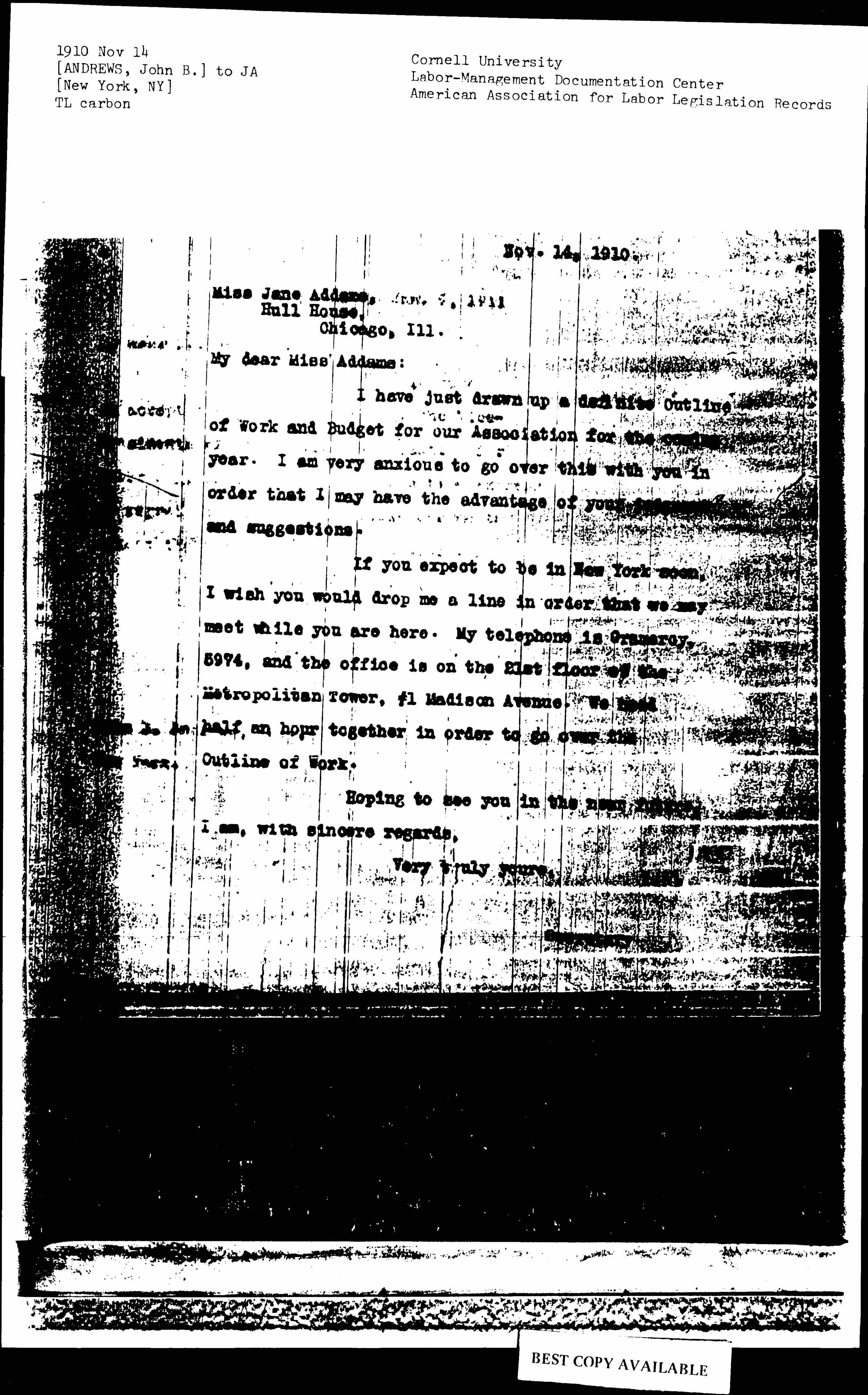 If you expect to be in New York soon, I wish you would drop me a line in order that we may meet while you are here. My telephone is Gramercy, 5974, and the office is on the 21st floor of the Metropolitan Tower, #1 Madison Avenue. We need half an hour together in order to go over the Outline of Work.