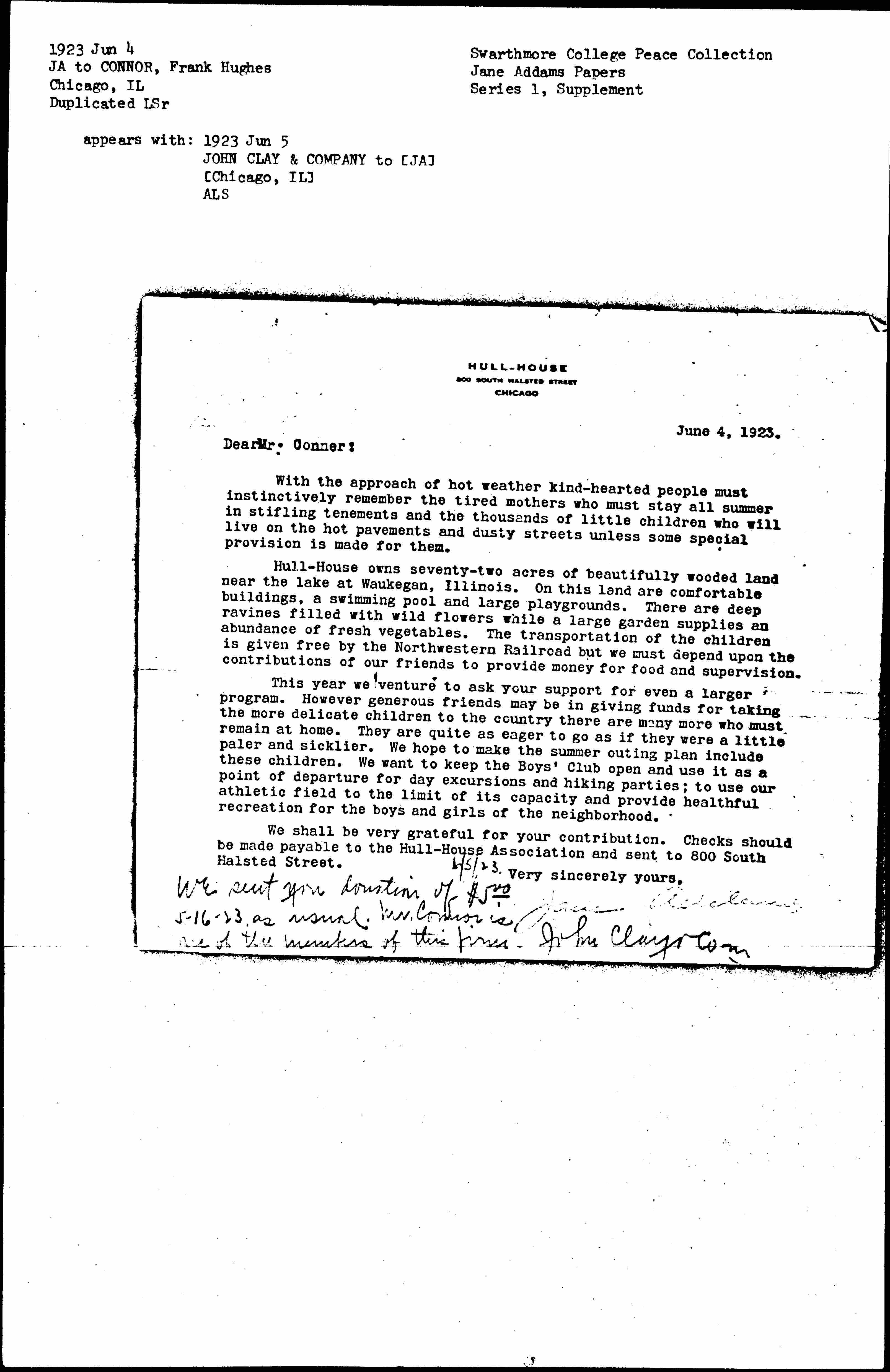 We shall be very grateful for your contribution. Checks should be made payable to the Hull-House Association and sent to 800 South Halsted Street.
