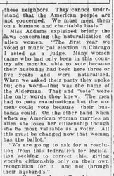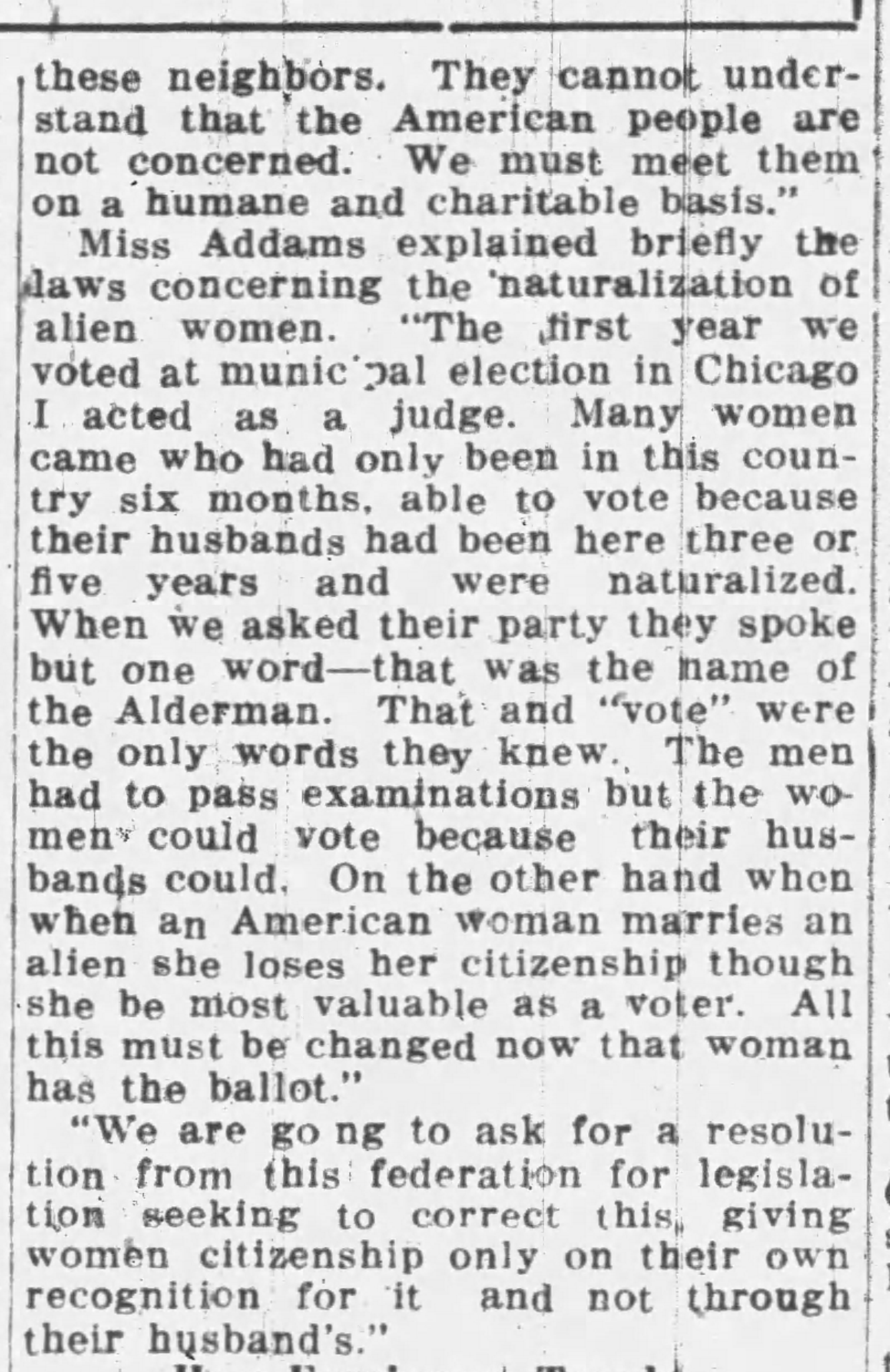 Miss Addams explained briefly the laws concerning the naturalization of alien women. "The first year we voted at municipal election in Chicago I acted as a judge. Many women came who had only been in this country six months, able to vote because their husbands had been here three or five years and were naturalized. When we asked their party they spoke but one word -- that was the name of the Alderman. That and "vote" were the only words they knew. The men had to pass examinations but the women could vote because their husbands could. On the other hand when an American woman marries an alien she loses her citizenship though she be most valuable as a voter. All this much be changed now that woman has the ballot."
