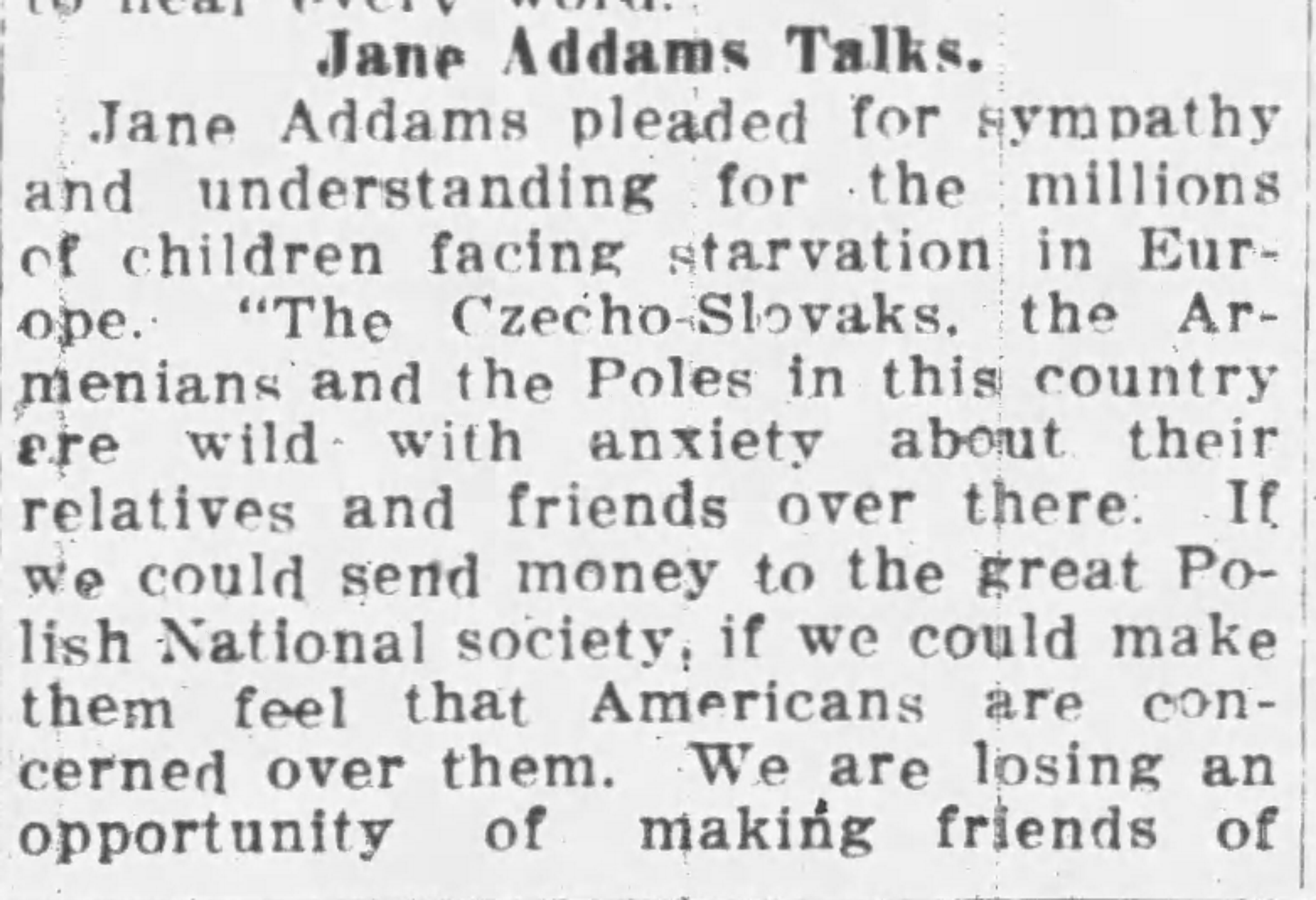 Jane Addams pleaded for sympathy and understanding for the millions of children facing starvation in Europe. "The Czecho-Slovaks, the Armenians and the Poles in this country are wild with anxiety about their relatives and friends over there. If we could send money to the great Polish National society, if we could make them feel that Americans are concerned about them. We are losing an opportunity of making friends of [page 2] these neighbors. They cannot understand that the American people are not concerned. We must meet them on a humane and charitable basis."