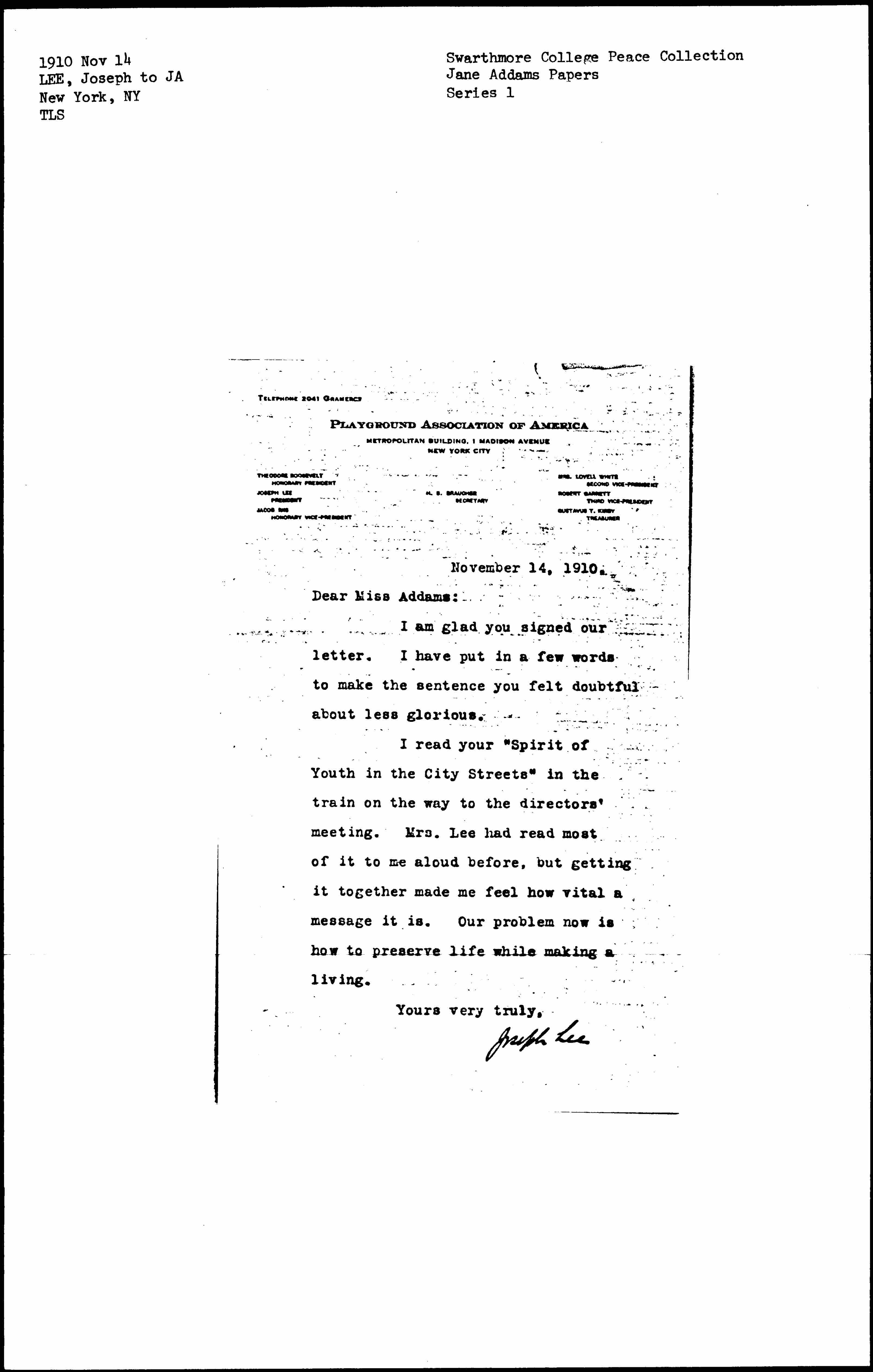 I read your "Spirit of Youth in the City Streets" in the train on the way to the directors' meeting. Mrs. Lee had read most of it to me aloud before, but getting it together made me feel how vital a message it is. Our problem now is how to preserve life while making a living.