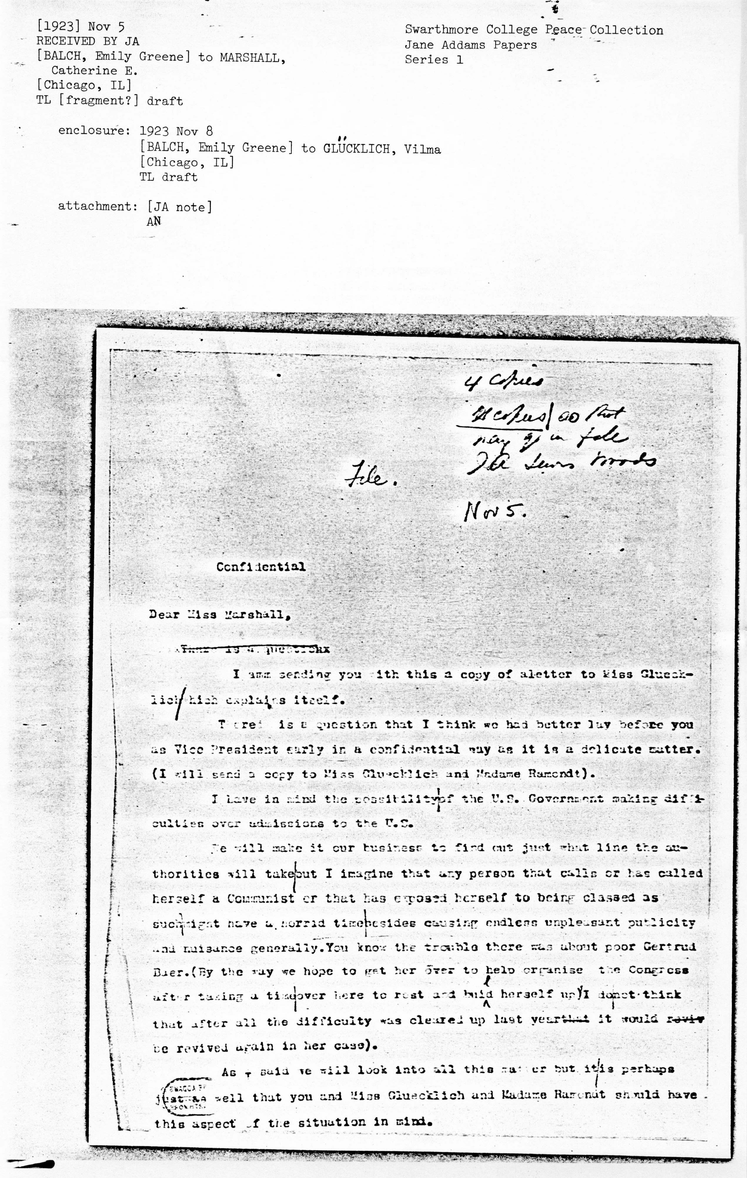 We will make it our business to find out just what line the authorities will take out I imagine that any person that calls or has called herself a Communist or that has exposed herself to being classed as such might have a horrid time besides causing endless unpleasant publicity and nuisance generally. You know the trouble there was about poor Gertrud Baer. (By the way we hope to get her over to help organize the Congress after taking a time over here to rest and [build] herself up. I do not think that after all the difficulty was cleared up last year that it would reviv be revived again in her case).