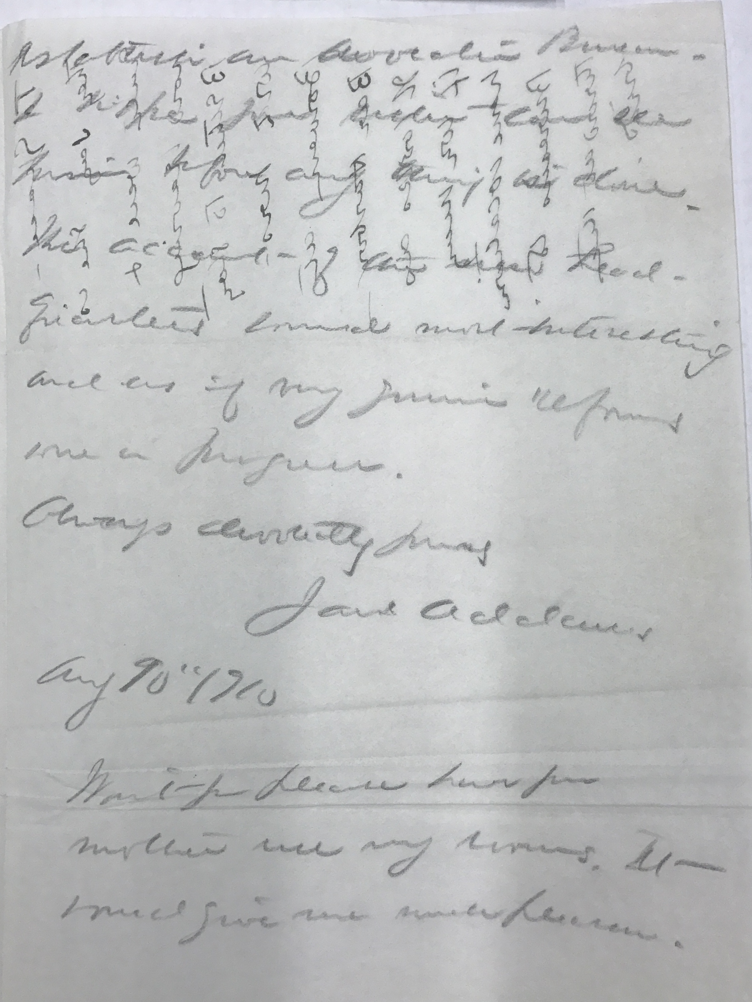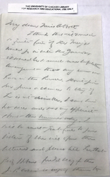 I think that it would be quite fine if Dr Meigs would go in with Dr Yarros, it would be a much more comfortable arrangement than any room we have in the house. Don't give Mr Jones a chance to stay if he isn't desirable. I saw him but once and was very explicit about the [illegible] only. I will be most grateful to your sister if she will open the letters and please tell her that Prof Hoben field sec'y for the J. P. Assn is urging them to [page 2] establish [a] Vocation Bureau. I hope your sister can see him before any thing is done. This account of the new headquarters sounds most interesting and as if very genuine reforms were in progress.