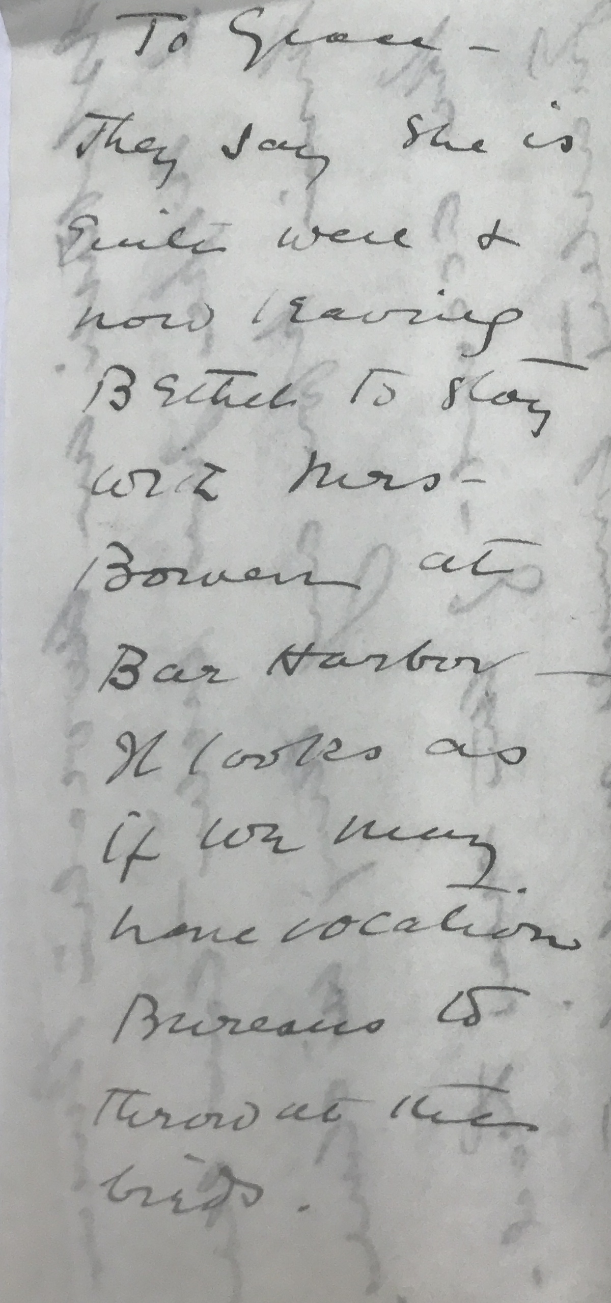 They say she is quite well & now leaving Bethel to stay with Mrs Bowen at Bar Harbor. It looks as if we may have vocation Bureaus to throw at the birds.