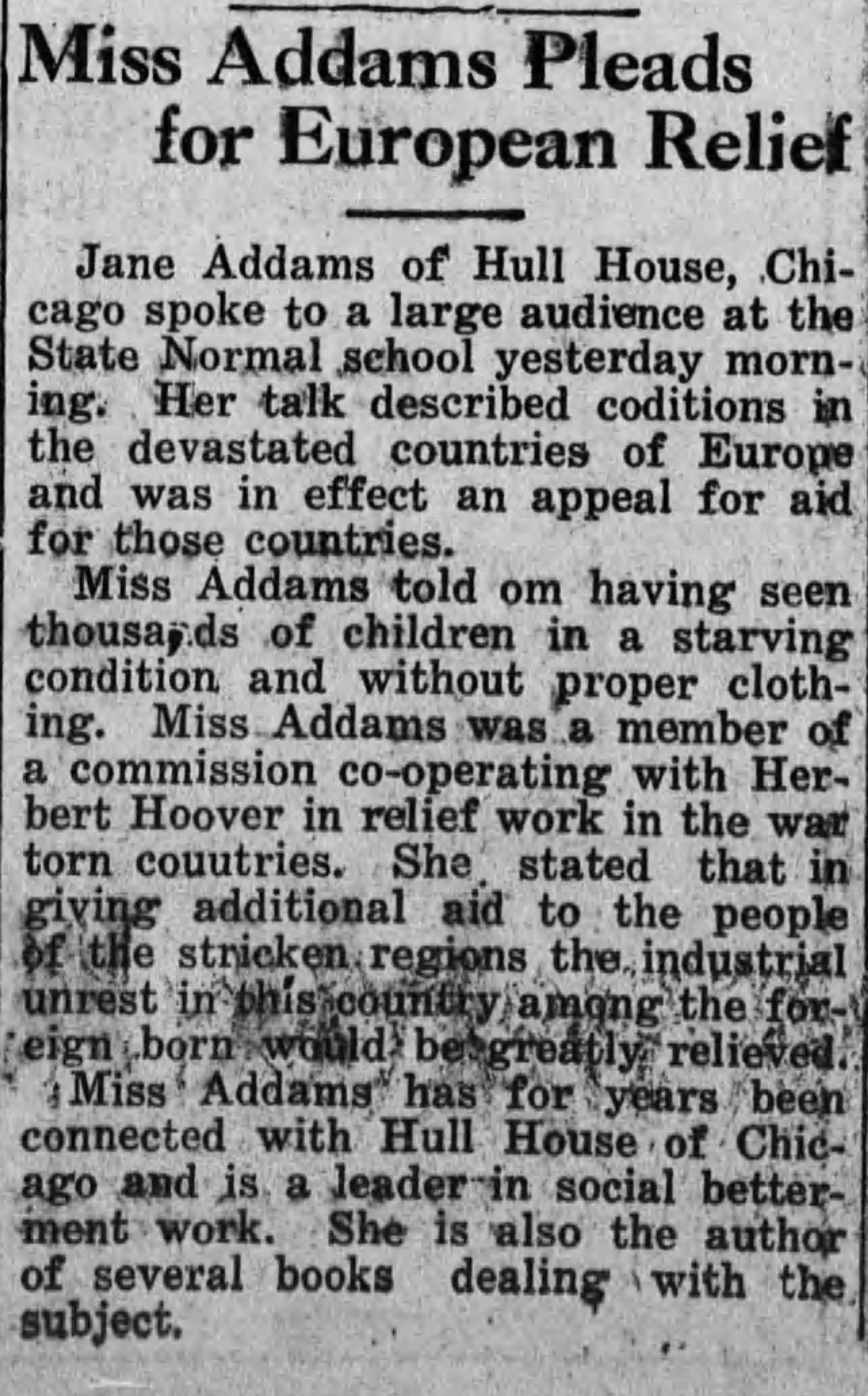 Jane Addams of Hull House, Chicago spoke to a large audience at the State Normal school yesterday morning. Her talk described conditions in the devastated countries of Europe and was in effect an appeal for aid for those countries.
