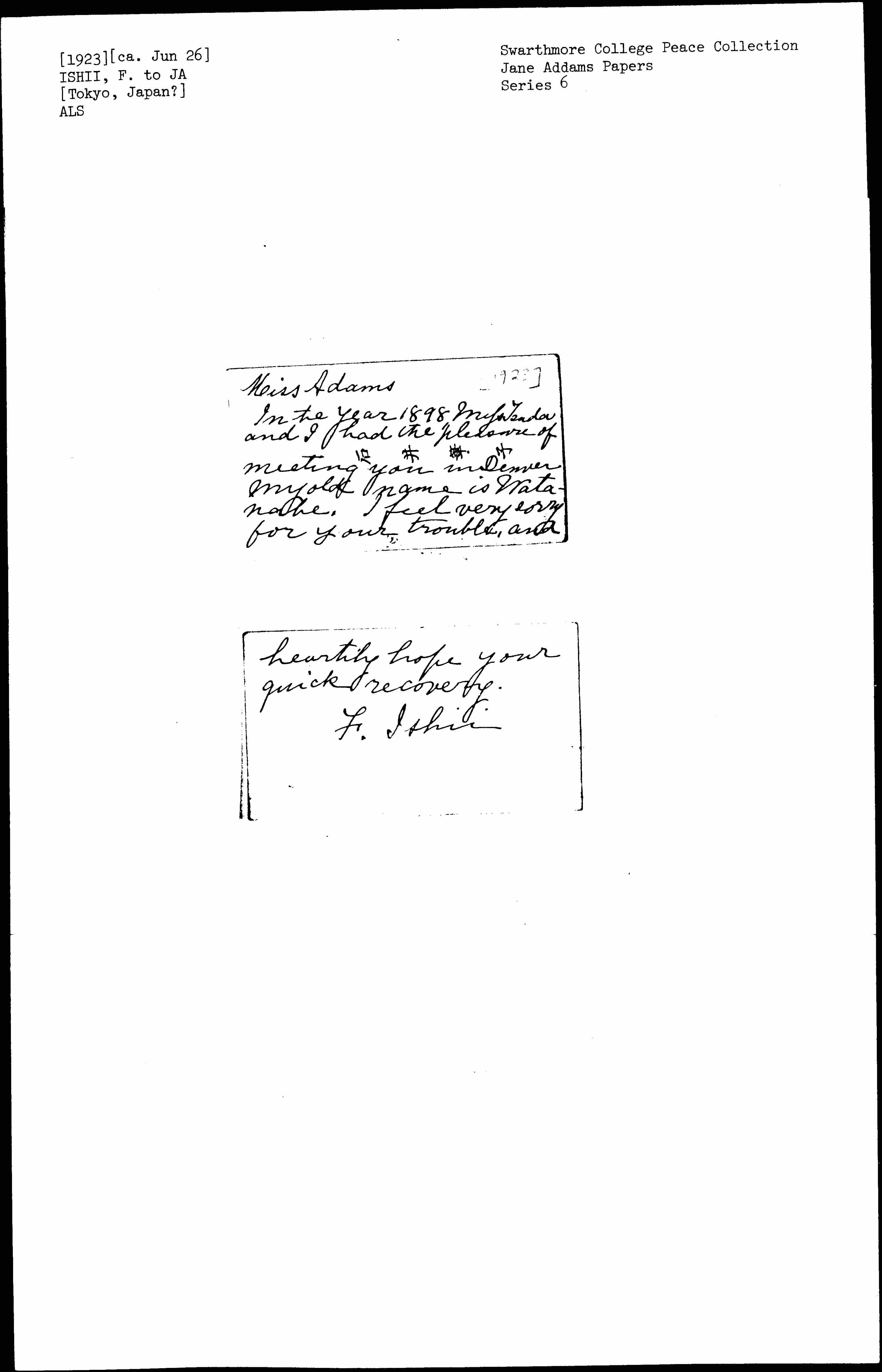 In the year 1898 [Miss] Tsuda and I had the pleasure of meeting you in Denver. My old name is Watanabe. I feel very sorry for your trouble, and [page 2] heartily hope your quick recovery.