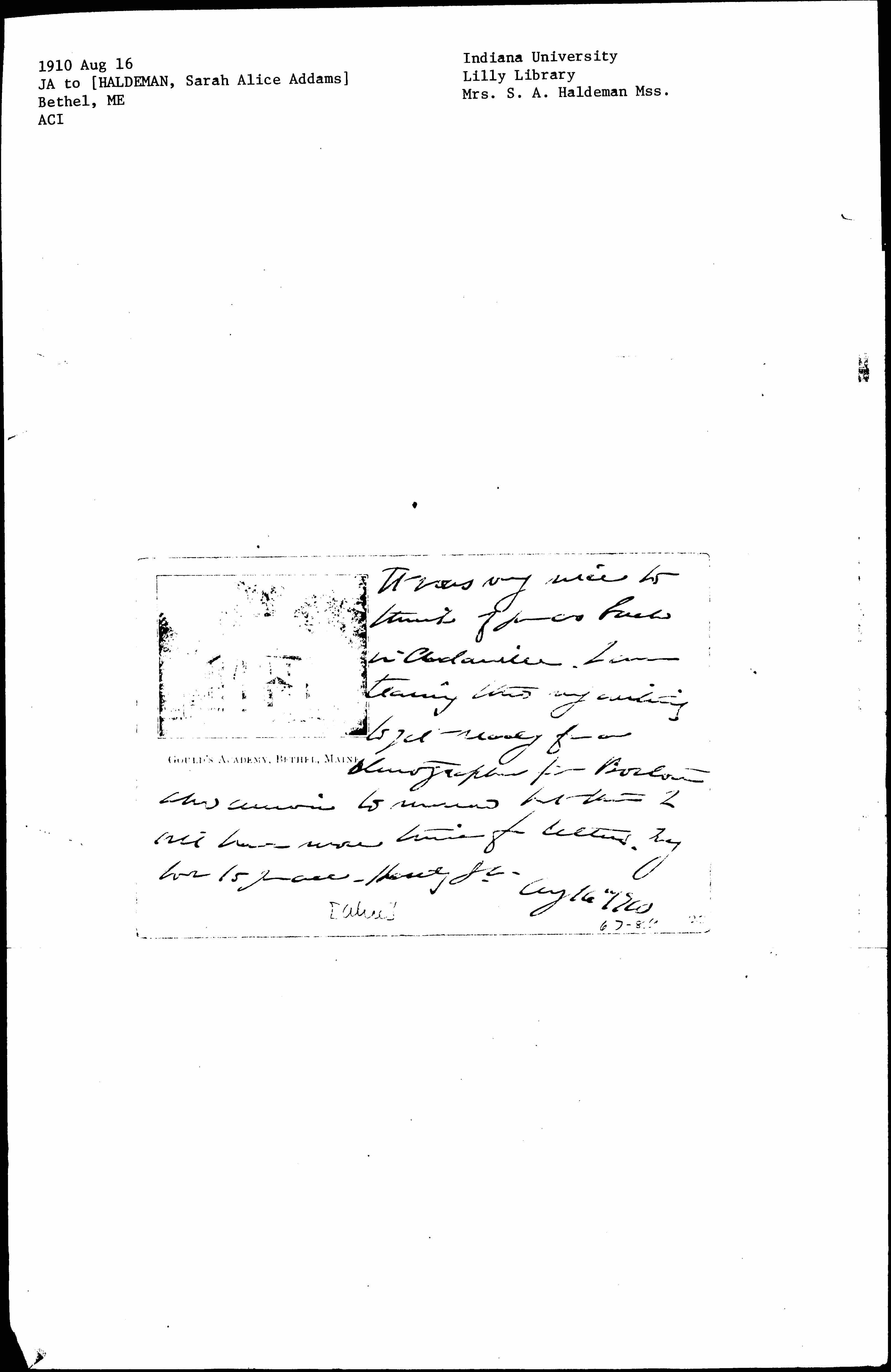 It was very nice to think of you as back in Cedarville. I am tearing [through] my writing to get ready for a stenographer from Boston who arrives [tomorrow] but then I will have more time for letters. My love to you all. [Hastily] J. A.