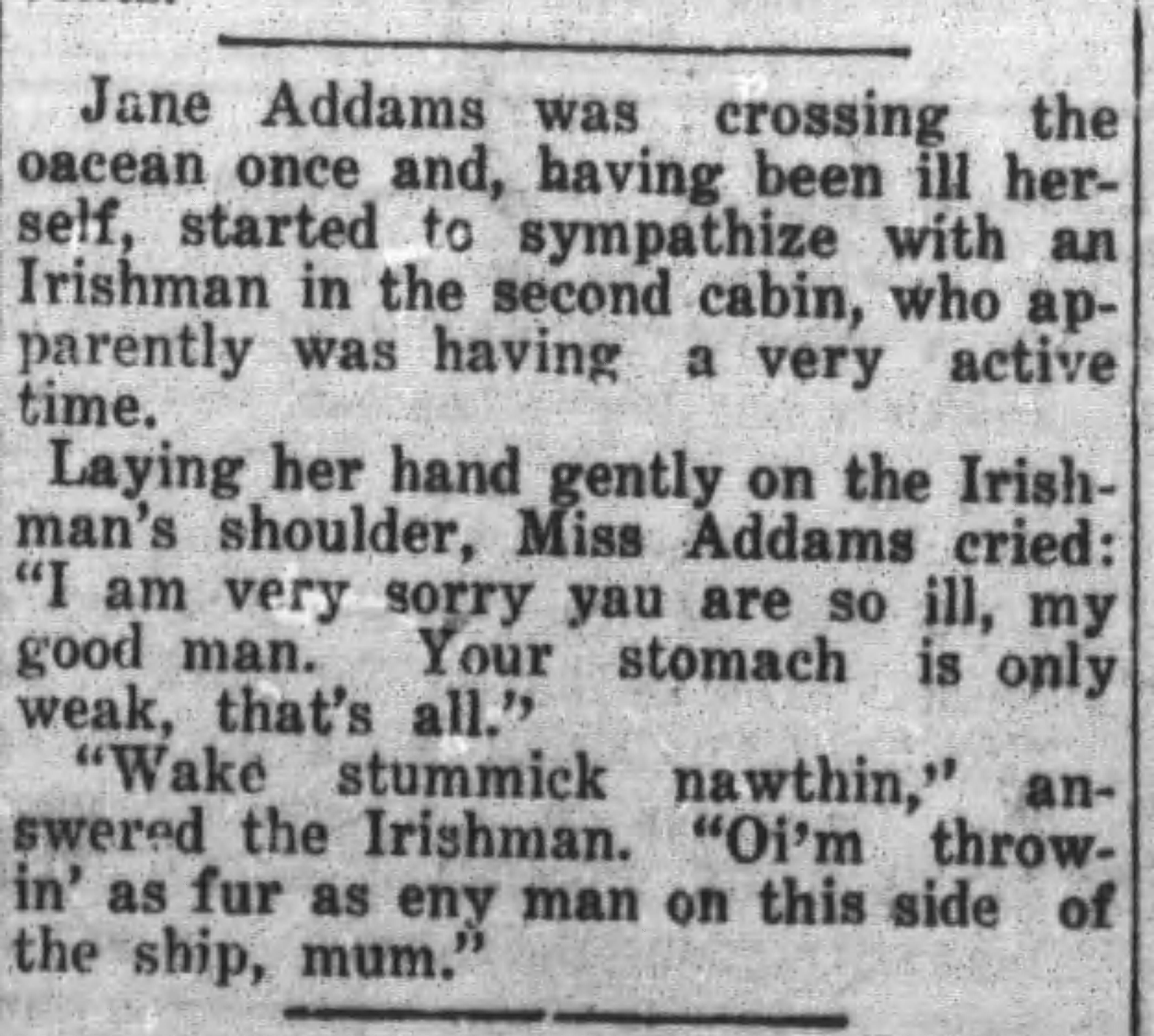Jane Addams was crossing the [ocean] once and, having been ill herself, started to sympathize with an Irishman in the second cabin, who apparently was having a very active time.