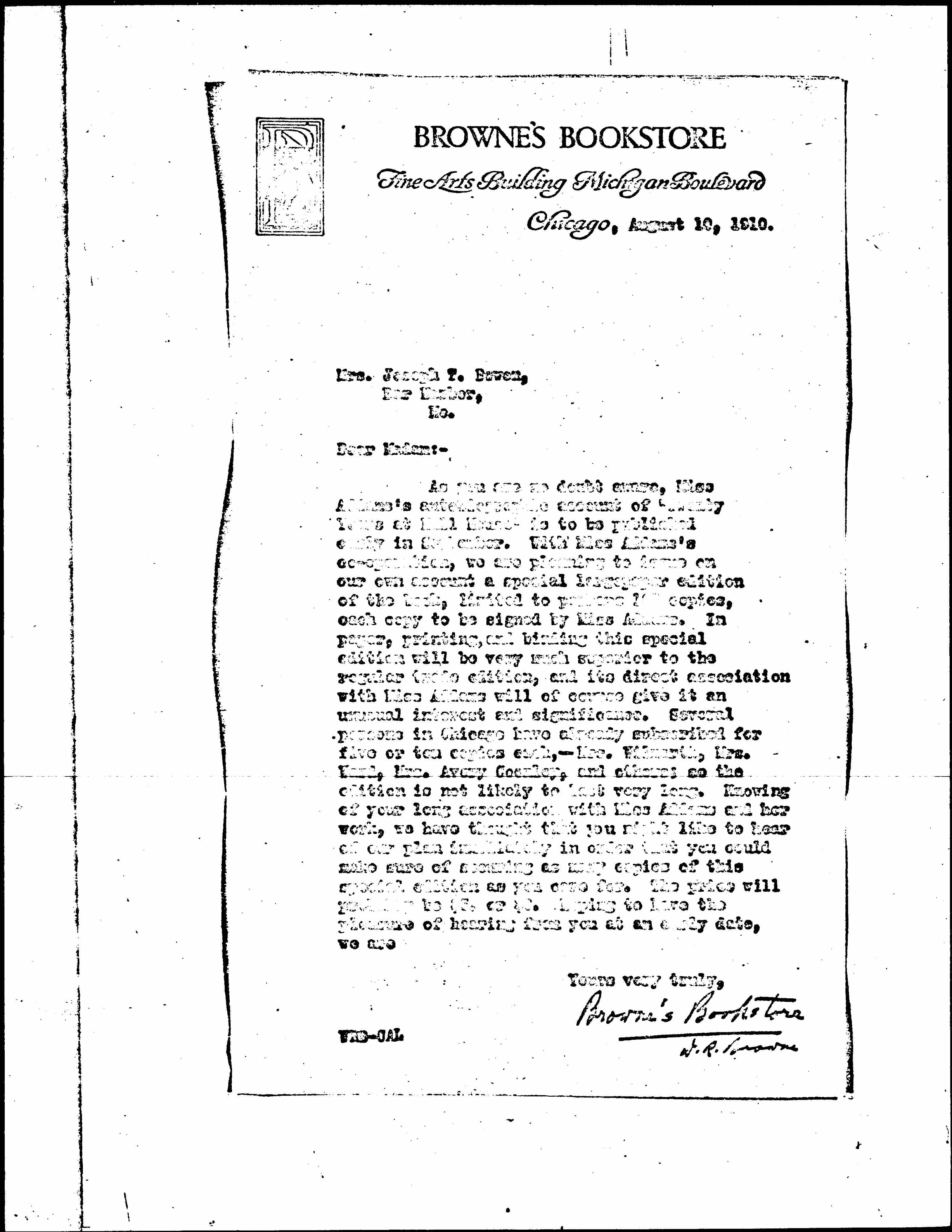 As you are no doubt aware, Miss Addams's autobiographic account of "Twenty Years at Hull House" is to be published early in September. With Miss Addams's [cooperation], we are planning to issue on our own account a special large paper edition of the book, limited to perhaps 125 copies, each copy to be signed by Miss Addams. In paper, printing, and binding this special edition will be very much superior to the regular trade edition, and its direct association with Miss Addams will of course give it an unusual interest and significance. Several persons in Chicago have already subscribed for five or ten copies each, -- Mrs. Wilmarth, Mrs. Ward, Mrs. Avery Coonley, and others; so the edition is not likely to last very long. Knowing of your long association with Miss Addams and her work, we have thought that you might like to hear of our plan immediately in order that you could make sure of securing as many copies of this special edition as you care for. The price will probably be $5. or $6. Hoping to have the pleasure of hearing from you at an early date, we are
