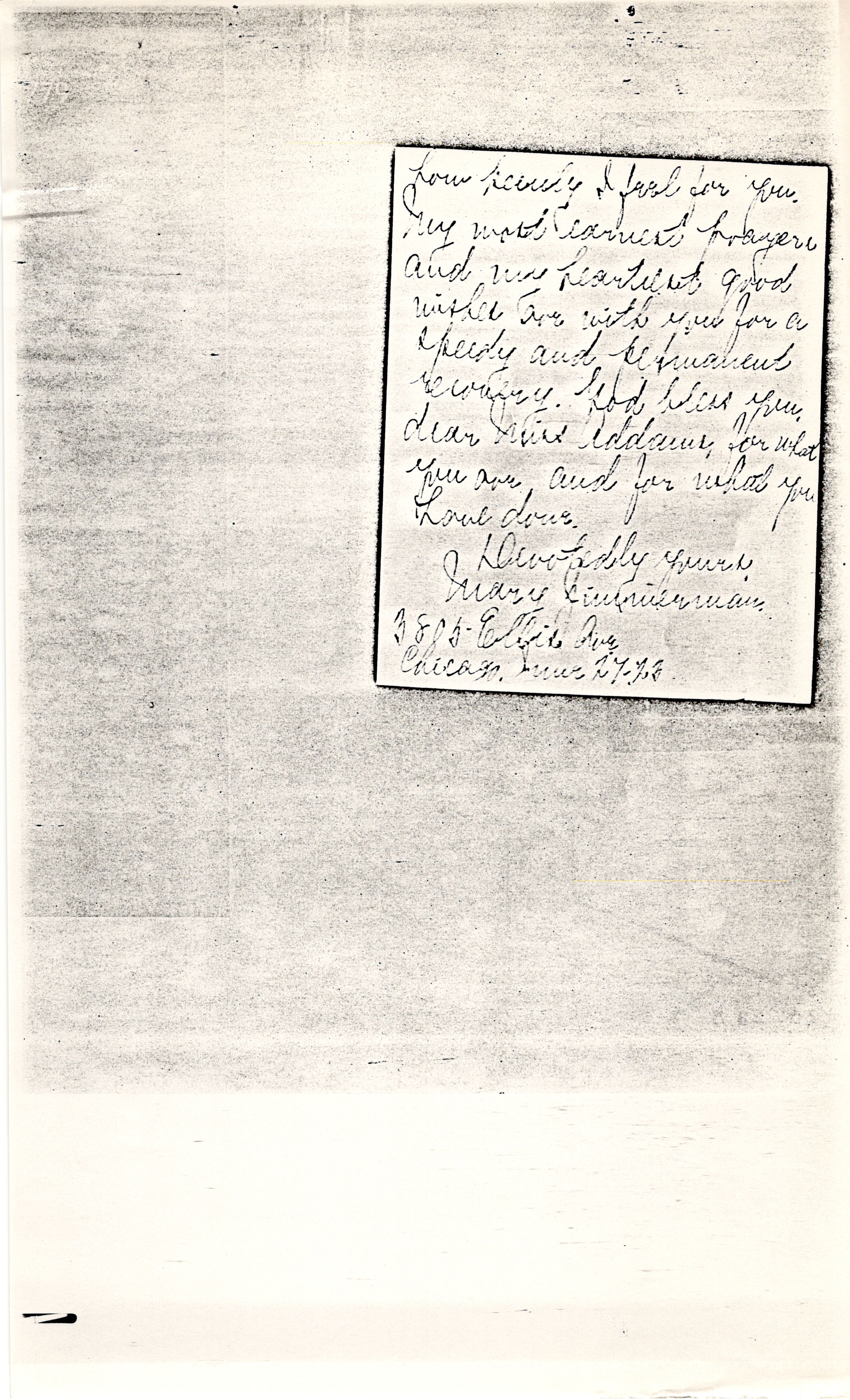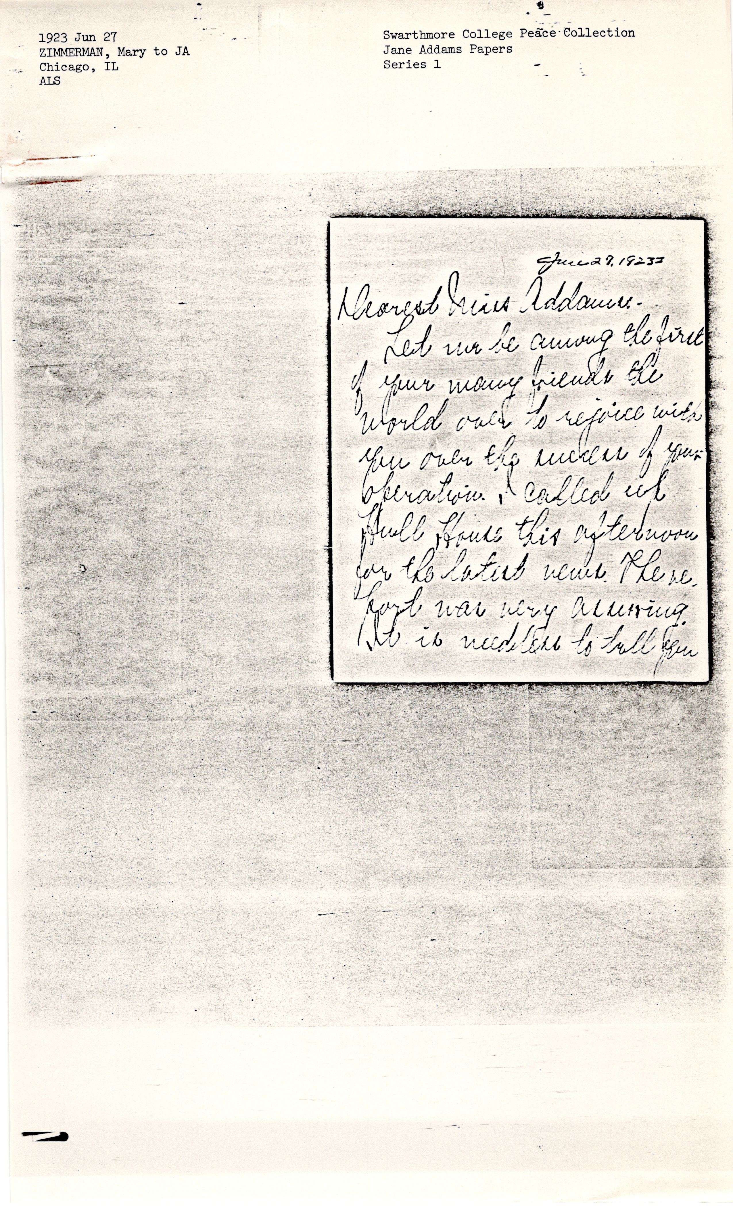 Let me be among the first of your many friends the world over to rejoice with you over the success of your operation. I called up Hull House this afternoon for the latest news. The report was very assuring. It is needless to tell you [page 2] how keenly I feel for you. My most earnest prayers and my heartiest good wishes are with you for a speedy and permanent recovery. God bless you, dear Miss Addams, for what you are, and for what you have done.