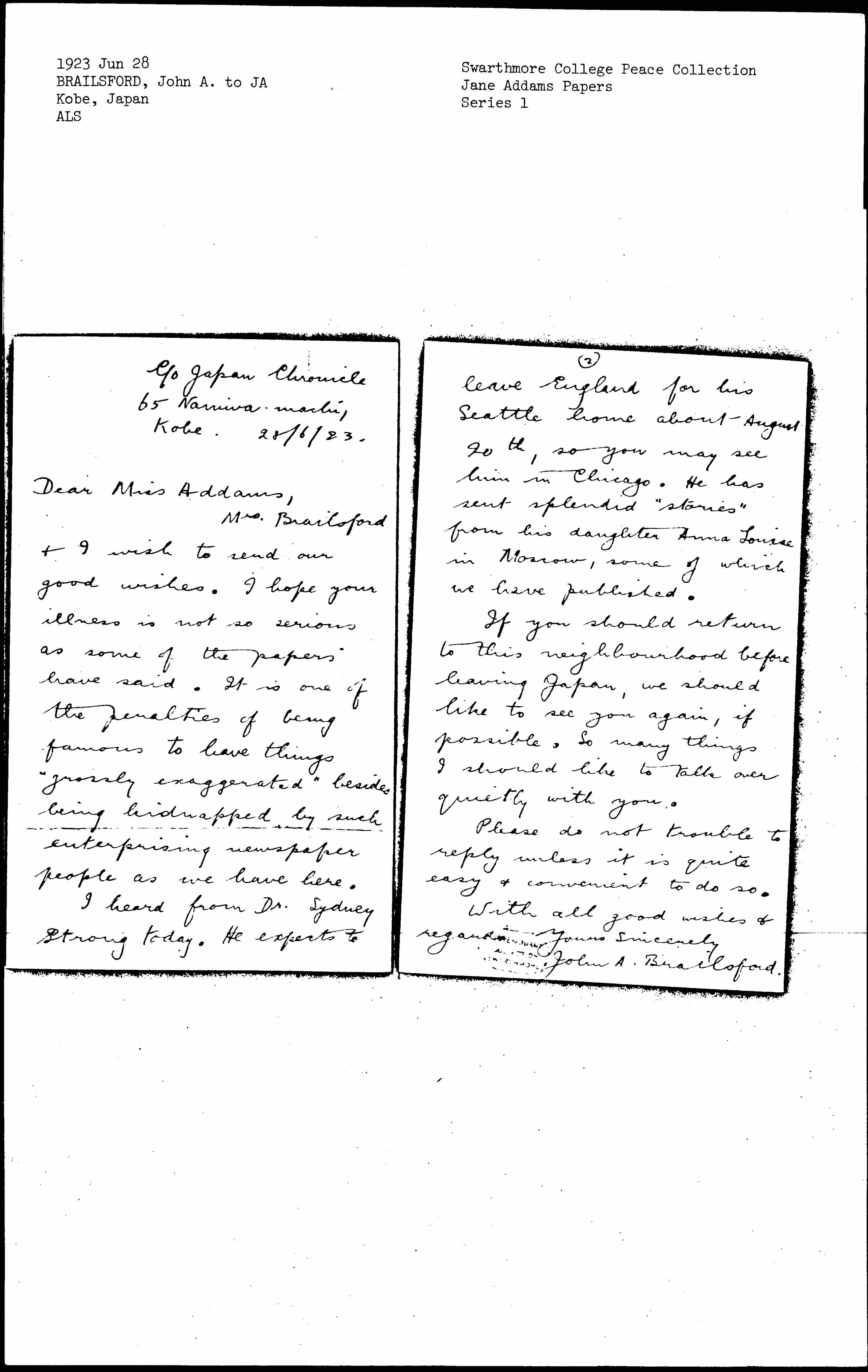 Mrs. Brailsford & I wish to send our good wishes. I hope your illness is not so serious as some of the papers have said. It is one of the penalties of being famous to have things "grossly exaggerated" besides being kidnapped by such enterprising newspaper people as we have here.