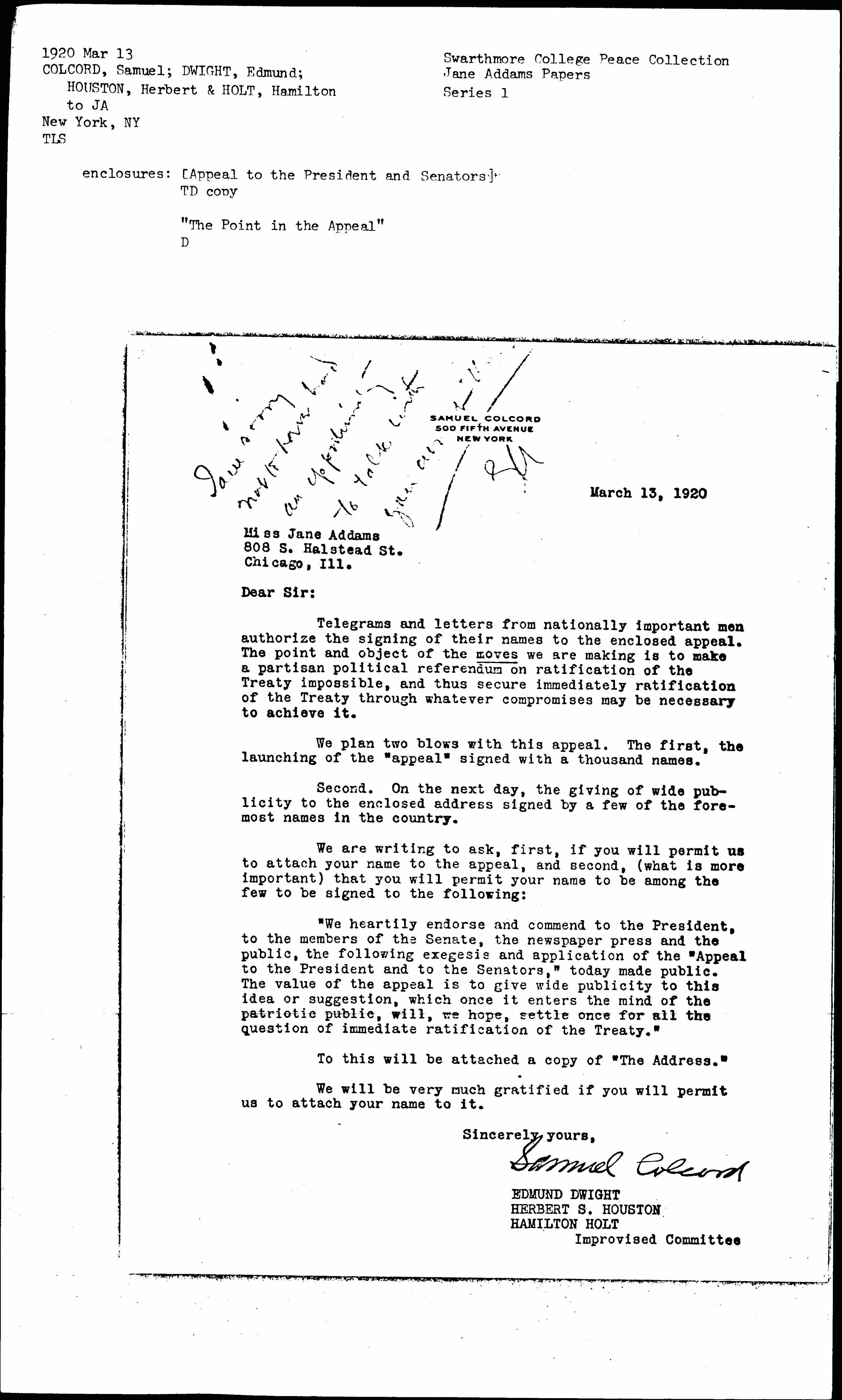 Telegrams and letters from nationally important men authorize the signing of their names to the enclosed appeal. The point and object of the moves we are making is to make a partisan political referendum on ratification of the Treaty impossible, and thus secure immediately ratification of the Treaty through whatever compromises may be necessary to achieve it.