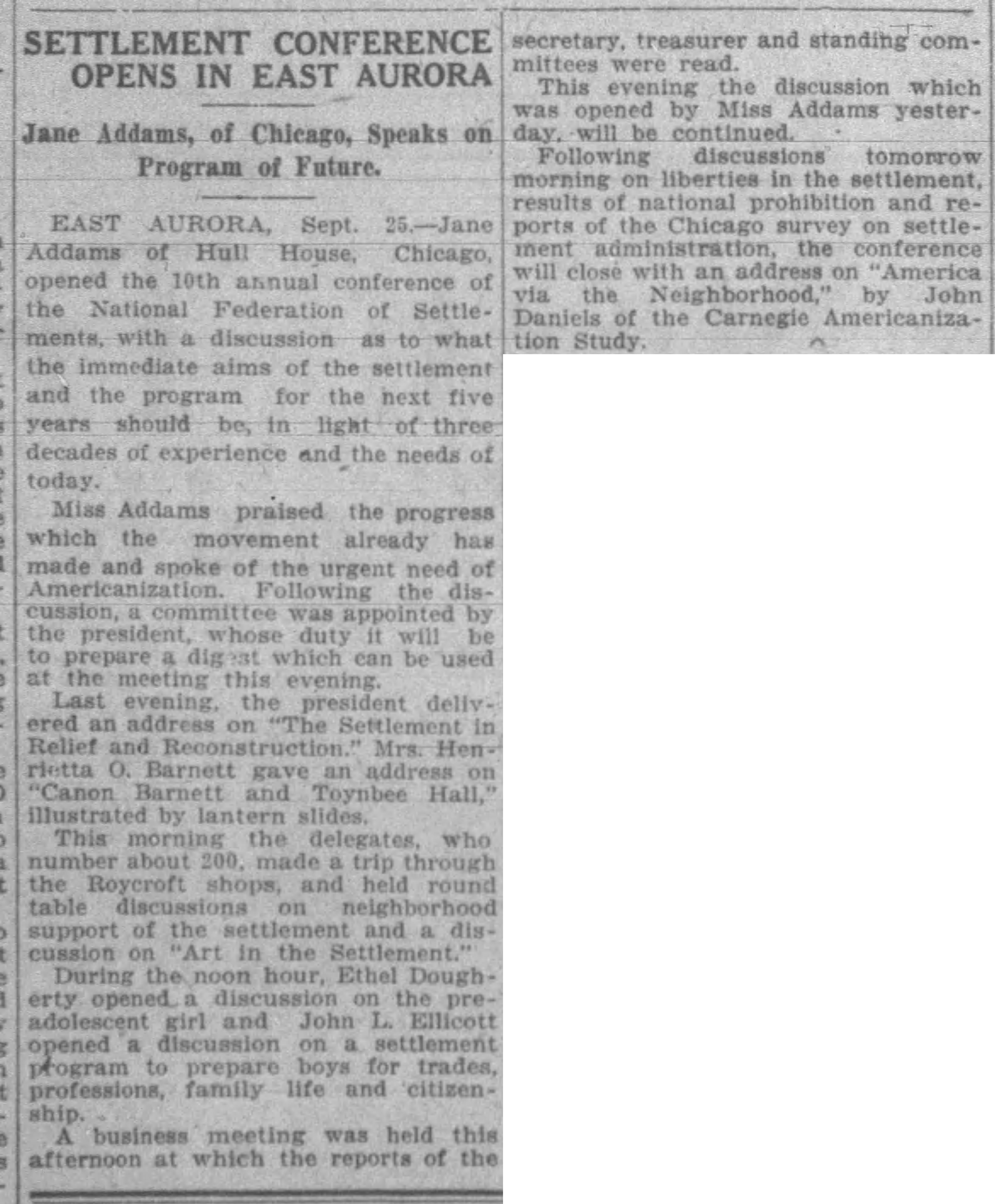EAST AURORA, Sept. 25. -- Jane Addams of Hull House, Chicago, opened the 10th annual conference of the National Federation of Settlements, with a discussion as to what the immediate aims of the settlement and the program for the next five years should be, in light of three decades of experience and the needs of today.