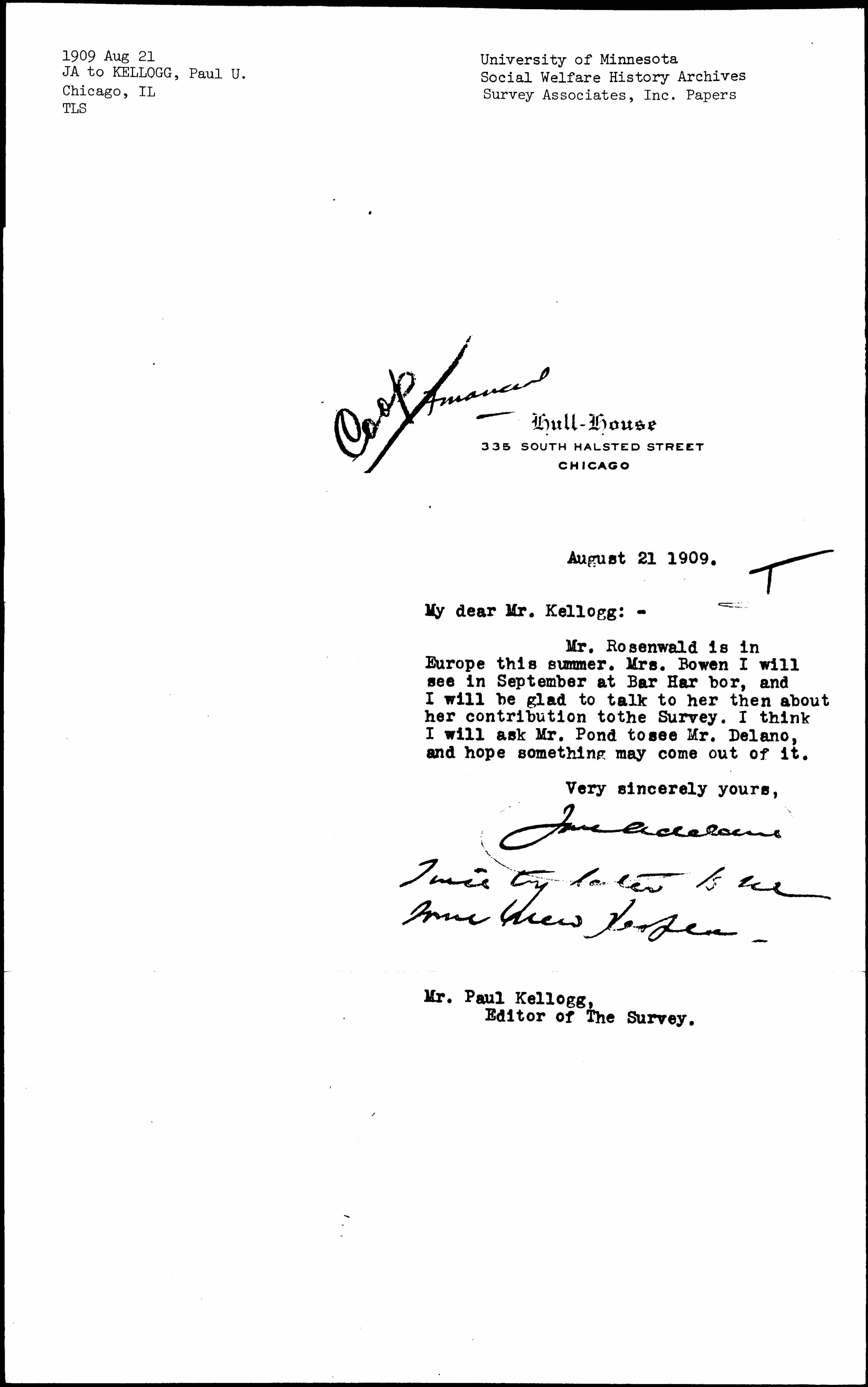 Mr. Rosenwald is in Europe this summer. Mrs. Bowen I will see in September at Bar Harbor, and I will be glad to talk to her then about her contribution to the Survey. I think I will ask Mr. Pond to see Mr. Delano, and hope something may come out of it.