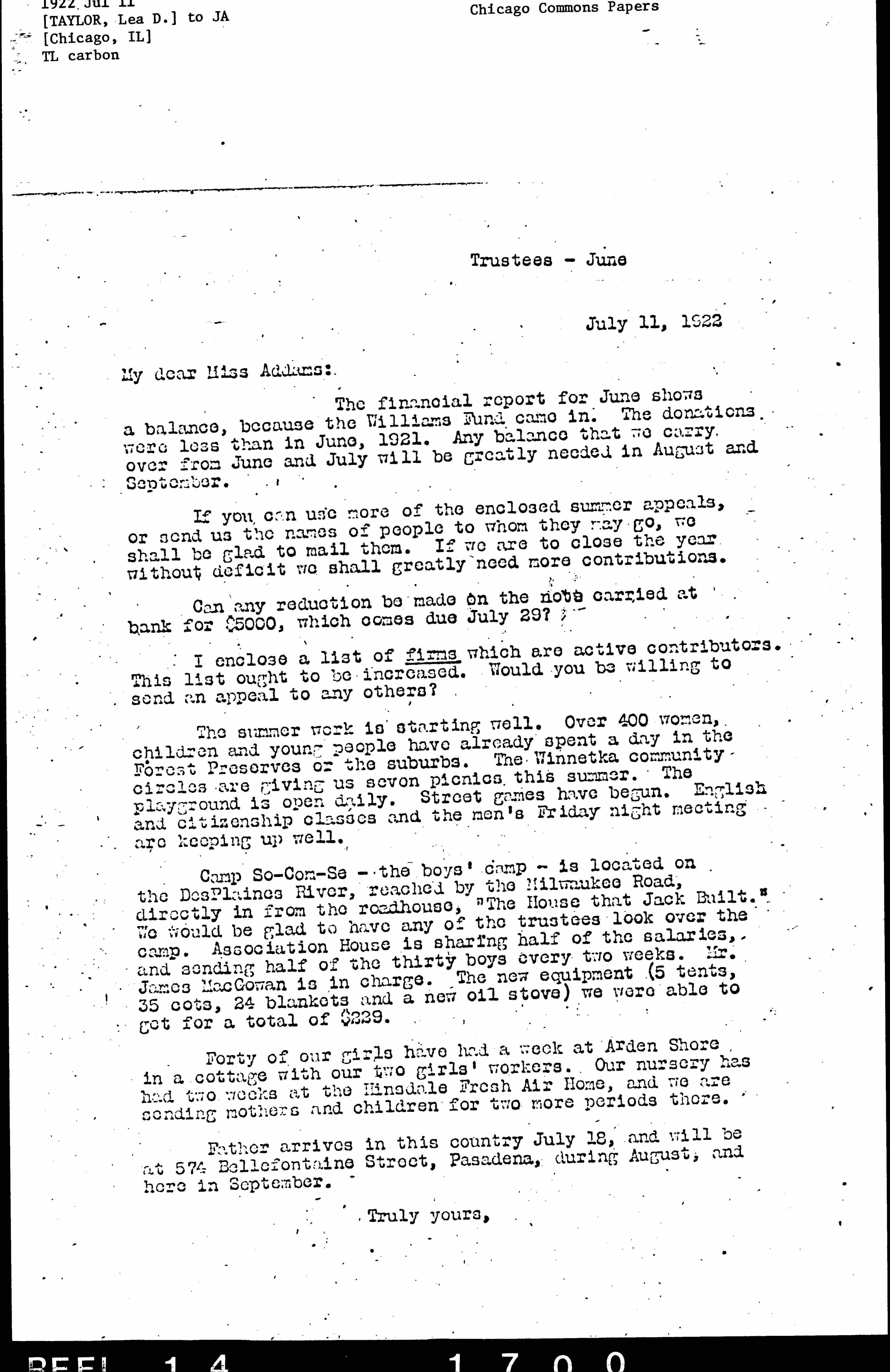 Camp So-Com-Se -- the boys' camp -- is located on the Des Plaines River, reached by the Milwaukee Road, directly in from the roadhouse, "The House that Jack Built." We would be glad to have any of the trustees look over the camp. Association House is sharing half of the salaries, and sending half of the thirty boys every two weeks. Mr. James MacGowan is in charge. The new equipment (5 tents, 35 cots, 24 blankets and a new oil stove) we were able to get for a total of $229.