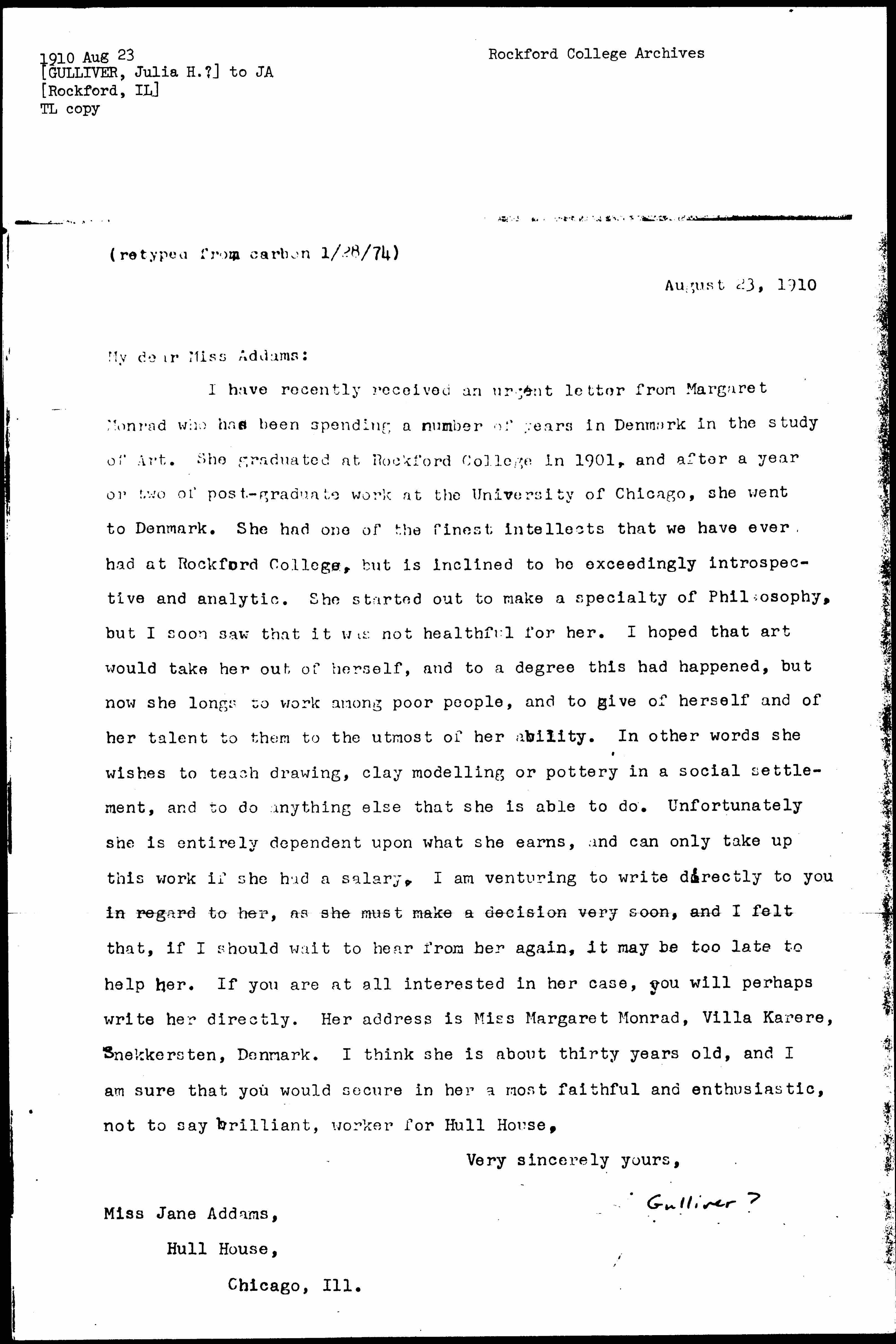 I have recently received an urgent letter from Margaret Monrad who has been spending a number of years in Denmark in the study of Art. She graduated at Rockford College in 1901, and after a year or two of post-graduate work at the University of Chicago, she went to Denmark. She had one of the finest intellects that we have ever had at Rockford College, but is inclined to be exceedingly introspective and analytic. She started out to make a specialty of Philosophy, but I soon saw that it was not healthful for her. I hoped that art would take her out of herself, and to a degree this had happened, but now she longs to work among poor people, and to give of herself and of her talent to them to the utmost of her ability. In other words she wishes to teach drawing, clay modeling or pottery in a social settlement, and to do anything else that she is able to do. Unfortunately she is entirely dependent upon what she earns, and can only take up this work if she had a salary. I am venturing to write directly to you in regard to her, as she must make a decision very soon, and I felt that, if I should wait to hear from her again, it may be too late to help her. If you are at all interested in her case, you will perhaps write her directly. Her address is Miss Margaret Monrad, Villa Karere, Snekkersten, Denmark. I think she is about thirty years old, and I am sure that you would secure in her a most faithful and enthusiastic, not to say brilliant, worker for Hull House.