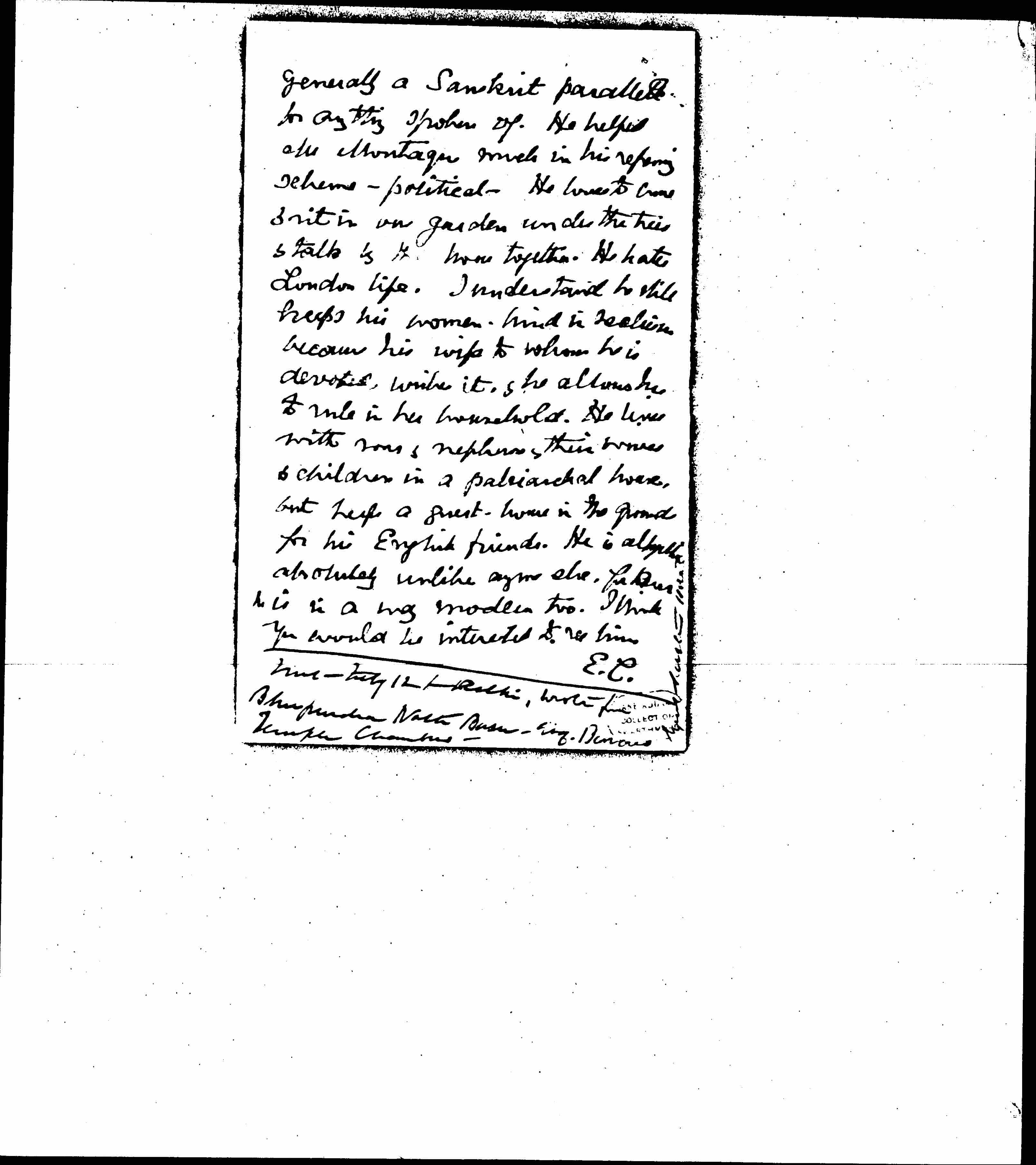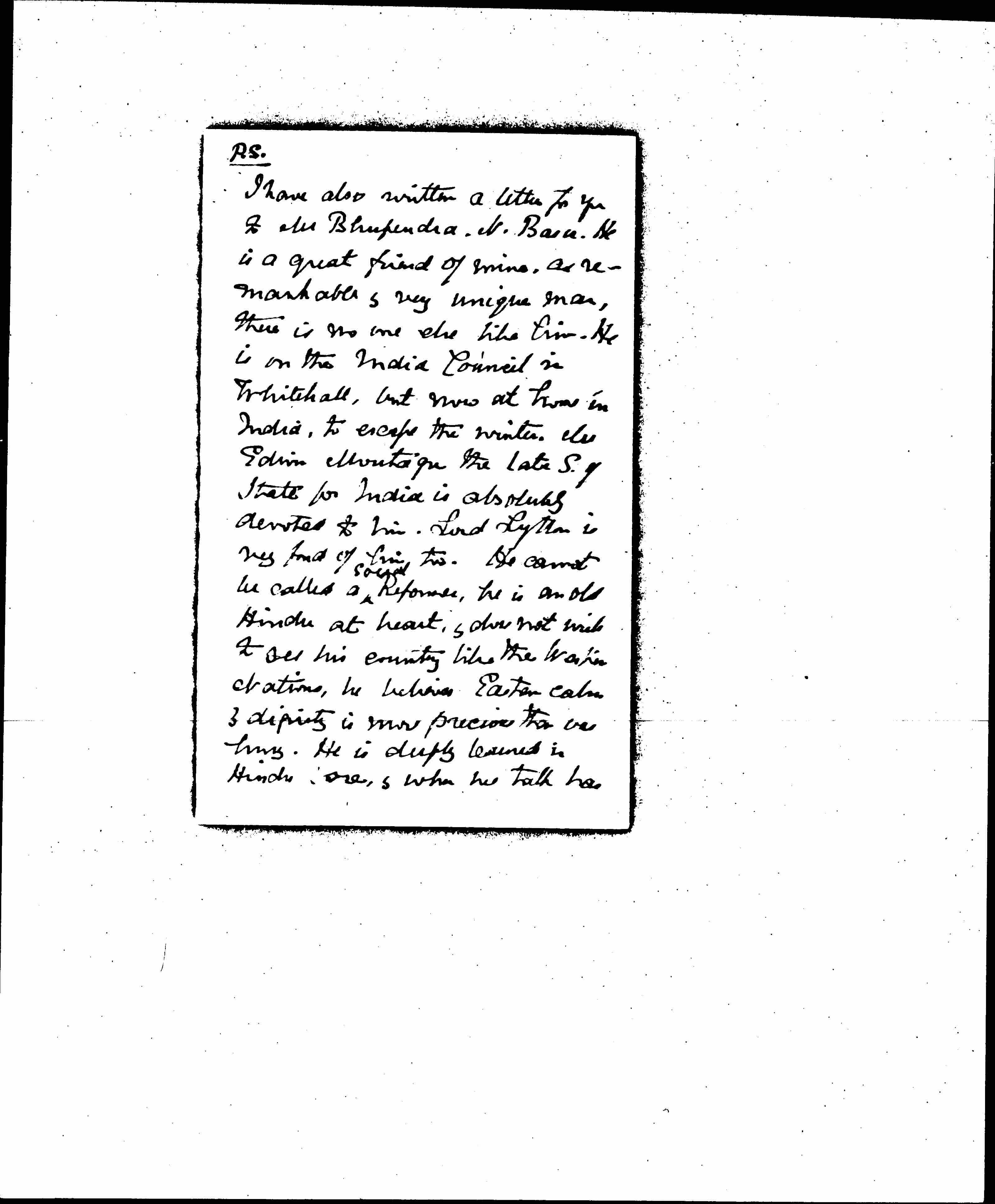 I have also written a letter for you to Mr Bhupendra N. Bose. He is a great friend of mine, a remarkable & very unique man, there is no one else like him. He is on the India Council in Whitehall, but now at home in India, to escape the winter. Mr. Edwin Montagu the late S. of State for India is absolutely devoted to him. Lord Lytton is very fond of him too. He cannot be called a ↑social↓ Reformer, he is an old Hindu at heart, & does not wish to see his country like the Western Nations, he believes Eastern calm & dignity is more precious than [illegible]. He is deeply learned in Hindu [lore], & when we talk has [page 6] generally a Sanskrit parallel for anything spoken of. He helped Mr Montagu much in his reforming scheme -- political -- He loves to come & sit in our garden under the trees & talk [illegible] together. He hates London life. I understand he still keeps his women-kind in seclusion because his wife to whom he is devoted, wishes it, & he allows her to rule in her household. He lives with sons & nephews & their wives & children in a patriarchal house, but keeps a guest-house in the [ground] for his English friends. He is altogether absolutely unlike anyone else, [further] he is in a way modern too. I think you would be interested to see him.