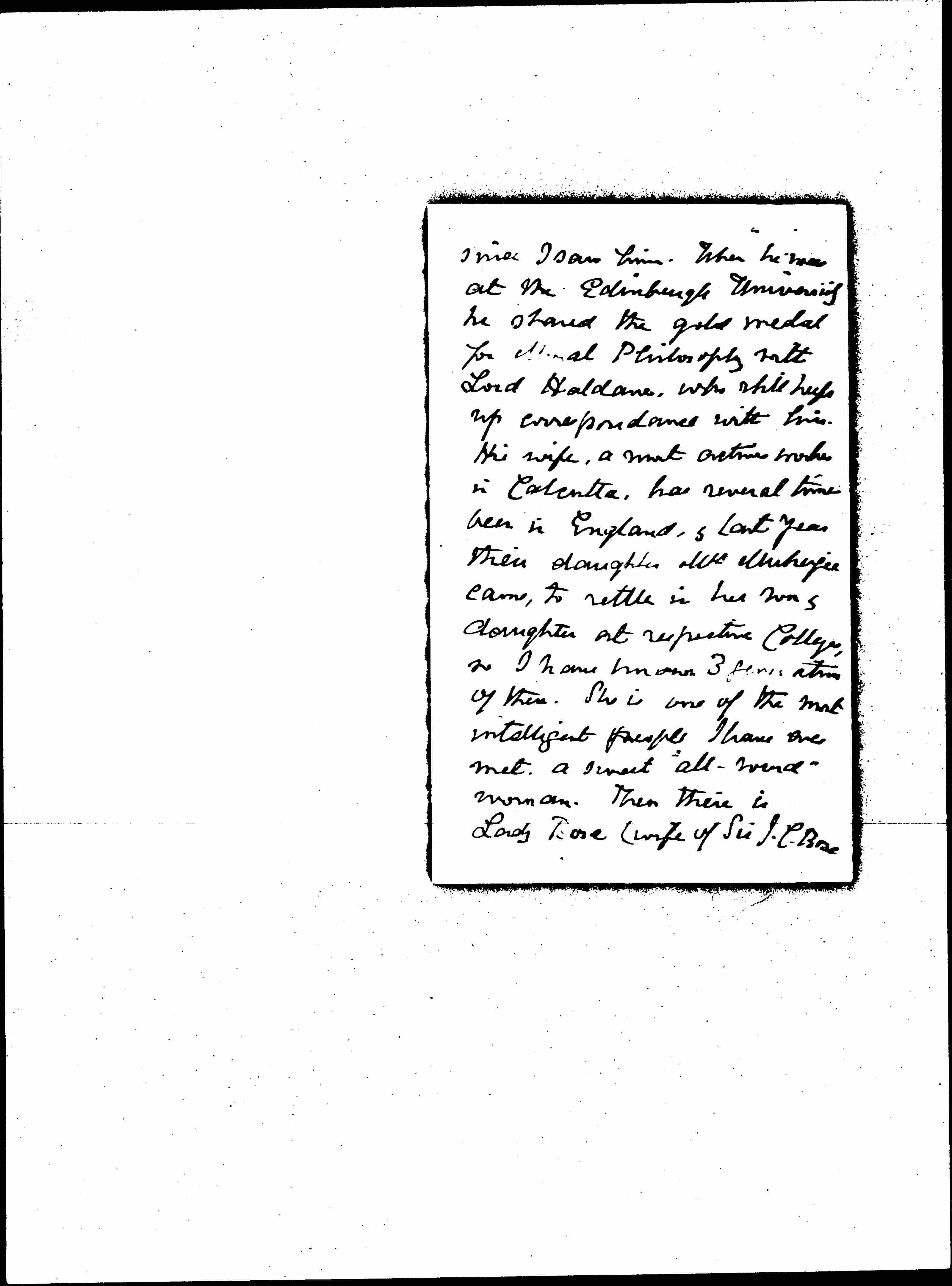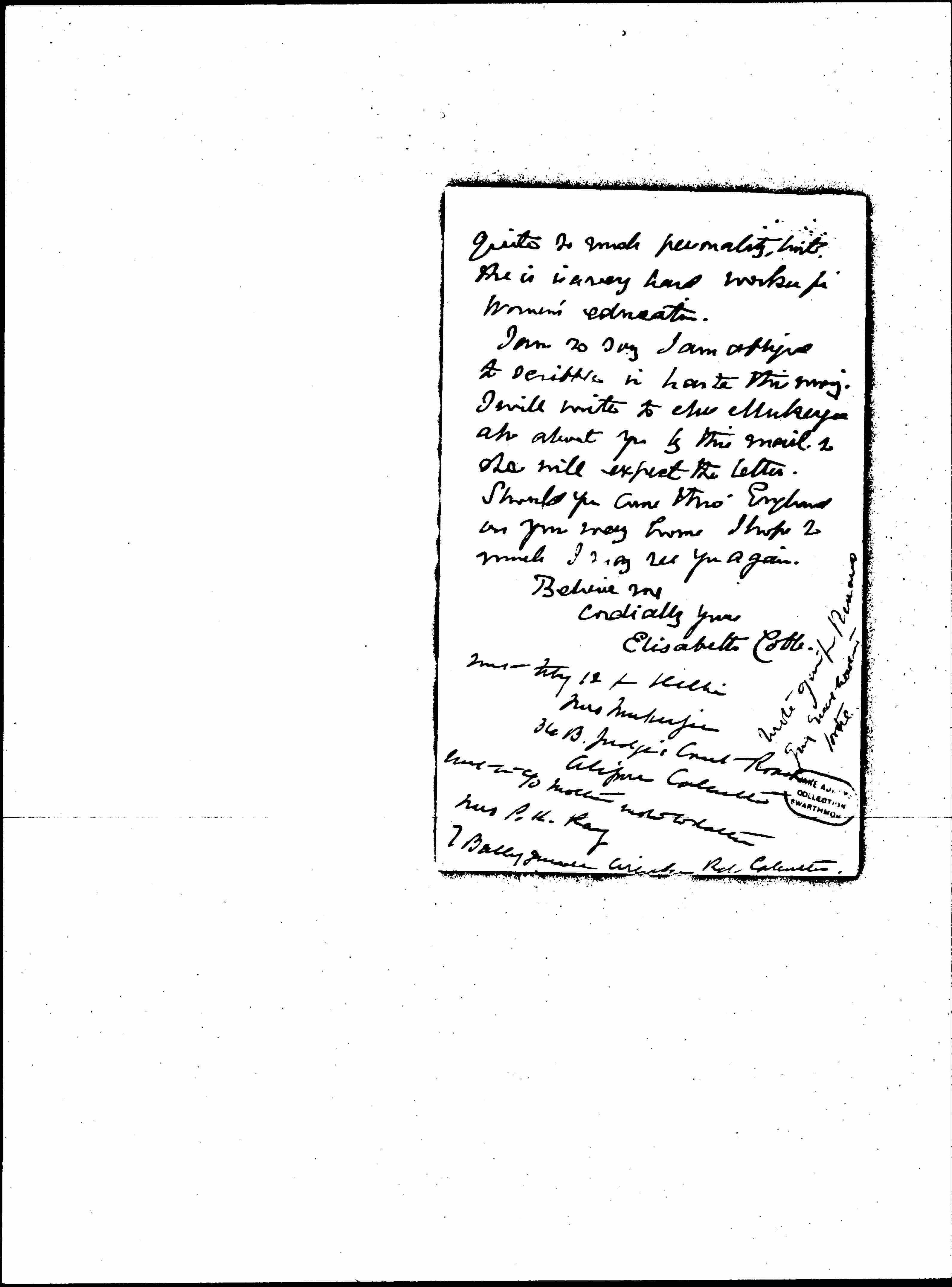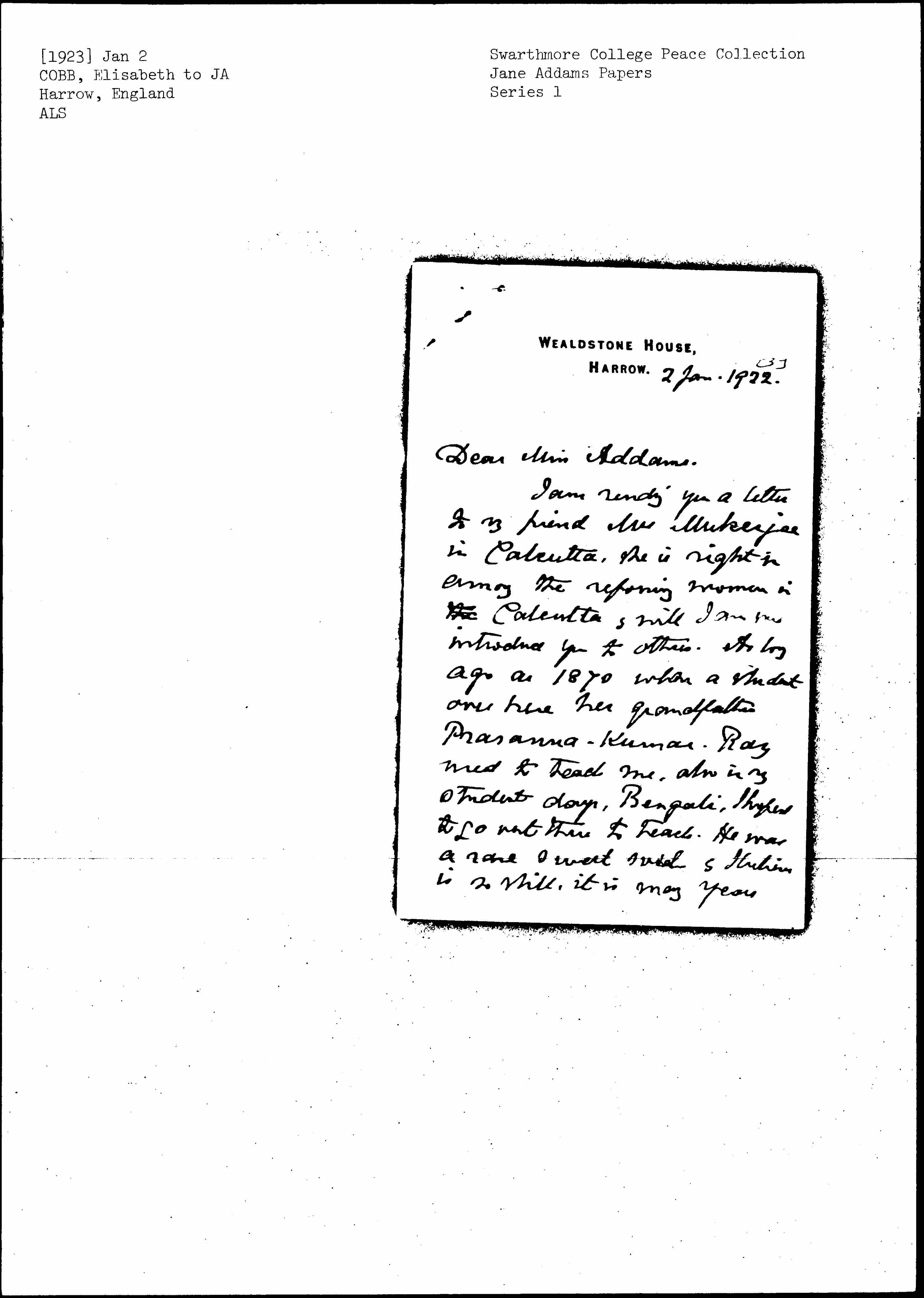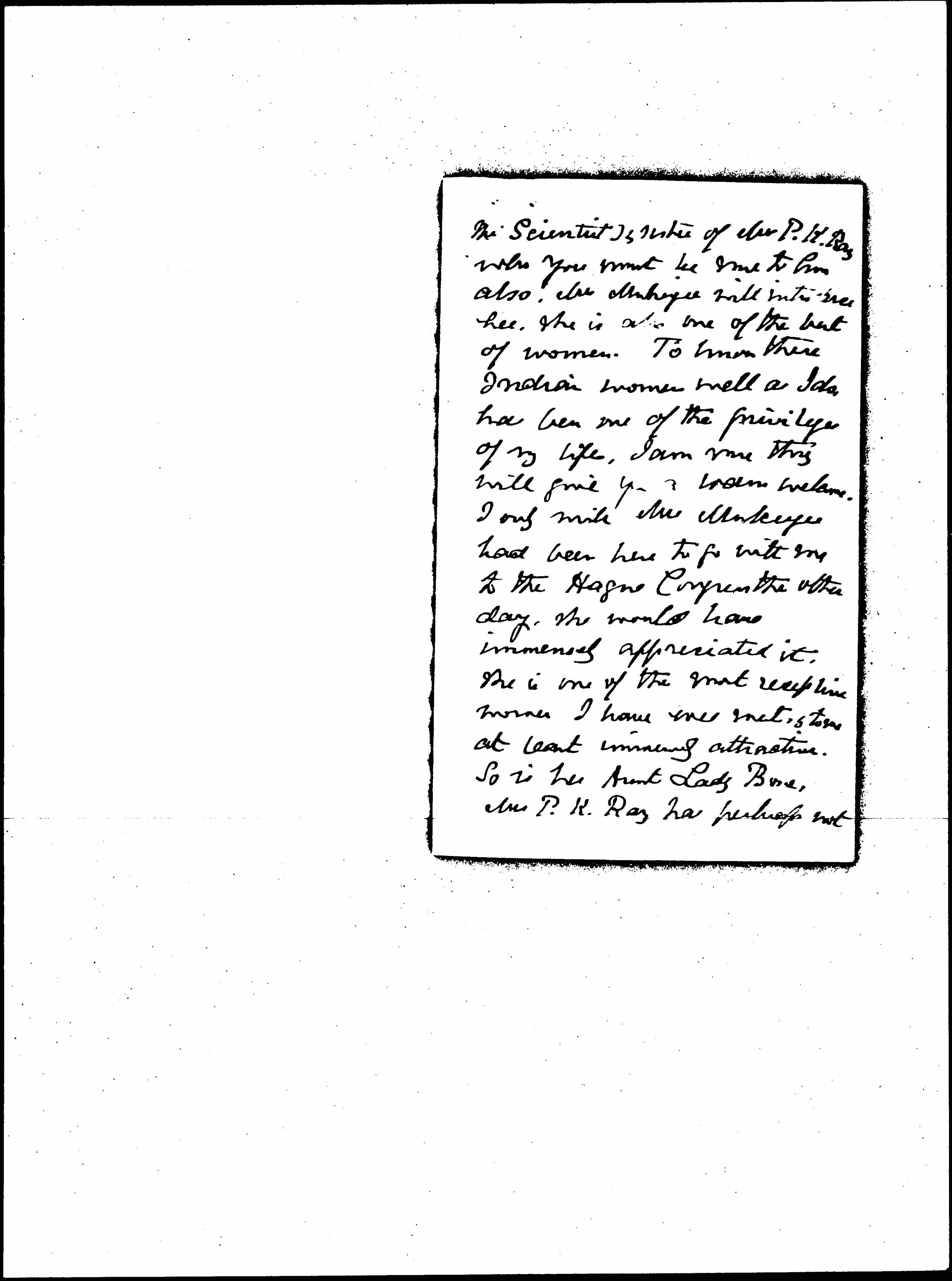 I am sending you a letter to my friend Mrs. [Mukherjee] in Calcutta, she is right in among the reforming women in the Calcutta & will I am sure introduce you to others. As long ago as 1870 when a student over here her grandfather Prasanna-Kumar Roy met to teach me, also in my student days, Bengali, I hoped to go out there to teach. He was a rare sweet [soul] & I believe is so still, it is many years [page 2] since I saw him. When he was at the Edinburgh University he shared the gold medal for Moral Philosophy with Lord Haldane, who still keeps up correspondence with him. His wife, a most active worker in Calcutta, has several times been in England, & last year their daughter Mrs [Mukherjee] came, to settle in her son & daughter at respective Colleges, so I have known 3 generations of them. She is one of the most intelligent people I have ever met, a sweet "all-round" woman. Then there is Lady Bose (wife of Sir J. C. Bose [page 3] the scientist) & sister of Mr P. K. Roy who you must be [sent to her] also. Mr [Mukherjee] will introduce her, she is also one of the best of women. To know these Indian women well as I do has been one of the privileges of my life. I am sure they will give you a warm welcome. I only wish [Mrs Mukherjee] had been here to go with me to The Hague Congress the other day, she would have immensely appreciated it. She is one of the most receptive women I have ever met & to me at least immensely attractive. So is her Aunt Lady Bose. Mrs P. K. Roy has perhaps not [page 4] quite so much personality, but she is a very hard worker for women's education.