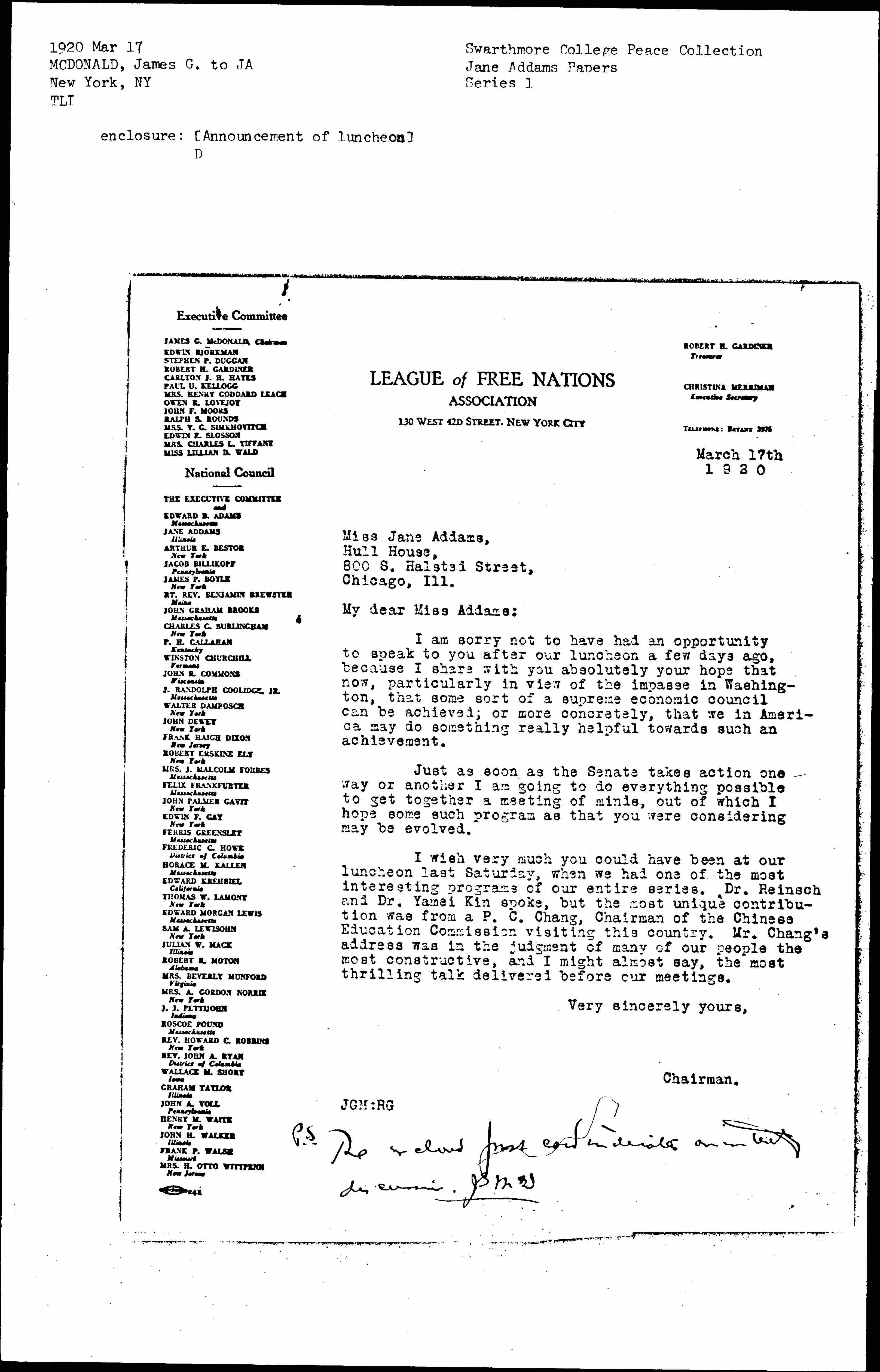 I wish very much you could have been at our luncheon last Saturday, when we had one of the most interesting programs of our entire series. Dr. Reinsch and Dr. Yamei Kin spoke, but the most unique contribution was from a P. C. Chang, Chairman of the Chinese Education Commission visiting this country. Mr. Chang's address was in the judgment of many of our people the most constructive, and I might almost say, the most thrilling talk delivered before our meetings.
