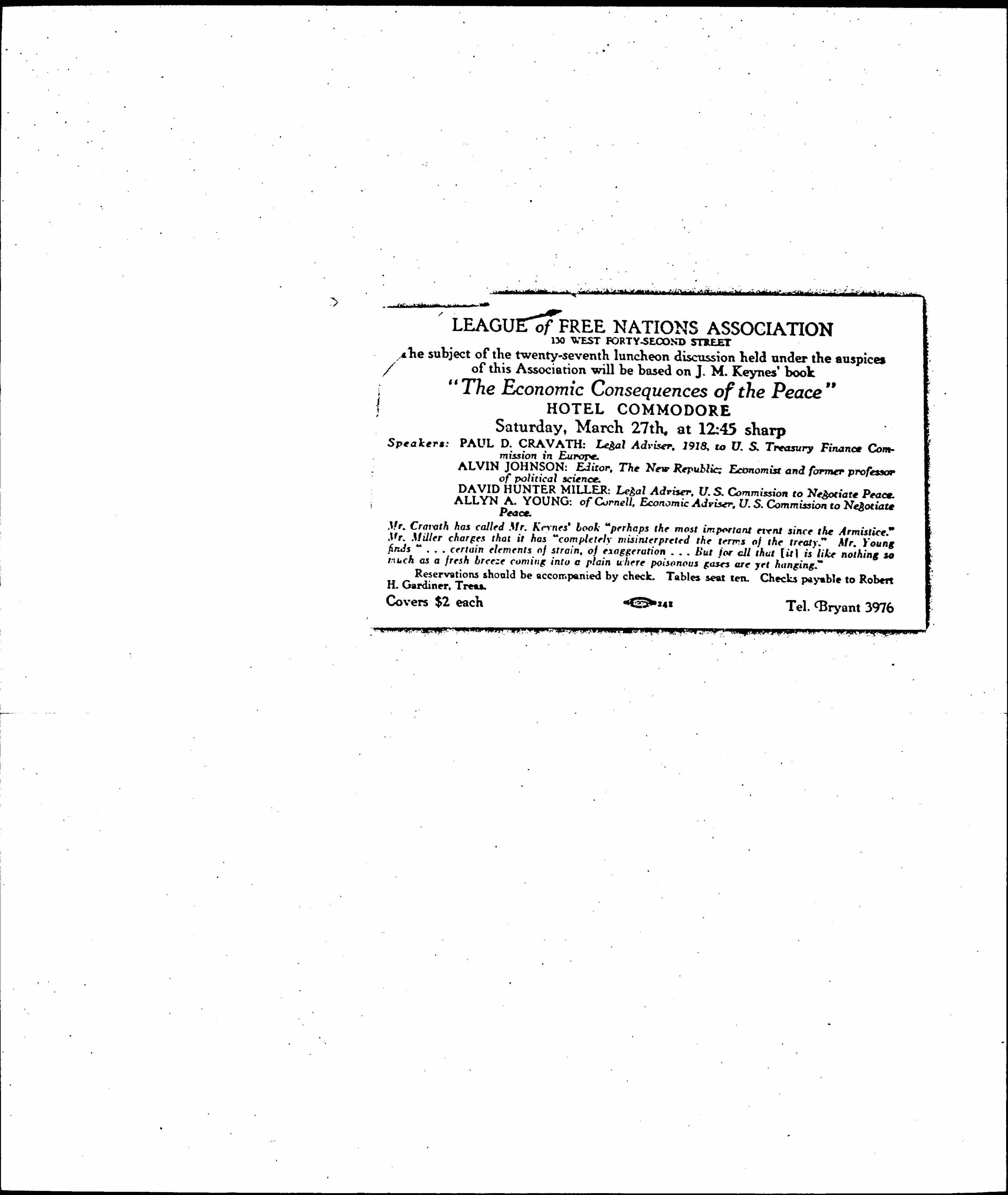 Reservations should be accompanied by check. Tables seat ten. Checks payable to Robert H. Gardiner, Treas.