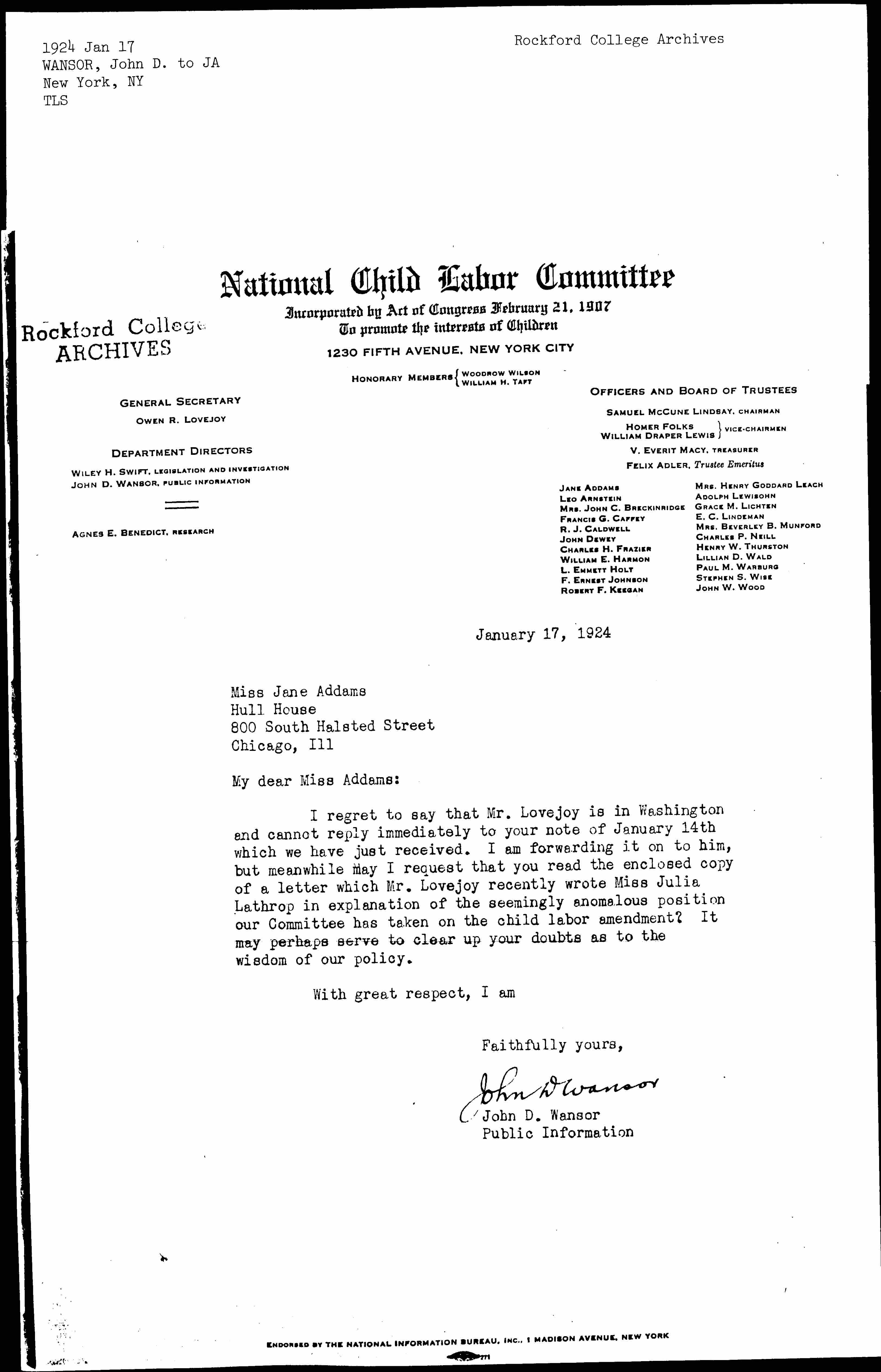 I regret to say that Mr. Lovejoy is in Washington and cannot reply immediately to your note of January 14th which we have just received. I am forwarding it on to him, but meanwhile may I request that you read the enclosed copy of a letter which Mr. Lovejoy recently wrote Miss Julia Lathrop in explanation of the seemingly anomalous position our Committee has taken on the child labor amendment? It may perhaps serve to clear up your doubts as to the wisdom of our policy.