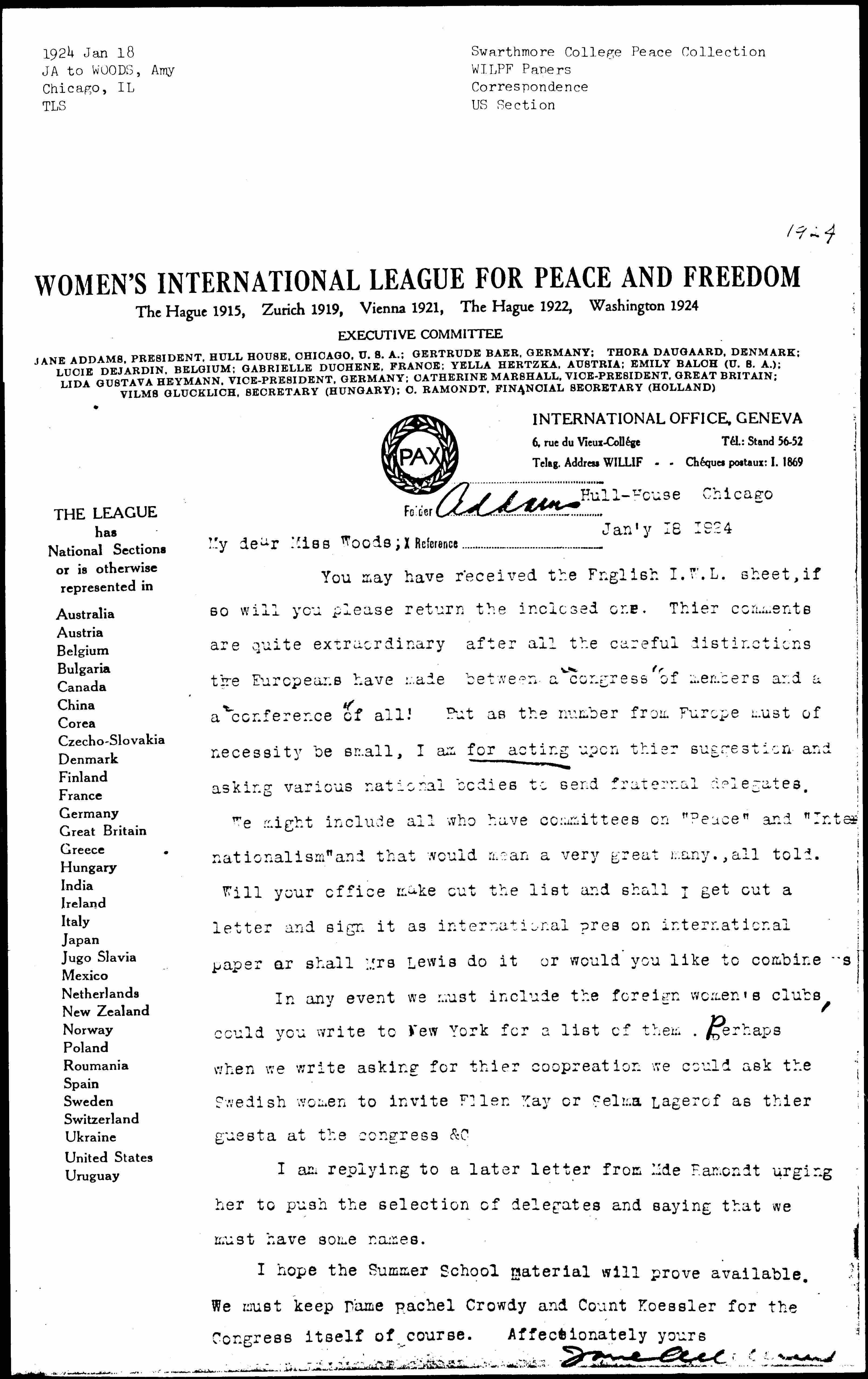 You may have received the English I.W.L. sheet, if so will you please return the [enclosed] one. Their comments are quite extraordinary after all the careful distinctions the Europeans have made between a "congress" of members and a "conference" of all! But as the number from Europe must of necessity be small, I am for acting upon their suggestion and asking various national bodies to send fraternal delegates.