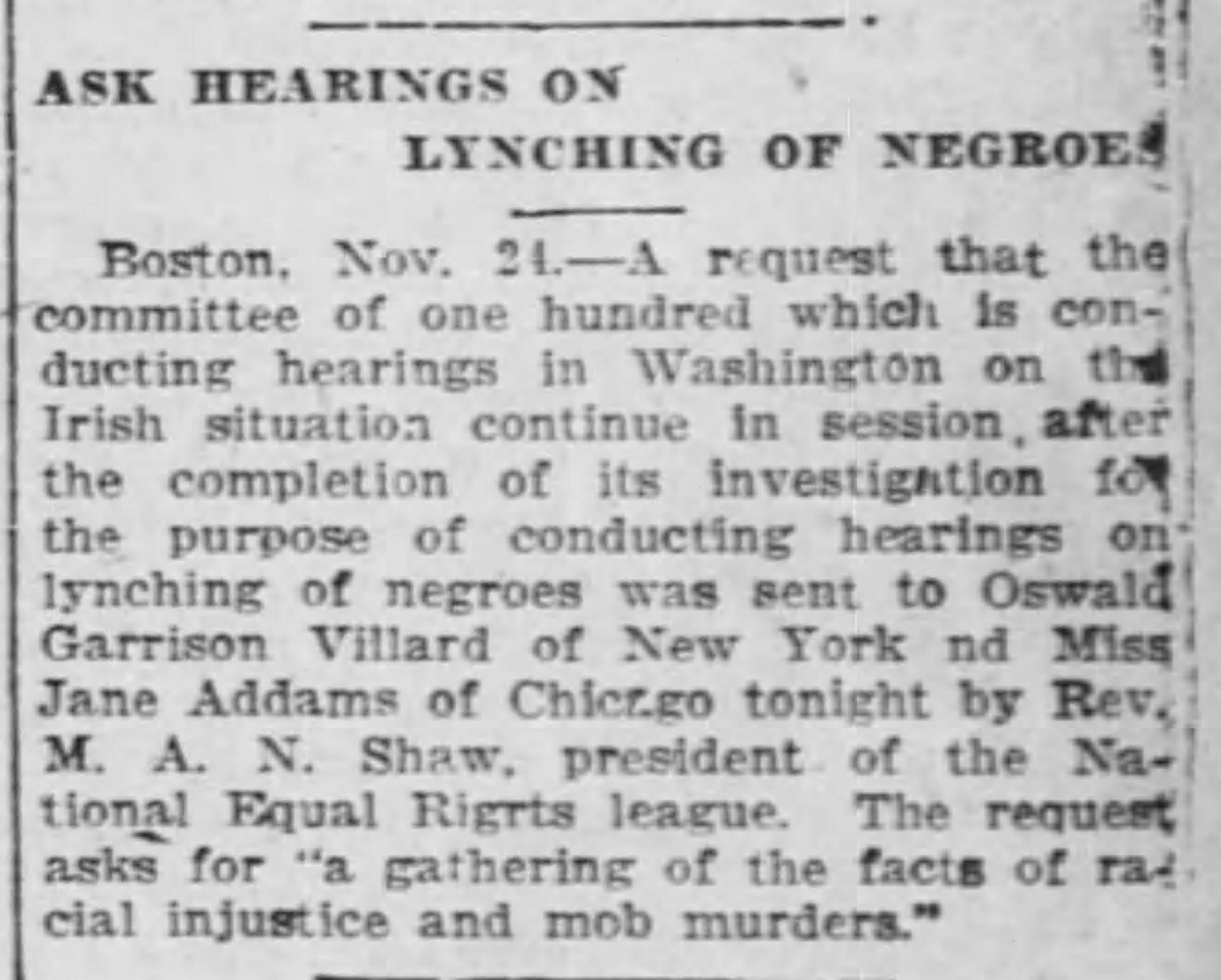 Boston, Nov. 24. -- A request that the committee of one hundred which is conducting hearings in Washington on the Irish situation continue in session, after the completion of its investigation for the purpose of conducting hearings on lynching of negroes was sent to Oswald Garrison Villard of New York [and] Miss Jane Addams of Chicago tonight by Rev. M. A. N. Shaw, president of the National Equal Rights League. The request asks for "a gathering of the facts of racial injustice and mob murders."