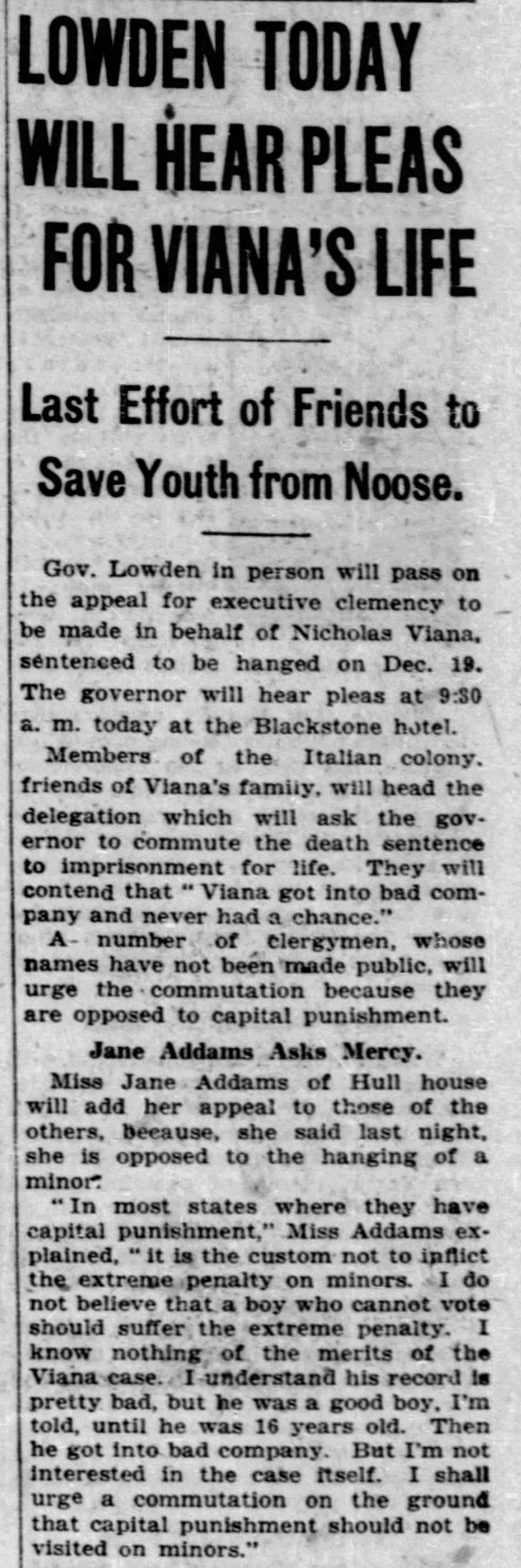 "In most states where they have capital punishment," Miss Addams explained, "it is the custom not to inflict the extreme penalty on minors. I do not believe that a boy who cannot vote should suffer the extreme penalty. I know nothing of the merits of the Viana case. I understand his record is pretty bad, but he was a good boy, I'm told, until he was 16 years old. Then he got into bad company. But I'm not interested in the case itself. I shall urge a commutation on the ground that capital punishment should not be visited on minors."