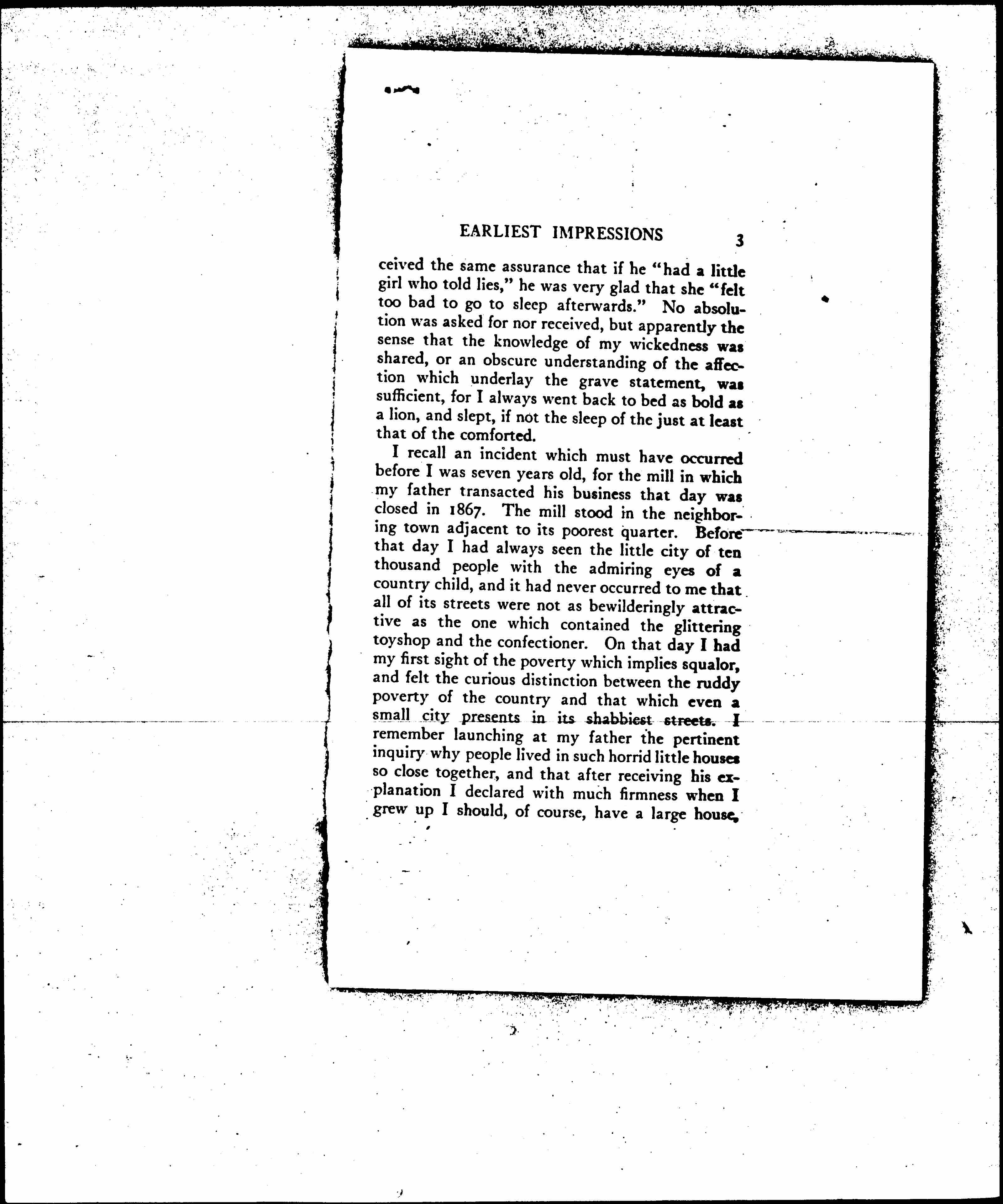 I recall an incident which must have occurred before I was seven years old, for the mill in which my father transacted his business that day was closed in 1867. The mill stood in the neighboring town adjacent to its poorest quarter. Before that day I had always seen the little city of ten thousand people with the admiring eyes of a country child, and it had never occurred to me that all of its streets were not as bewilderingly attractive as the one which contained the glittering toyshop and the confectioner. On that day I had my first sight of the poverty which implies squalor, and felt the curious distinction between the ruddy poverty of the country and that which even a small city presents in its shabbiest streets. I remember launching at my father the pertinent inquiry why people lived in such horrid little houses so close together, and that after receiving his explanation I declared with much firmness when I grew up I should, of course, have a large house,