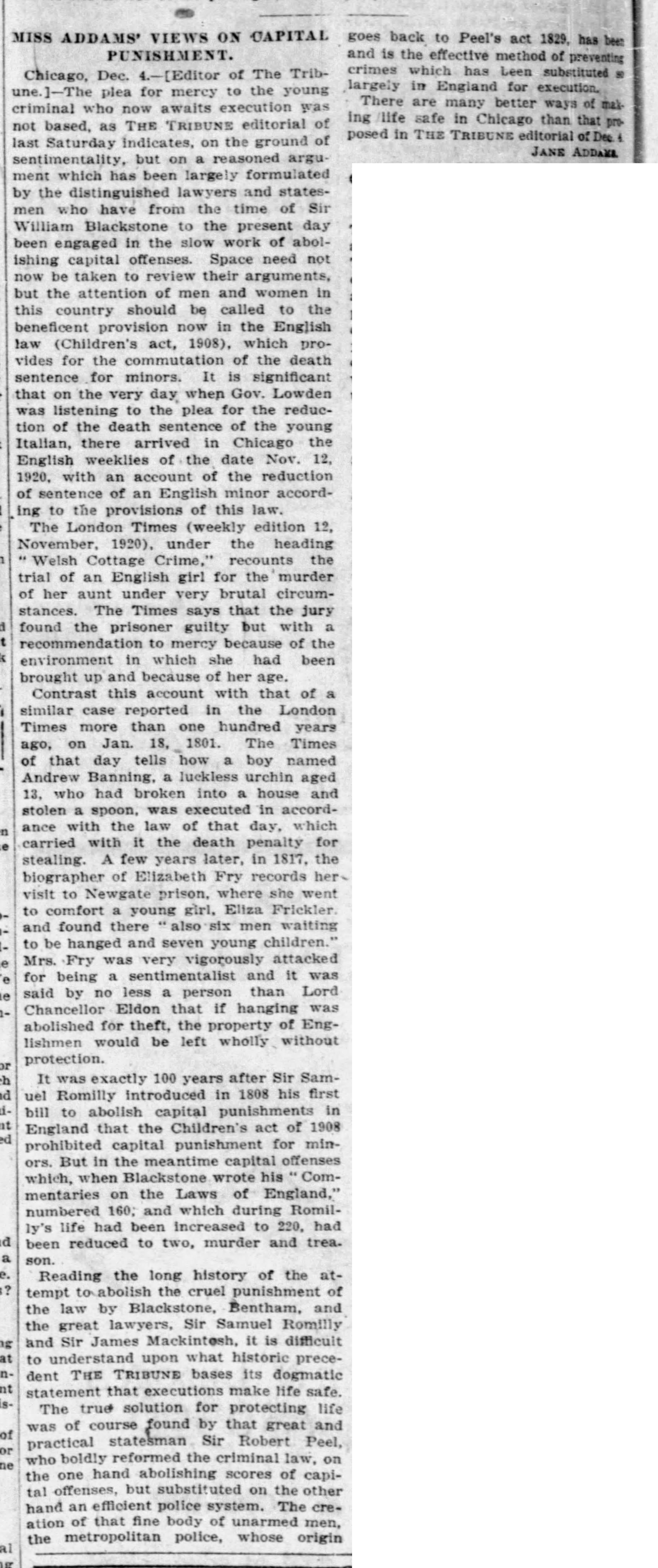 Chicago, Dec. 4. -- {Editor of The Tribune.} -- The plea for mercy to the young criminal who now awaits execution was not based, as THE TRIBUNE editorial of last Saturday indicates, on the ground of sentimentality, but on a reasoned argument which has been largely formulated by the distinguished lawyers and statesmen who have from the time of Sir William Blackstone to the present day been engaged in the slow work of abolishing capital offenses. Space need not now be taken to review their arguments, but the attention of men and women in this country should be called to the beneficent provision now in the English law (Children’s Act, 1908), which provides for the commutation of the death sentence for minors. It is significant that on the very day when Governor Lowden was listening to the plea for the reduction of the death sentence of the young Italian, there arrived in Chicago the English weeklies of the date Nov. 12, 1920, with an account of the reduction of sentence of an English minor according to the provisions of this law.