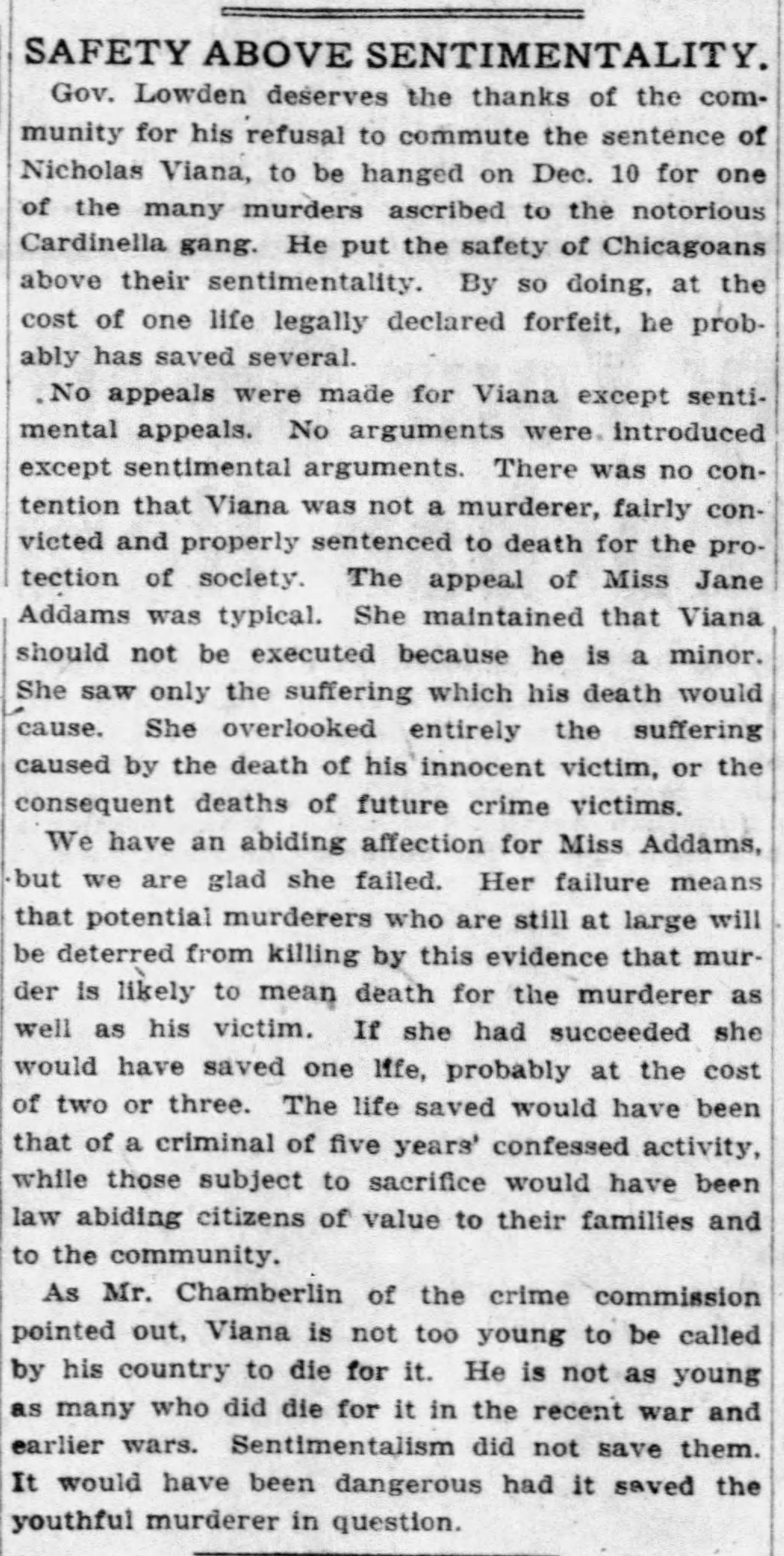 We have an abiding affection for Miss Addams, but we are glad she failed. Her failure means that potential murderers who are still at large will be deterred from killing by this evidence that murder is likely to mean death for the murderer as well as his victim. If she had succeeded she would have saved one life, probably at the cost of two or three. The life saved would have been that of a criminal of five years’ confessed activity, while those subject to sacrifice would have been law abiding citizens of value to their families and to the community.