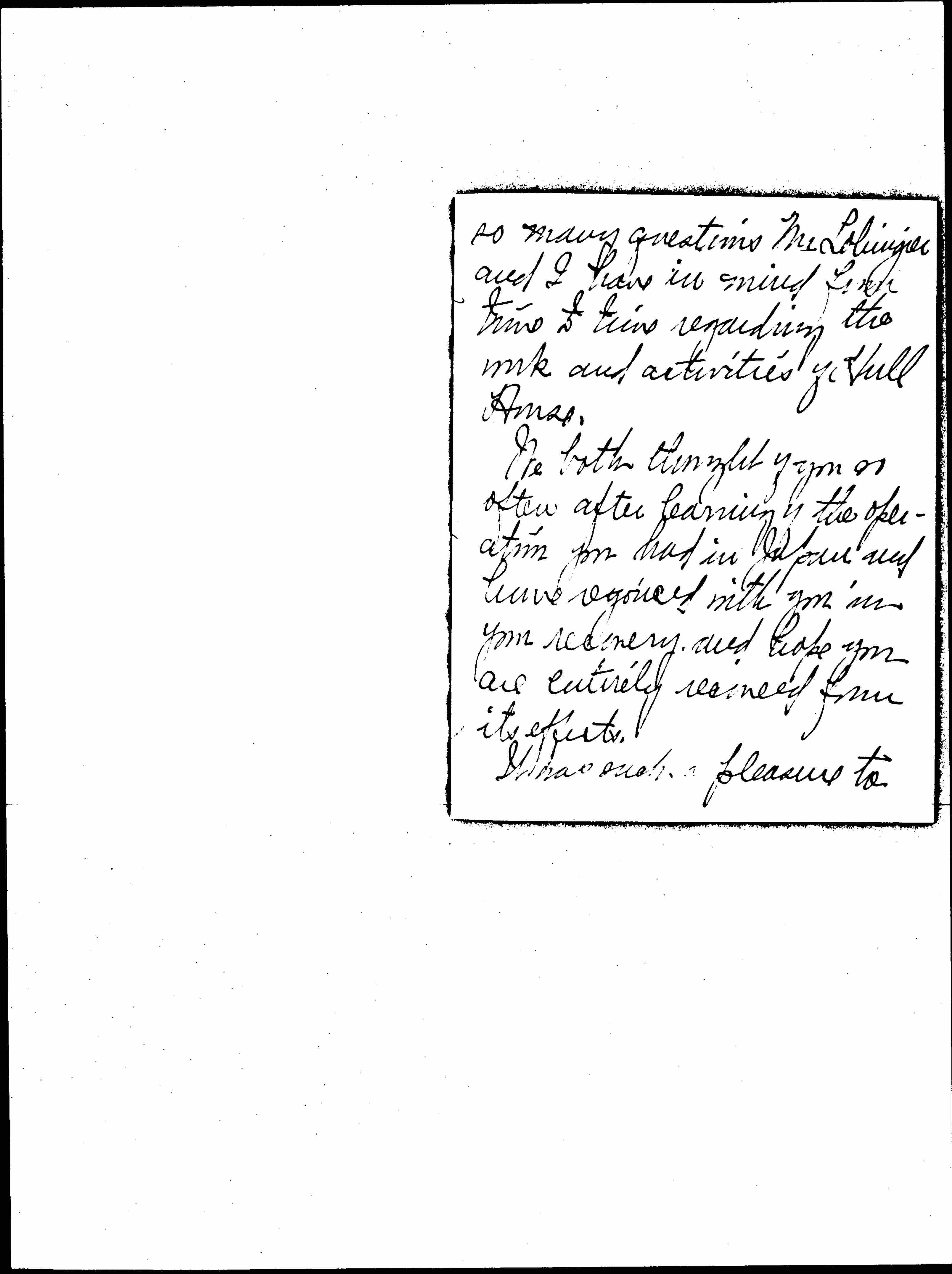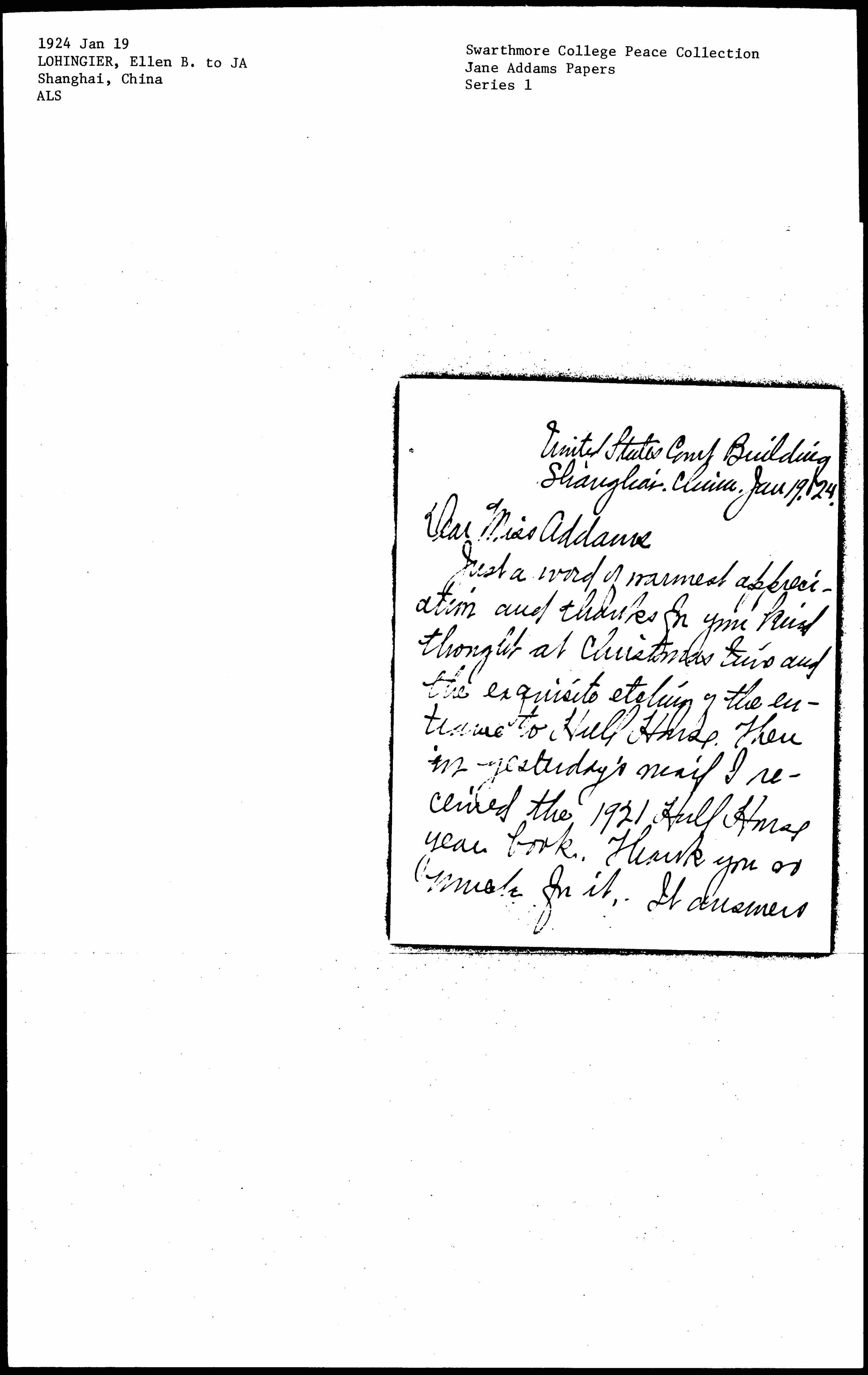 Just a word of warmest appreciation and thanks for your kind thought at Christmas time and the exquisite etching of the entrance to Hull House. Then in yesterday's mail I received the 1921 Hull House [yearbook]. Thank you so much for it. It answers [page 2] so many questions Mr. Lobingier and I have in mind from time to time regarding the work and activities of Hull House.