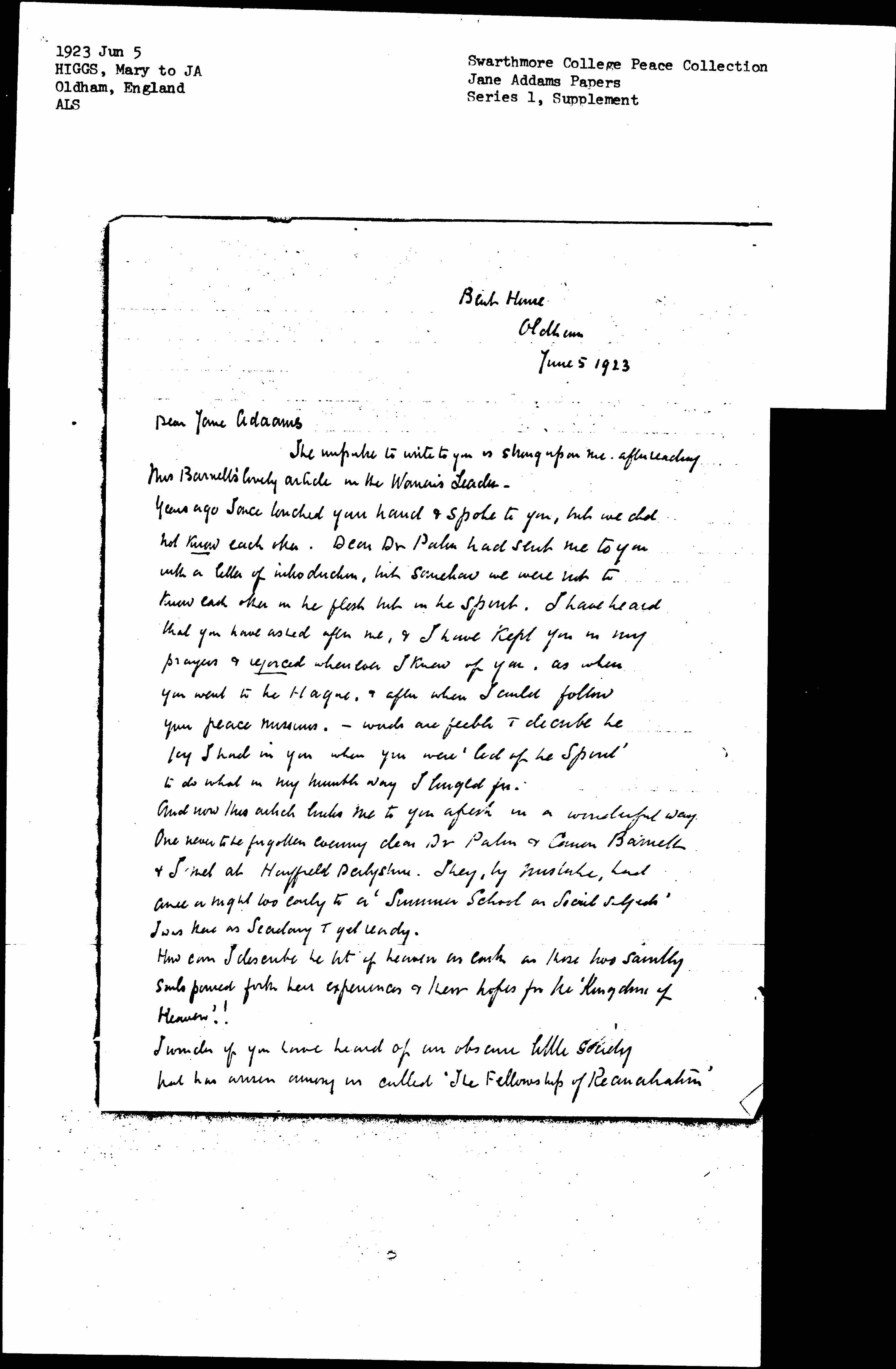 Years ago I once touched your hand & spoke to you, but we did not know each other. Dear Dr [Palin?] had sent me to you with a letter of introduction, but somehow we were not to know each other in the flesh but in the spirit. I have heard that you have asked after me, & I have kept you in my prayers & rejoiced whenever I knew of you, as when you went to The Hague, & after when I could follow your peace missions -- words are feeble to describe the joy I had in you when you were "led of the Spirit" to do what in my humble way I longed for.