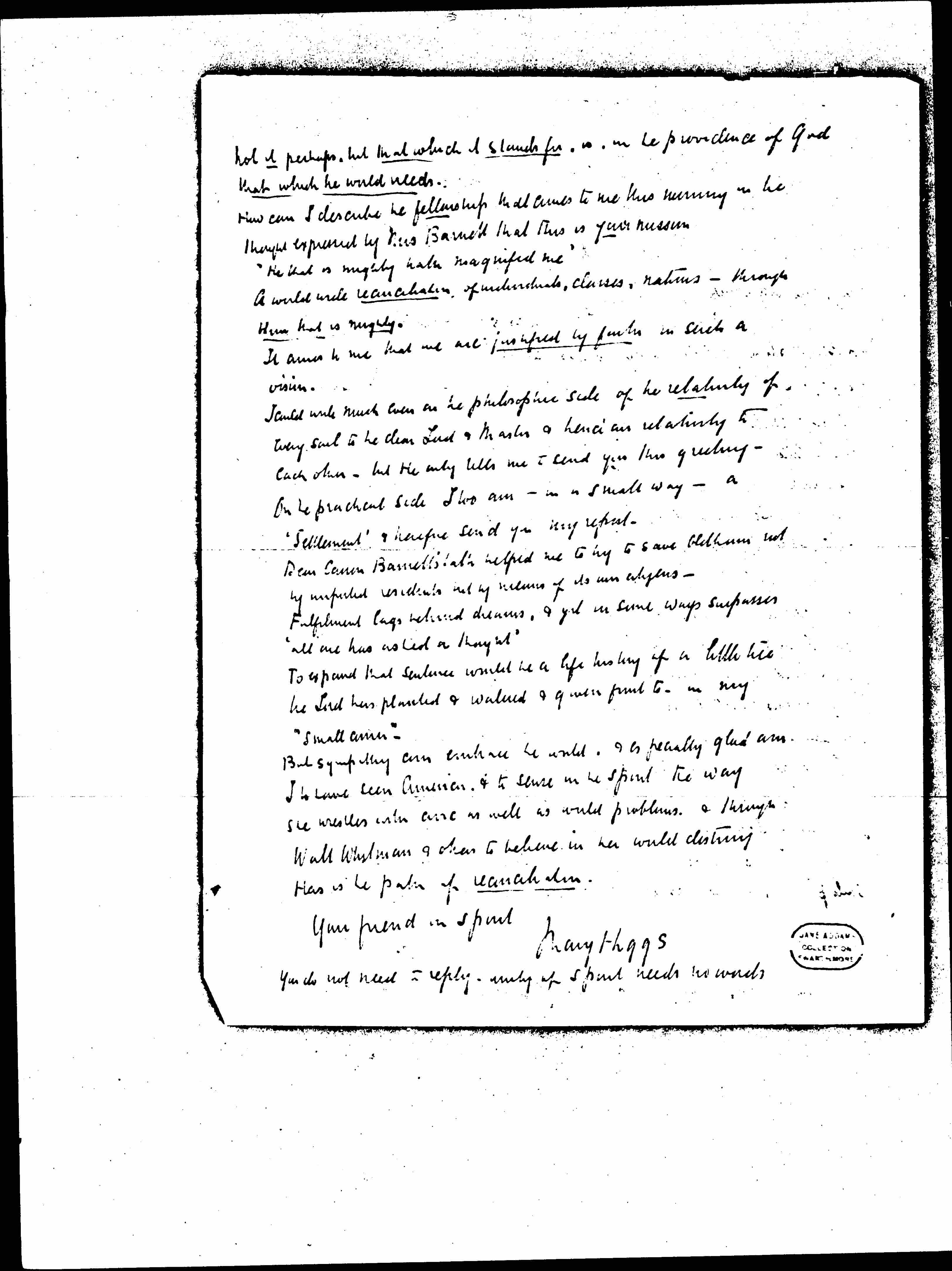 I could write much even as the philosophic [side] of the relativity of every soul to the dear Lord & Master & hence our relativity to each other -- but He only tells me to send you this greeting. On the practical side I too am -- in a small way -- a "Settlement" & therefore send you my report.