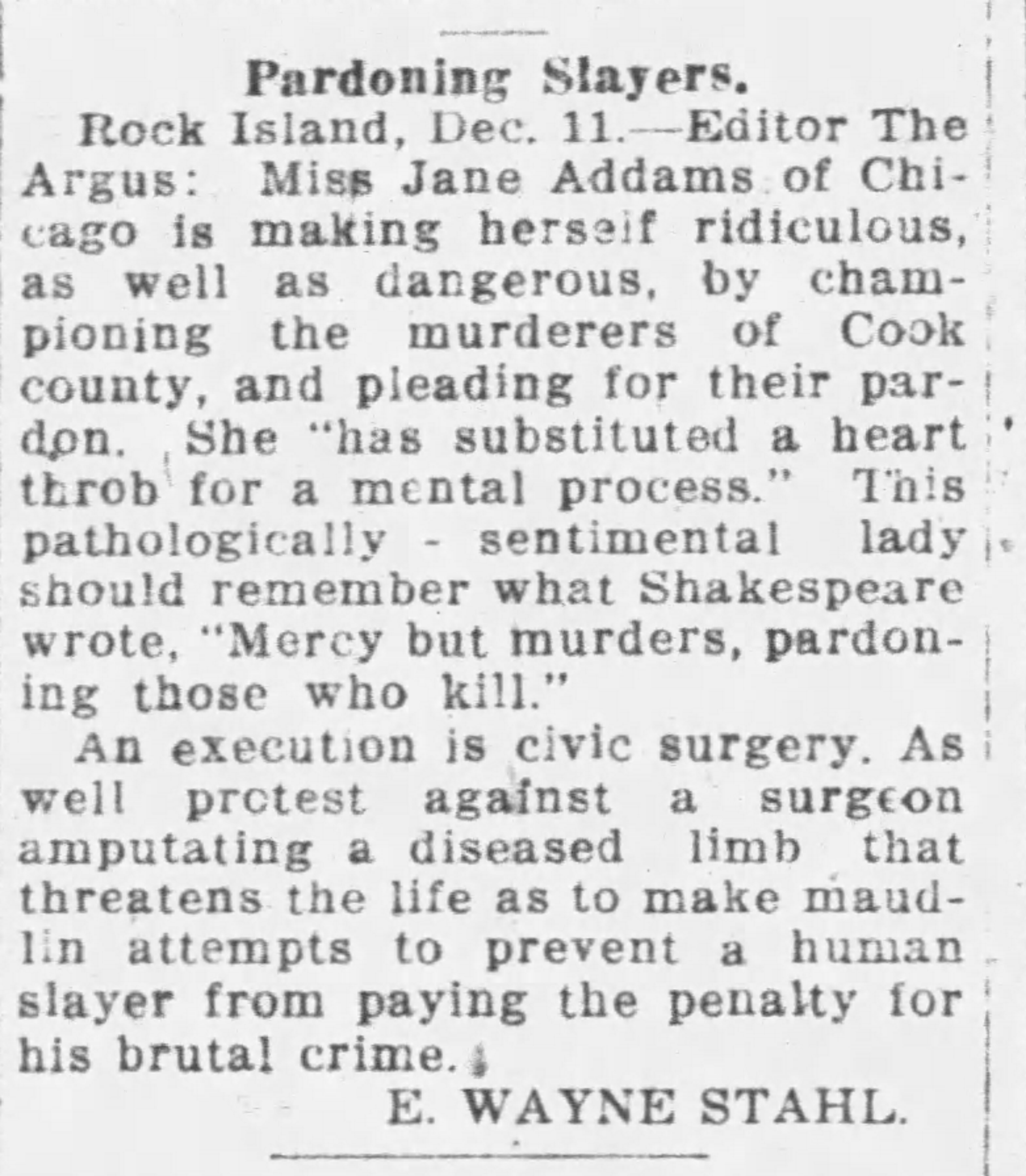 Rock Island, Dec. 11. -- Editor The Argus: Miss Jane Addams of Chicago is making herself ridiculous, as well as dangerous, by championing the murderers of Cook County, and pleading for their pardon. She "has substituted a heart throb for a mental process." This pathologically -- sentimental lady should remember what Shakespeare wrote, "Mercy but murders, pardoning those who kill."