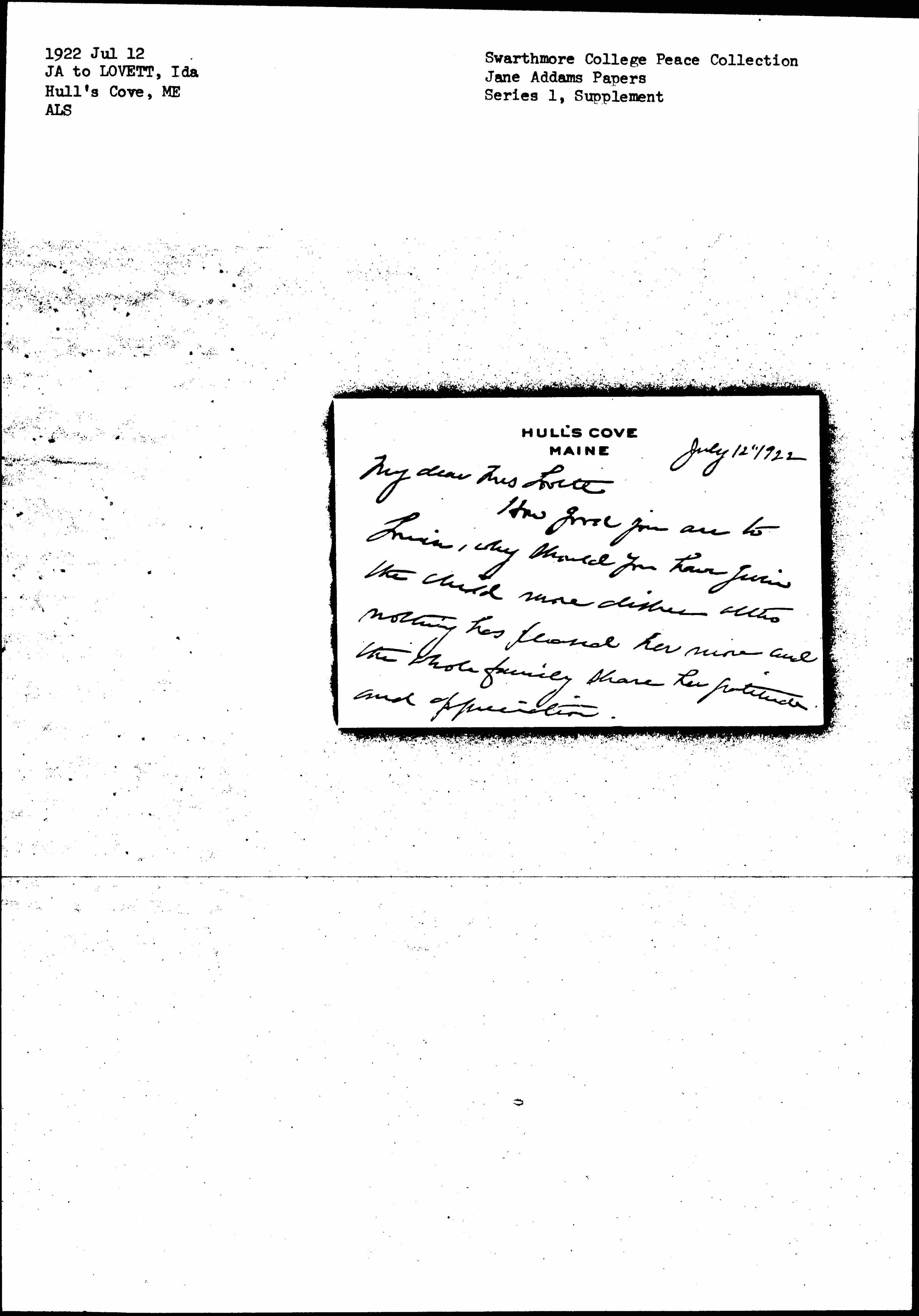 This island is beautiful albeit somewhat foggy which is of course bad for Mary's asthma. Is there any chance for you to get away, it would be so nice to have both Beatrice and yourself and we would plan a family party whenever you named the happy date. Mary unites with in love to you both. Always devotedly yours Jane Addams