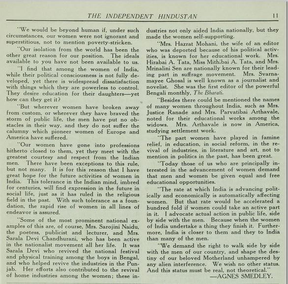 "Mrs. Hazrat Mohani, the wife of an editor who was deported because of his political activities, is known for her educational work. Mrs. [Herabai] A. Tata, Miss Mithibai A. Tata, and Mrs. Mrinalini Sen are nationally known for their leading part in suffrage movement. Mrs. Svarnamayee Ghosal is well known as a journalist and novelist. She was the first editor of the powerful Bengali monthly, The Bharati.