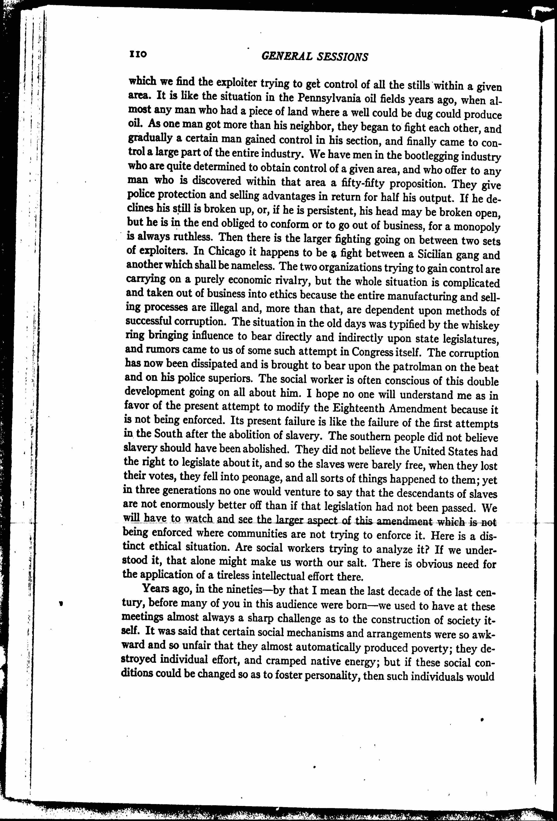 Let us take, for instance, this whole question of bootlegging. Some of us from communities in which bootlegging is practiced -- sometimes flagrantly, and always clandestinely. We discover two things -- that there are the economic aspects and the ethical aspects. In its economic aspect we see a great industry, formerly carried on in factories -- as we may designate the distilleries and breweries -- becoming decentralized and going back into the home-industry stage. This is just the reverse of what has happened in other industries. It is now, however, emerging from the home and gradually entering a second period in [page 3] which we find the exploiter trying to get control of all the stills within a given area. It is like the situation in the Pennsylvania oil fields years ago, when almost any man who had a piece of land where a well could be dug could produce oil. As one man got more than his neighbor, they began to fight each other, and gradually a certain man gained control in his section, and finally came to control a large part of the entire industry. We have men in the bootlegging industry who are quite determined to obtain control of a given area, and who offer to any man who is discovered within that area a fifty-fifty proposition. They give police protection and selling advantages in return for half his output. If he declines his still is broken up, or, if he is persistent, his head may be broken open, but he is in the end obliged to conform or to go out of business, for a monopoly is always ruthless. Then there is the larger fighting going on between two sets of exploiters. In Chicago it happens to be a fight between a Sicilian gang and another which shall be nameless. The two organizations trying to gain control are carrying on a purely economic rivalry, but the whole situation is complicated and taken out of business into ethics because the entire manufacturing and selling processes are illegal and, more than that, are dependent upon methods of successful corruption. The situation in the old days was typified by the whiskey ring bringing influence to bear directly and indirectly upon state legislatures, and rumors came to us of some such attempt in Congress itself. The corruption has now been dissipated and is brought to bear upon the patrolman on the beat and on his police superiors. The social worker is often conscious of this double development going on all about him. I hope no one will understand me as in favor of the present attempt to modify the Eighteenth Amendment because it is not being enforced. Its present failure is like the failure of the first attempts in the South after the abolition of slavery. The southern people did not believe slavery should have been abolished. They did not believe the United States had the right to legislate about it, and so the slaves were barely free, when they lost their votes, they fell into peonage, and all sorts of things happened to them; yet in three generations no one would venture to say that the descendants of slaves are not enormously better off than if that legislation had not been passed. We will have to watch and see the larger aspect of this amendment which is not being enforced where communities are not trying to enforce it. Here is a distinct ethical situation. Are social workers trying to analyze it? If we understood it, that alone might make us worth out salt. There is obvious need for the application of a tireless intellectual effort there.