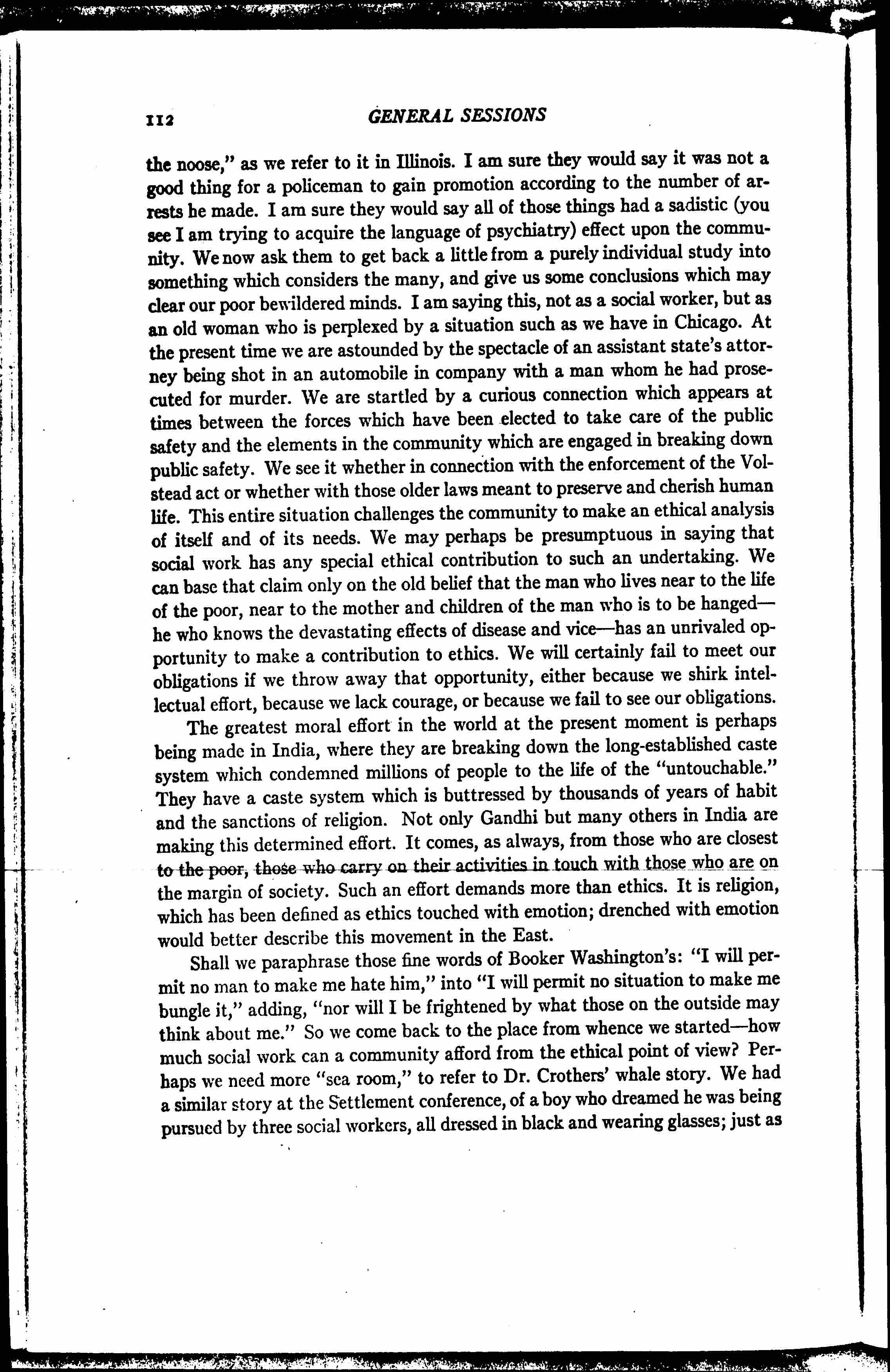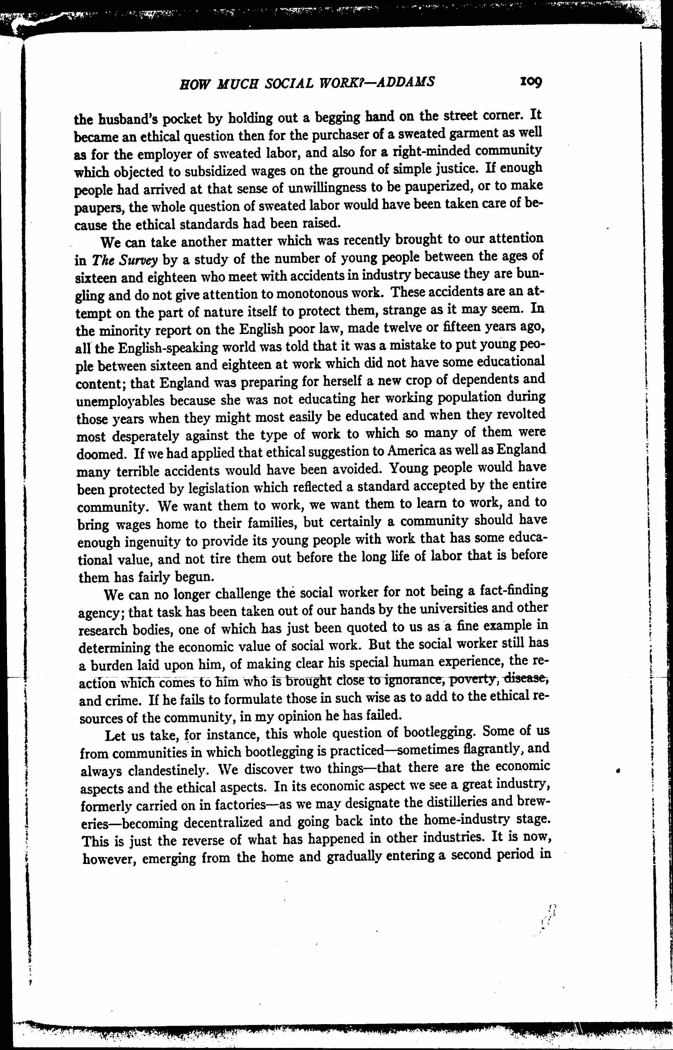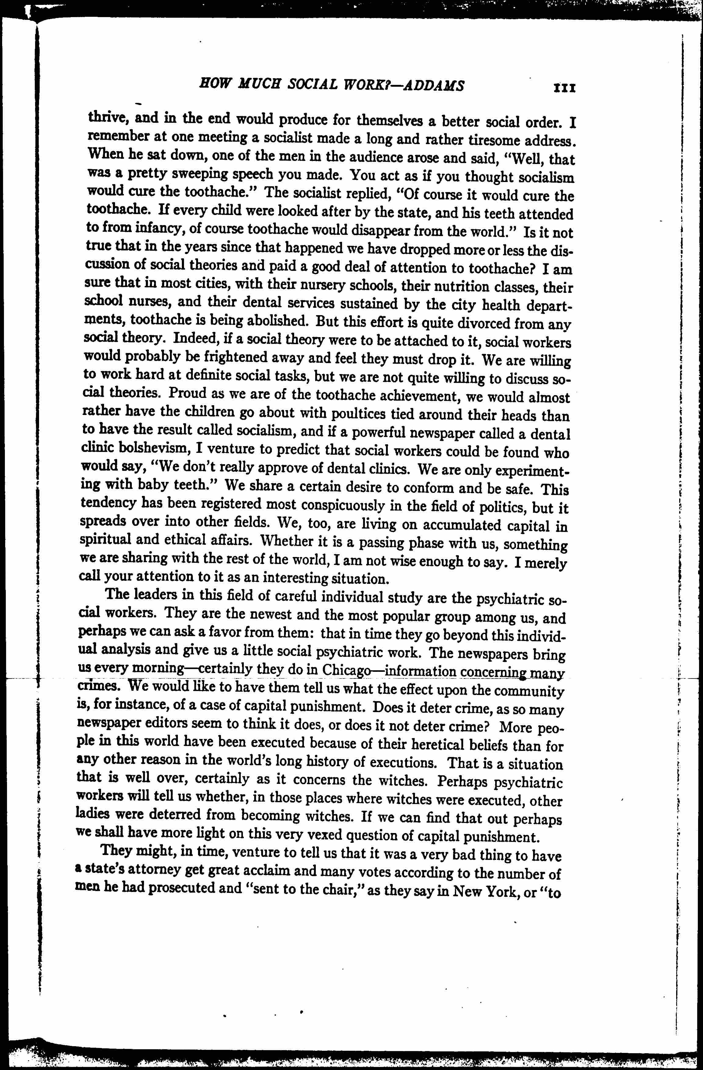 They might, in time, venture to tell us that it was a very bad thing to have a state's attorney get great acclaim and many votes according to the number of men he had prosecuted and "sent to the chair," as they say in New York, or "to [page 5] the noose,” as we refer to it in Illinois. I am sure they would say it was not a good thing for a policeman to gain promotion according to the number of arrests he made. I am sure they would say all of those things had a sadistic (you see I am trying to acquire the language of psychiatry) effect upon the community. We now ask them to get back a little from a purely individual study into something which considers the many, and give us some conclusions which may clear our poor bewildered minds. I am saying this, not as a social worker, but as an old woman who is perplexed by a situation such as we have in Chicago. At the present time we are astounded by the spectacle of an assistant state's attorney being shot in an automobile in company with a man whom he had prosecuted for murder. We are startled by a curious connection which appears at times between the forces which have been elected to take care of the public safety and the elements in the community which are engaged in breaking down public safety. We see it whether in connection with the enforcement of the Volstead act or whether with those older laws meant to preserve and cherish human life. This entire situation challenges the community to make an ethical analysis of itself and of its needs. We may perhaps be presumptuous in saying that social work has any special ethical contribution to such an undertaking. We can base that claim only on the old belief that the man who lives near to the life of the poor, near to the mother and children of the man who is to be hanged -- he who knows the devastating effects of disease and vice -- has an unrivaled opportunity to make a contribution to ethics. We will certainly fail to meet our obligations if we throw away that opportunity, either because we shirk intellectual effort, because we lack courage, or because we fail to see our obligations.
