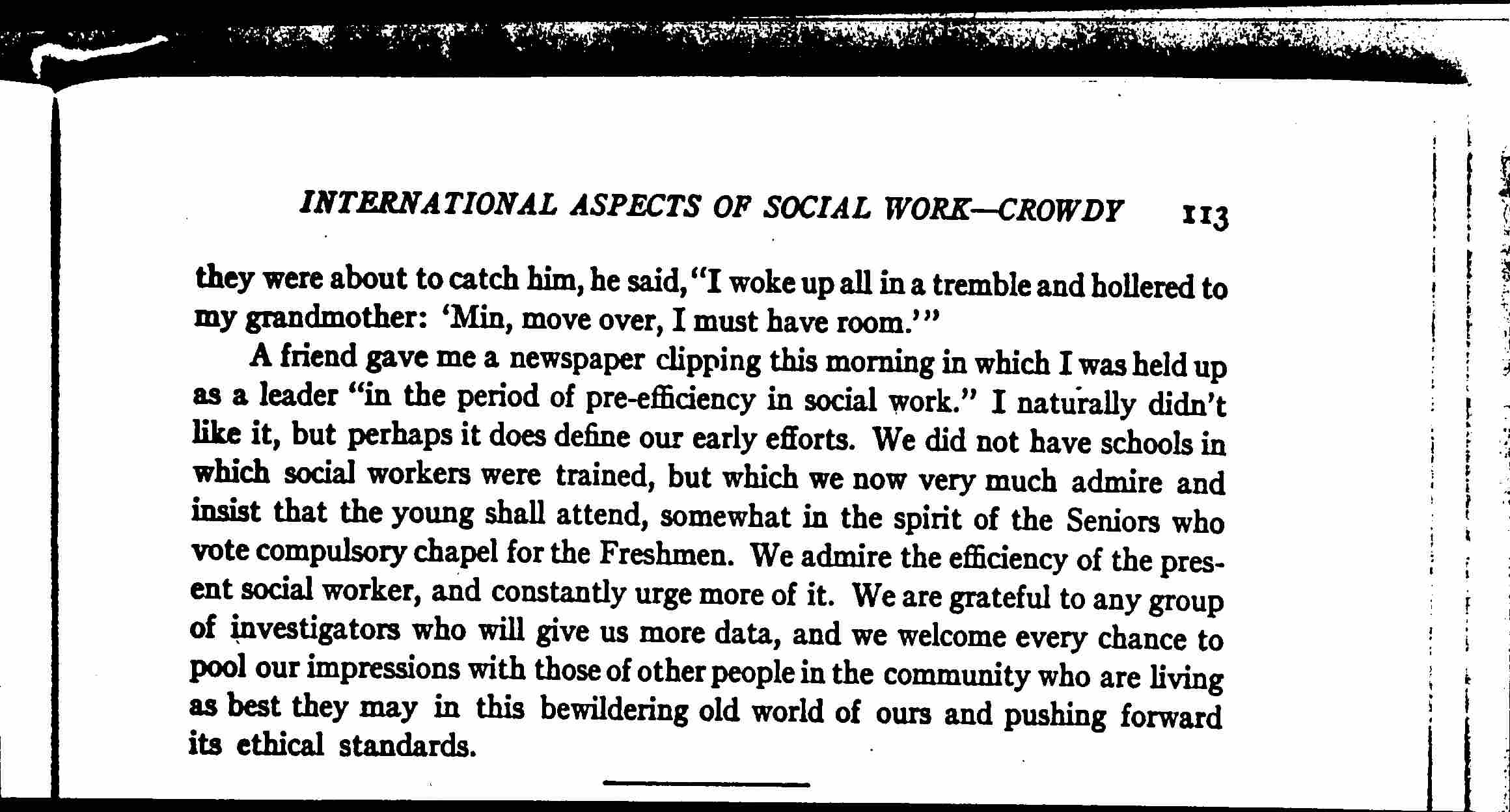 Shall we paraphrase those fine words of Booker Washington's: "I will permit no man to make me hate him," into "I will permit no situation to make me bungle it," adding, "nor will I be frightened by what those on the outside may think about me." So we come back to the place from whence we started -- how much social work can a community afford from the ethical point of view? Perhaps we need more "sea room," to refer to Dr. Crothers' whale story. We had a similar story at the Settlement conference, of a boy who dreamed he was being pursued by three social workers, all dressed in black and wearing glasses; just as [page 6] they were about to catch him, he said, "I woke up all in a tremble and hollered to my grandmother: 'Min, move over, I must have room.'"