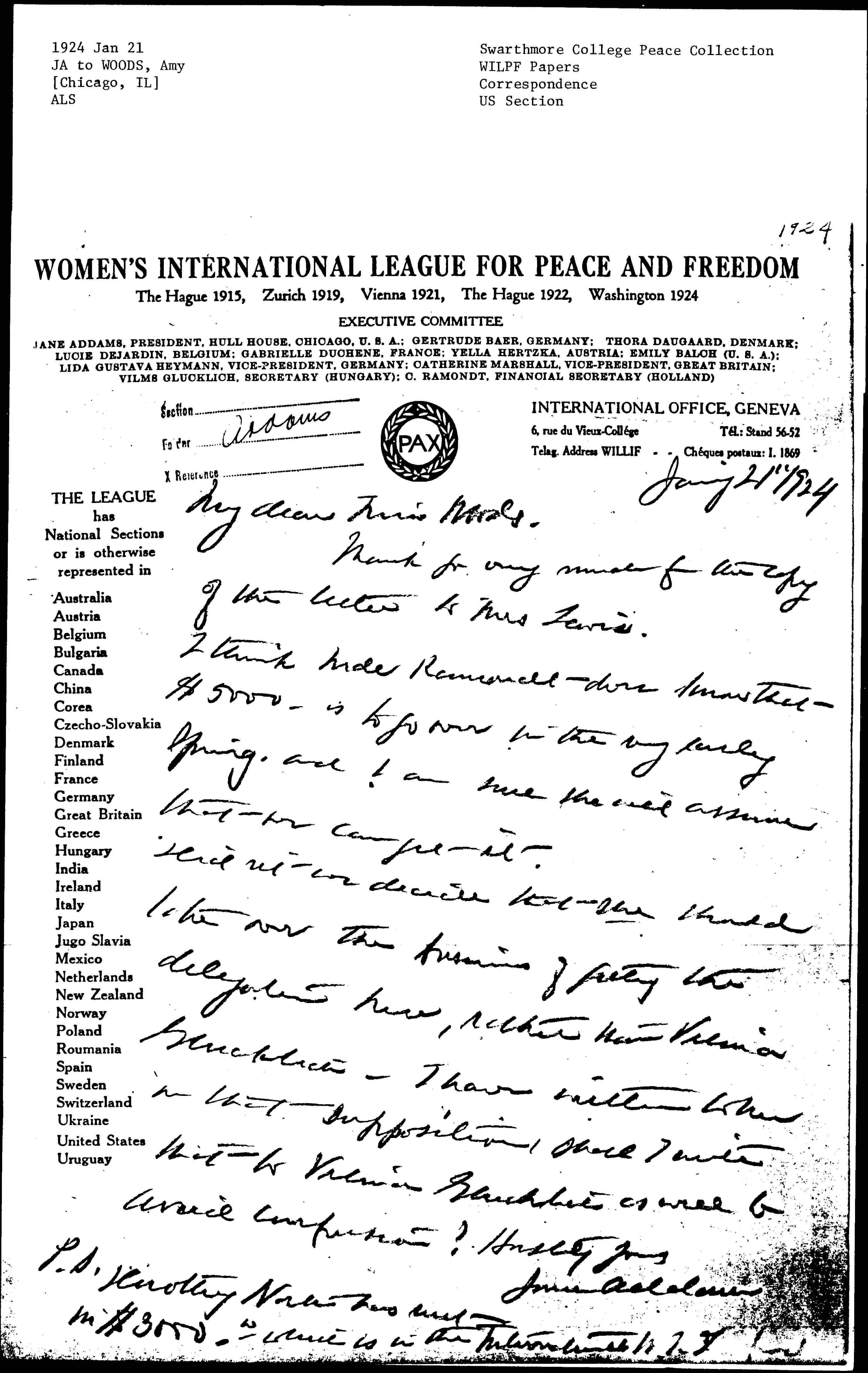 Didn't we decide that she should take over the business of getting the delegation here, rather than Vilma Glucklich. I have written to her in that supposition, shall I write that to Vilma Glucklich as well to avoid confusion? Hastily yours