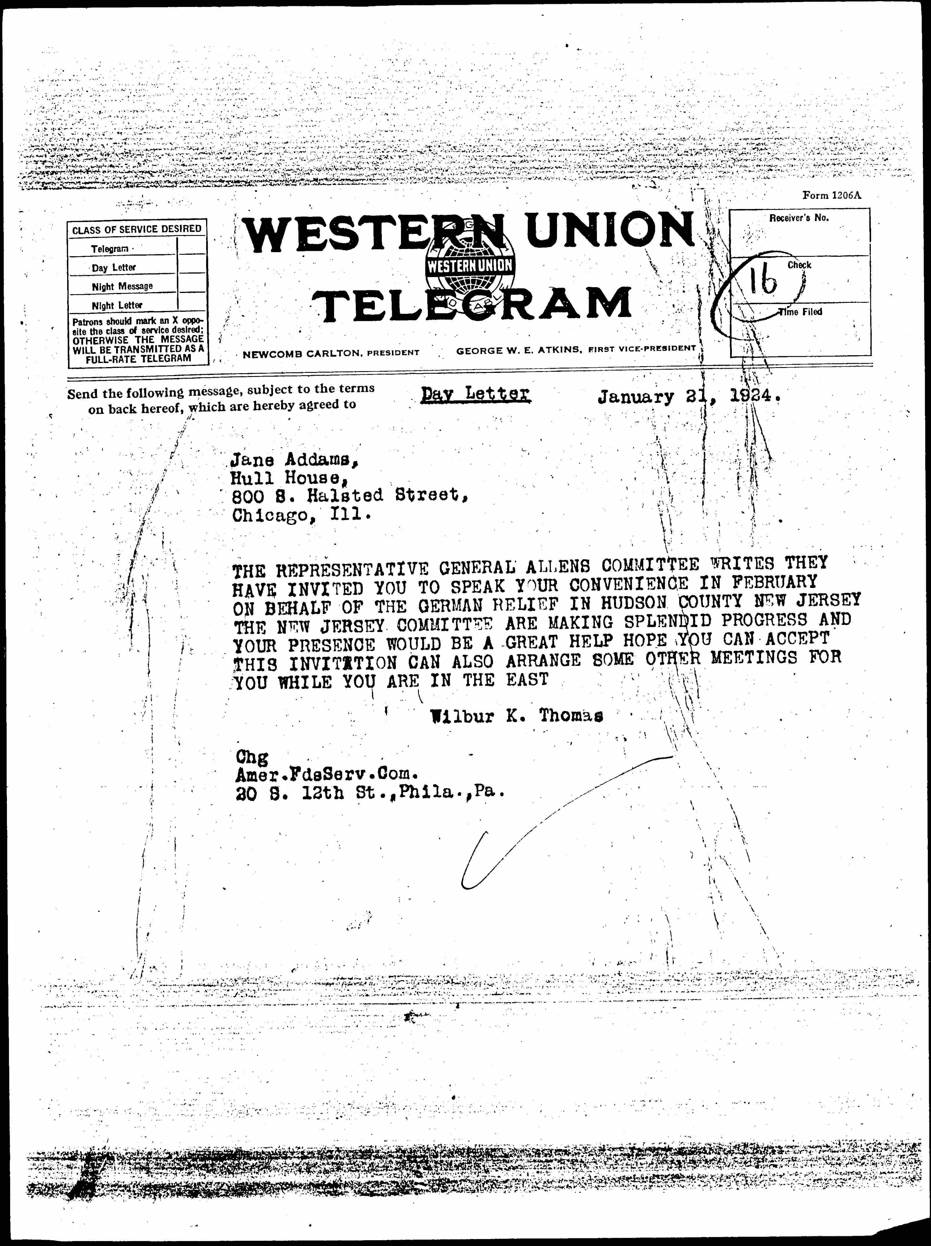 THE REPRESENTATIVE GENERAL ALLENS COMMITTEE WRITES THEY HAVE INVITED YOU TO SPEAK YOUR CONVENIENCE IN FEBRUARY ON BEHALF OF THE GERMAN RELIEF IN HUDSON COUNTY NEW JERSEY THE NEW JERSEY COMMITTEE ARE MAKING SPLENDID PROGRESS AND YOUR PRESENCE WOULD BE A GREAT HELP HOPE YOU CAN ACCEPT THIS INVITATION CAN ALSO ARRANGE SOME OTHER MEETINGS FOR YOU WHILE YOU ARE IN THE EAST