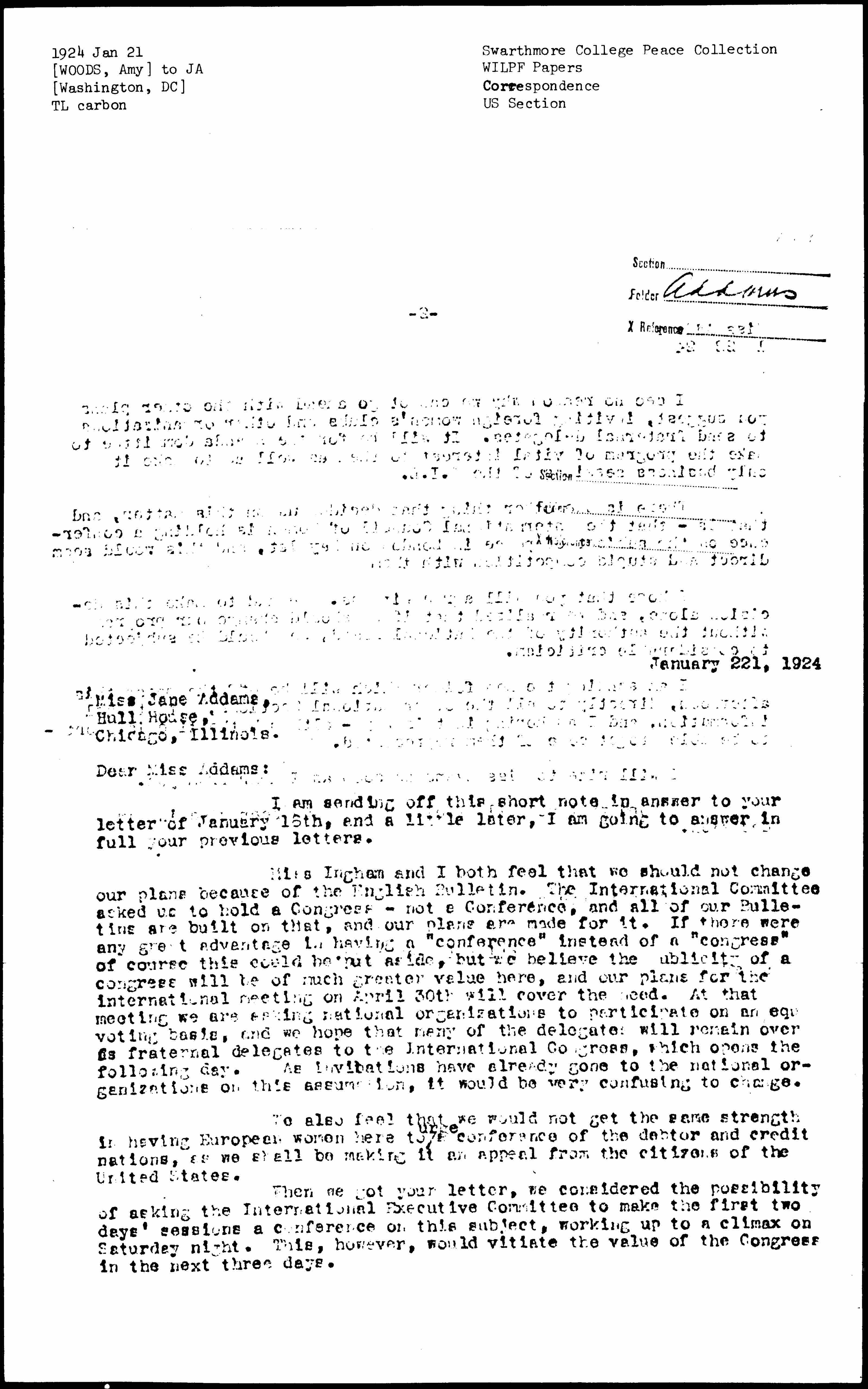 Miss Ingham and I both feel that we should not change our plans because of the English Bulletin. The International Committee asked us to hold a Congress -- not a Conference, and all of our Bulletins are built on that, and our plans are made for it. If there were any great advantage in having a "conference" instead of a "congress" of course this could be put aside, but we believe the publicity of a congress will be of much greater value here, and our plans for the international meeting on April 30th will cover the need. At that meeting we are asking national organizations to participate on an equal voting basis, and we hope that many of the delegates will remain over as fraternal delegates to the International Congress, which opens the following day. As invitations have already gone to the national organizations on this assumption, it would be very confusing to change.