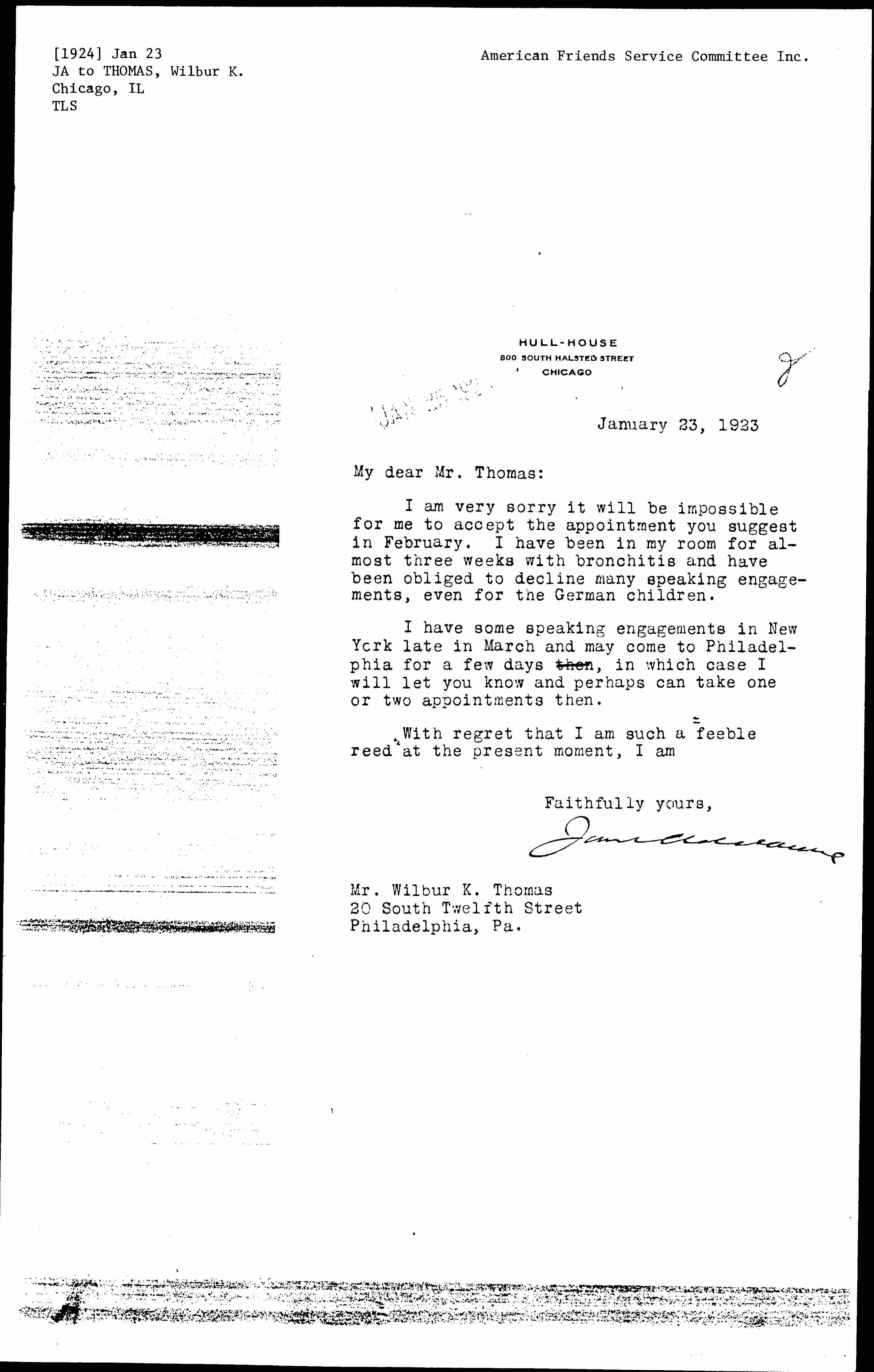 I am very sorry it will be impossible for me to accept the appointment you suggest in February. I have been in my room for almost three weeks with bronchitis and have been obliged to decline many speaking engagements, even for the German children.