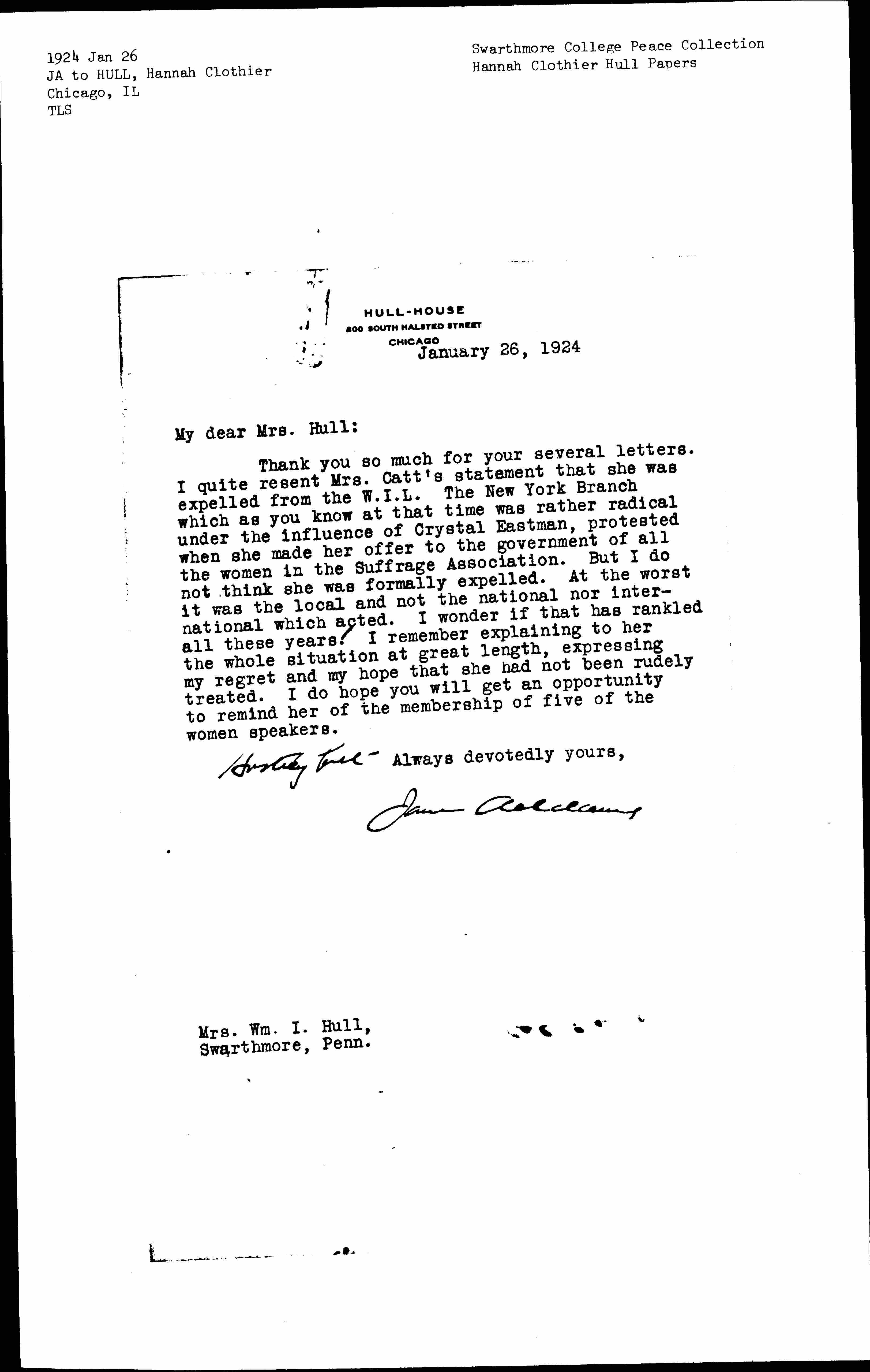 Thank you so much for your several letters. I quite resent Mrs. Catt's statement that she was expelled from the W.I.L. The New York Branch which as you know at that time was rather radical under the influence of Crystal Eastman, protested when she made her offer to the government of all the women in the Suffrage Association. But I do not think she was formally expelled. At the worst it was the local and not the national nor international which acted. I wonder if that has rankled all these years! I remember explaining to her the whole situation at great length, expressing my regret and my hope that she had not been rudely treated. I do hope you will get an opportunity to remind her of the membership of five of the women speakers.